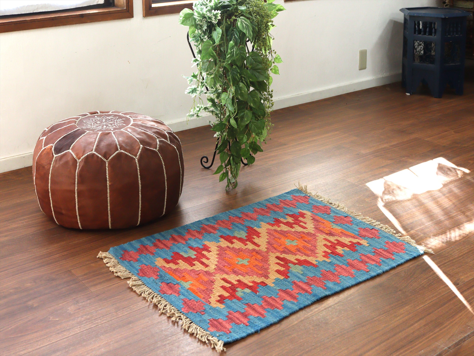 6-7mm程度の厚みがあり、パイル(毛足)がない平織りの敷物で表面は少しザラっとした肌ざわりです。織り手の自由なアイデアでデザインされていますので、左右対象でなかったり、モチーフが少しずれていたりということもありますが、世界で一枚だけの作品ですからその点はご了承ください。