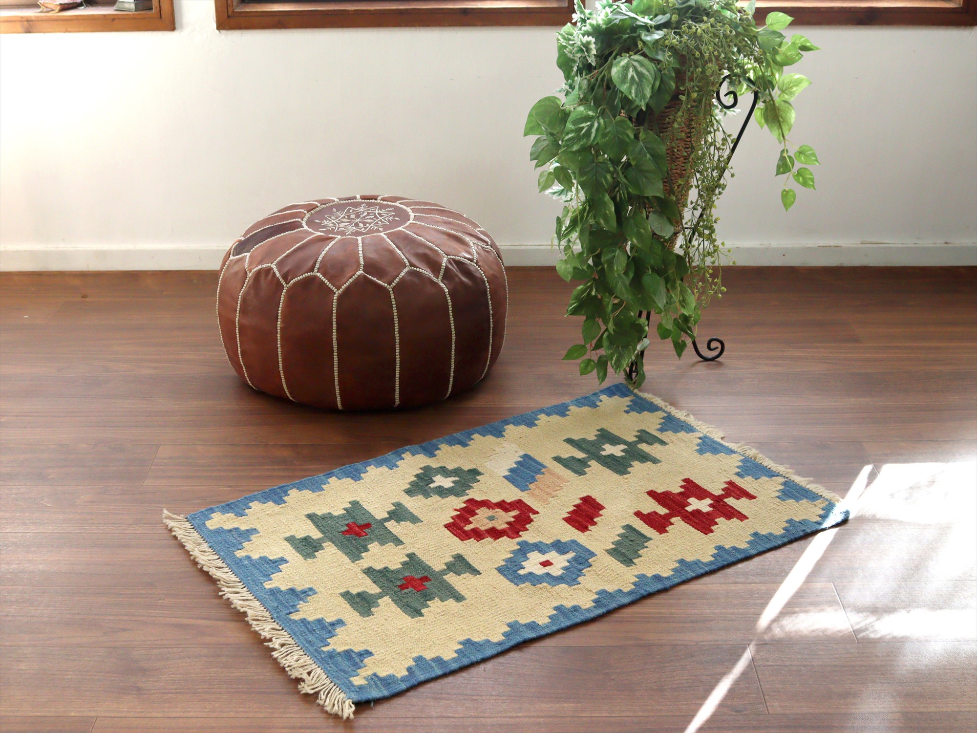 6-7mm程度の厚みがあり、パイル(毛足)がない平織りの敷物で表面は少しザラっとした肌ざわりです。織り手の自由なアイデアでデザインされていますので、左右対象でなかったり、モチーフが少しずれていたりということもありますが、世界で一枚だけの作品ですからその点はご了承ください。