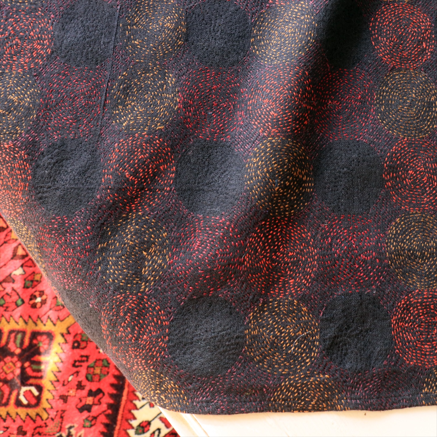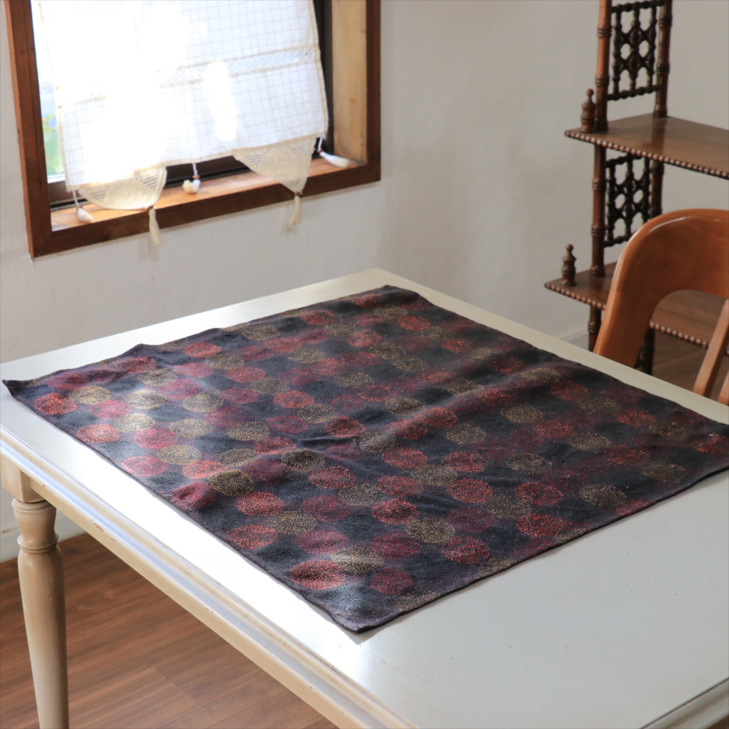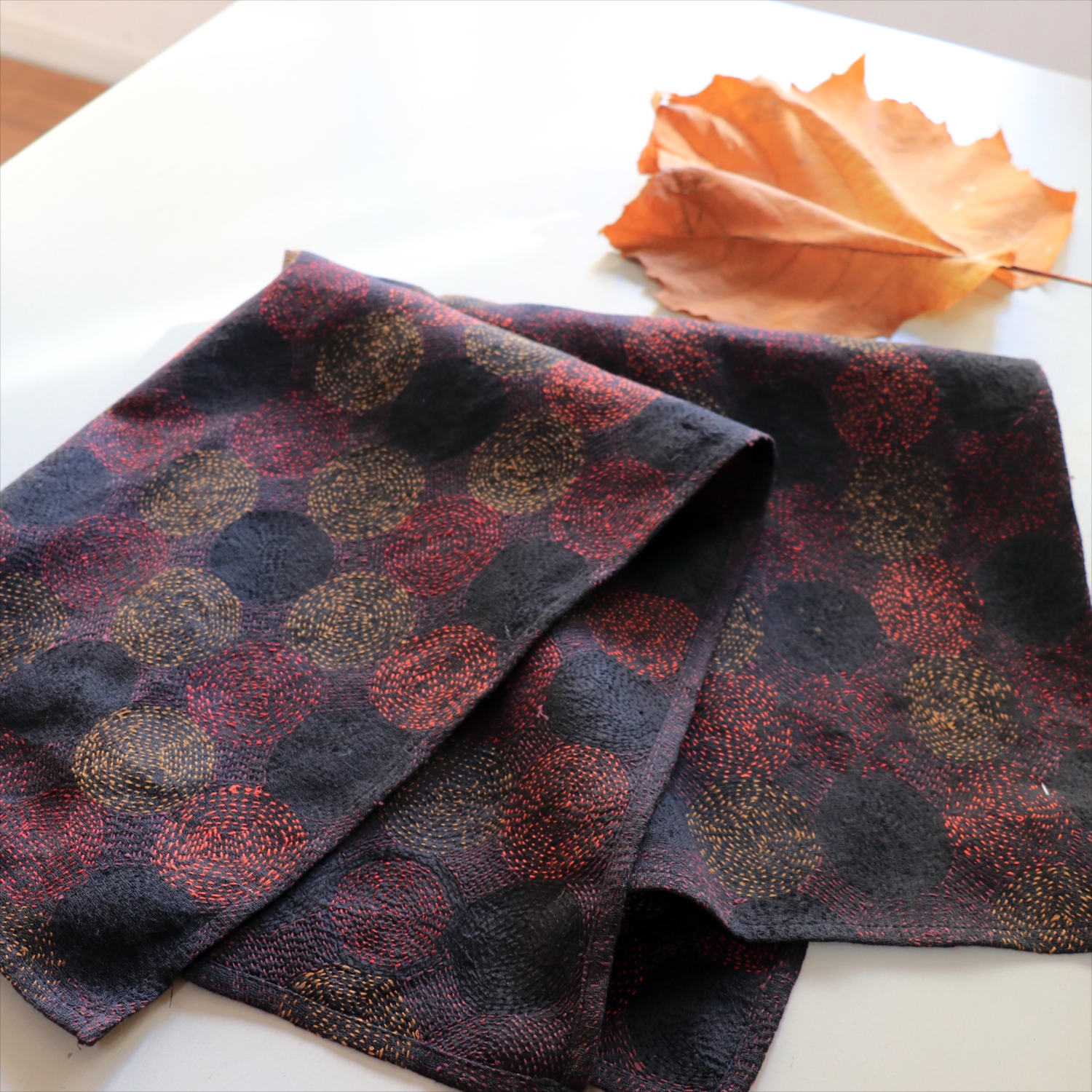 細かな刺し子ステッチが施されたハンドメイドのシルククロス。インド北部ベンガル地方の伝統的な技法をアレンジしたもので、カンタ刺繍と呼ばれます。サークルモチーフはシンプルながらも、熟練した職人のみが手がける上級テクニックということで、正確な針の運びが見て取れます。手仕事の粋を楽しめる逸品です。