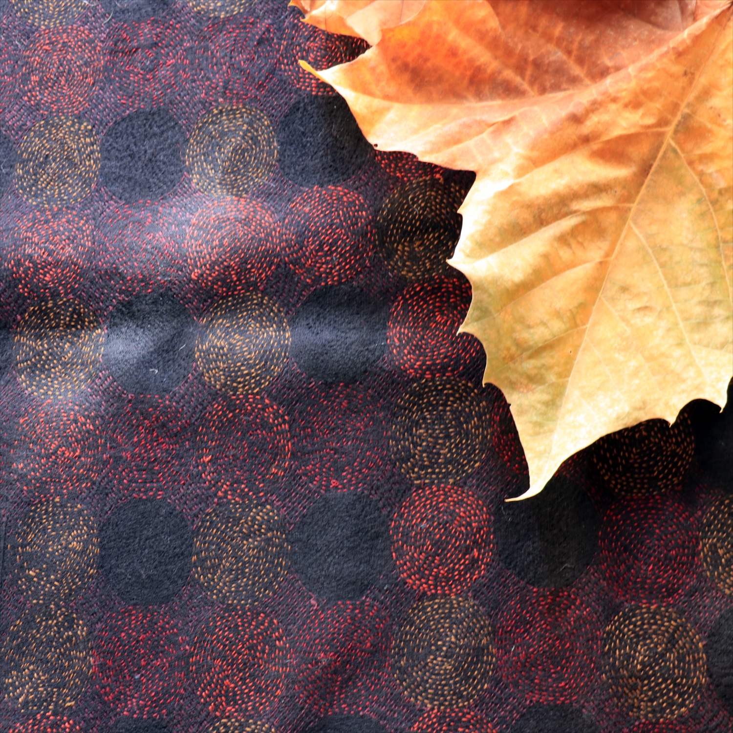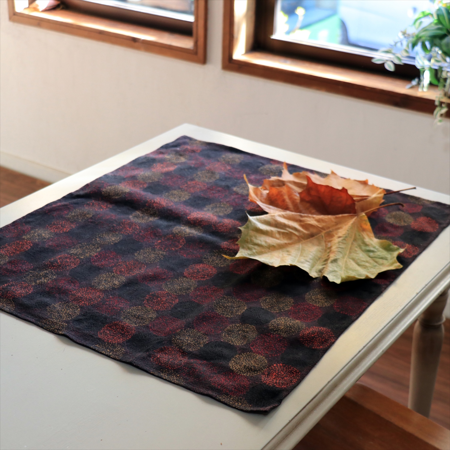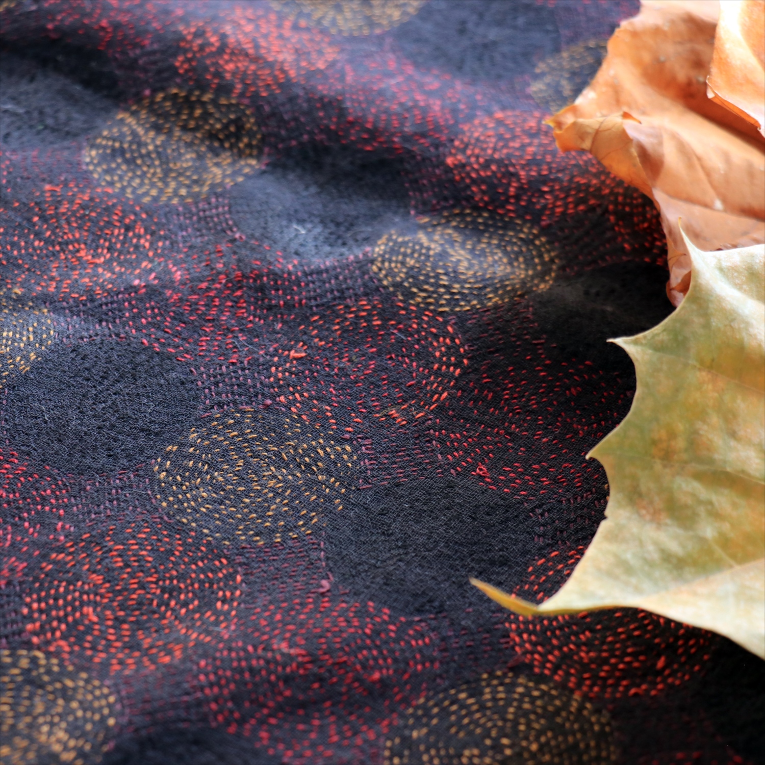 細かな刺し子ステッチが施されたハンドメイドのシルククロス。インド北部ベンガル地方の伝統的な技法をアレンジしたもので、カンタ刺繍と呼ばれます。サークルモチーフはシンプルながらも、熟練した職人のみが手がける上級テクニックということで、正確な針の運びが見て取れます。手仕事の粋を楽しめる逸品です。