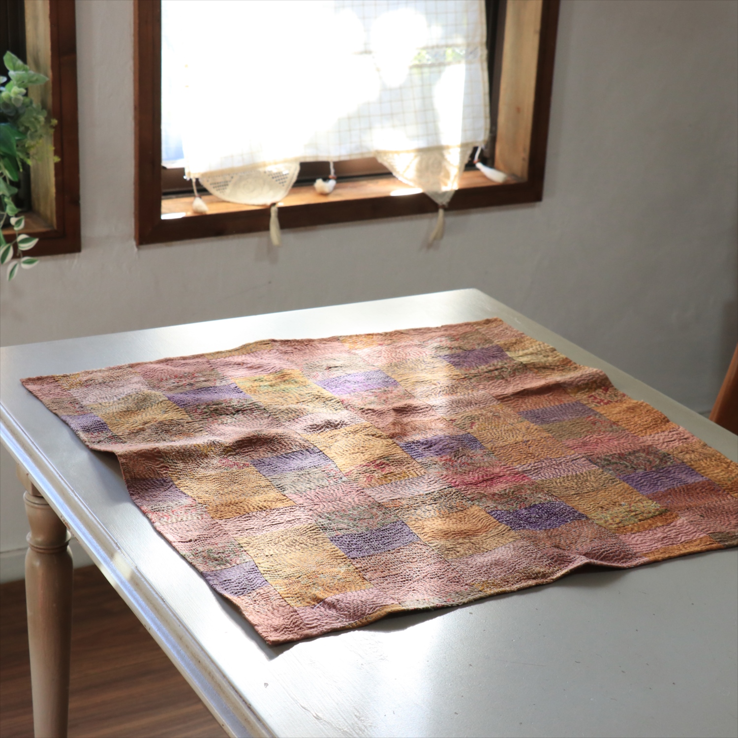 シルクのパッチワーク地に、丸いかたちの刺し子を施したカンタ刺繍の布です。ベースはサリー(女性の衣装)のリサイクルで、数種類の違う布を5cmくらいにカットして、それらを縫い合わせてつくられています。そしてその上から、使いやすく強度を増すためにコットンの糸で刺し子がほどこされています。細かなステッチを全面に施し、手間を惜しまず、根気よく針を進めて作られた布です。裏面は別のサリーの生地を貼り合わせてあり、両面別のイメージでどちらも使えます。