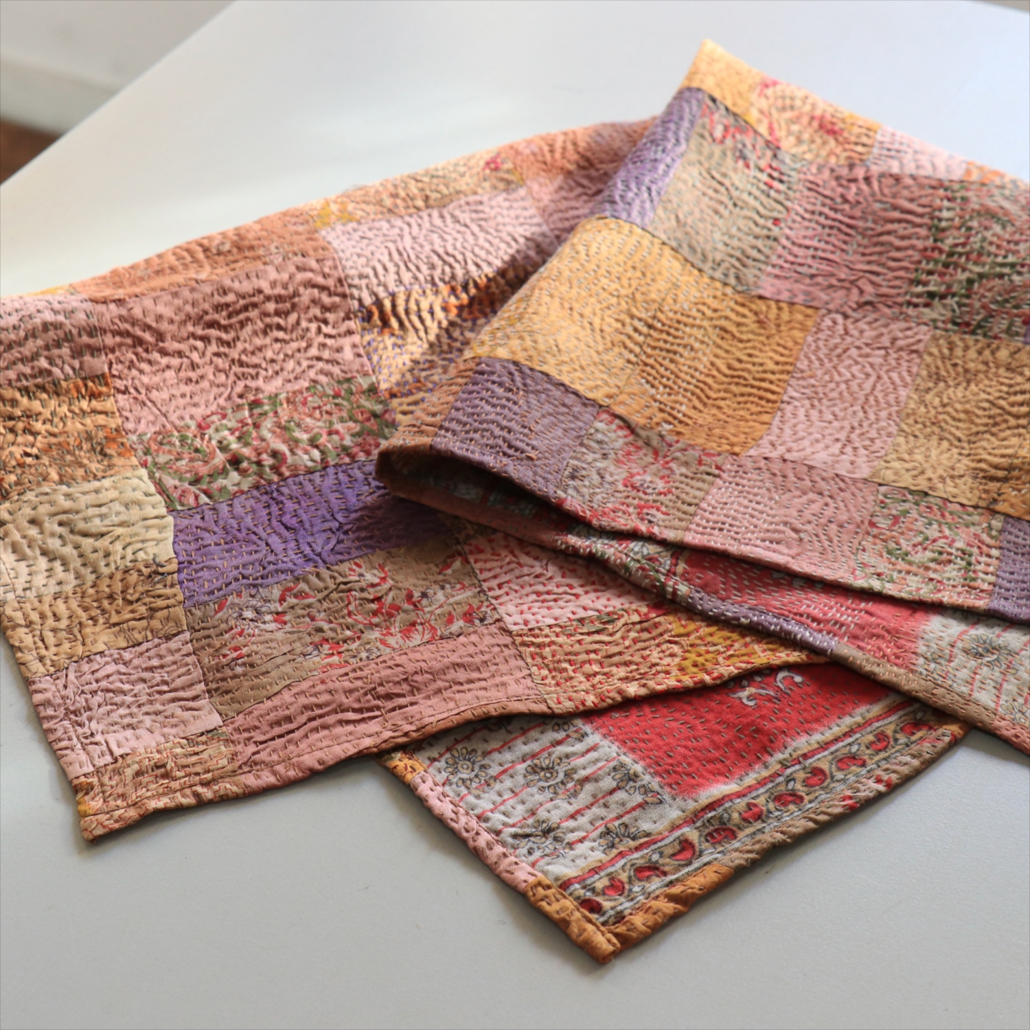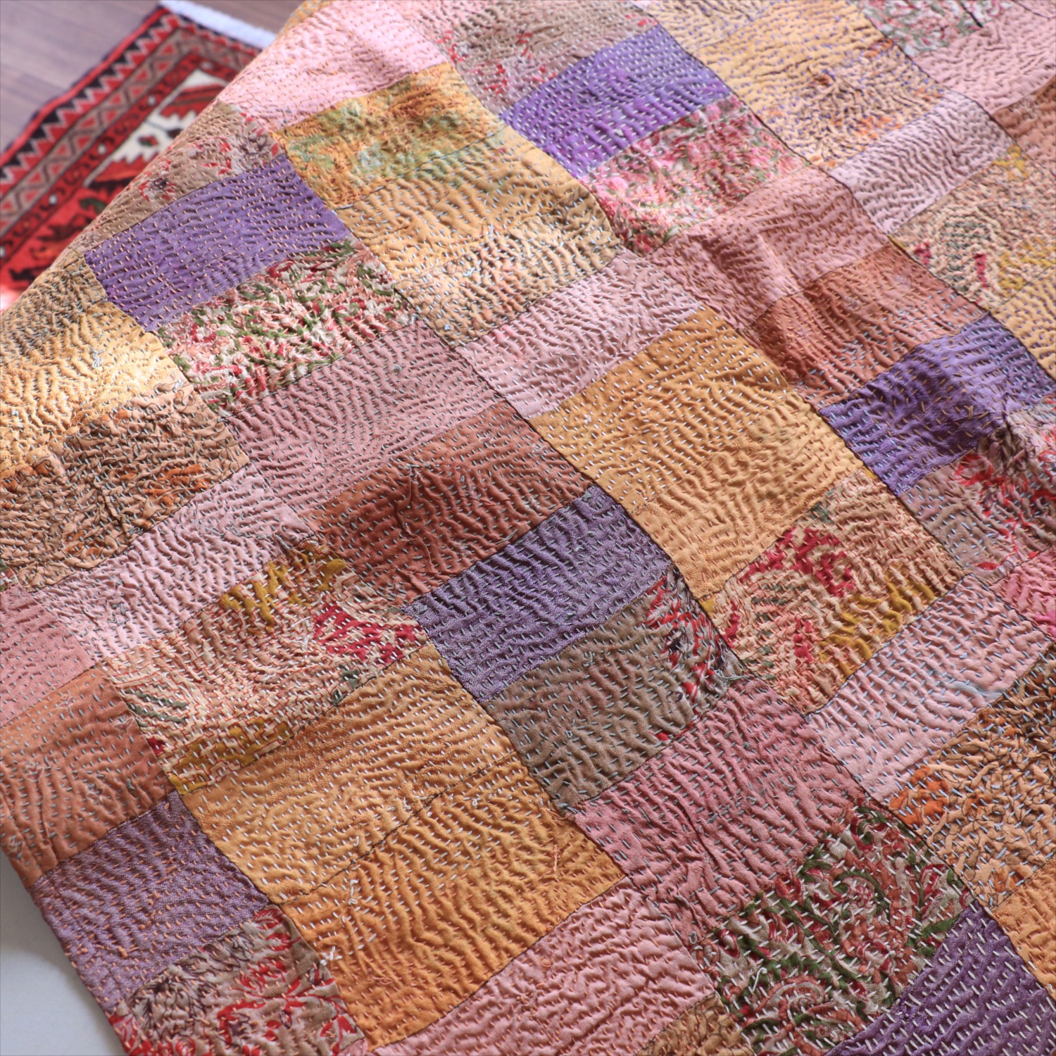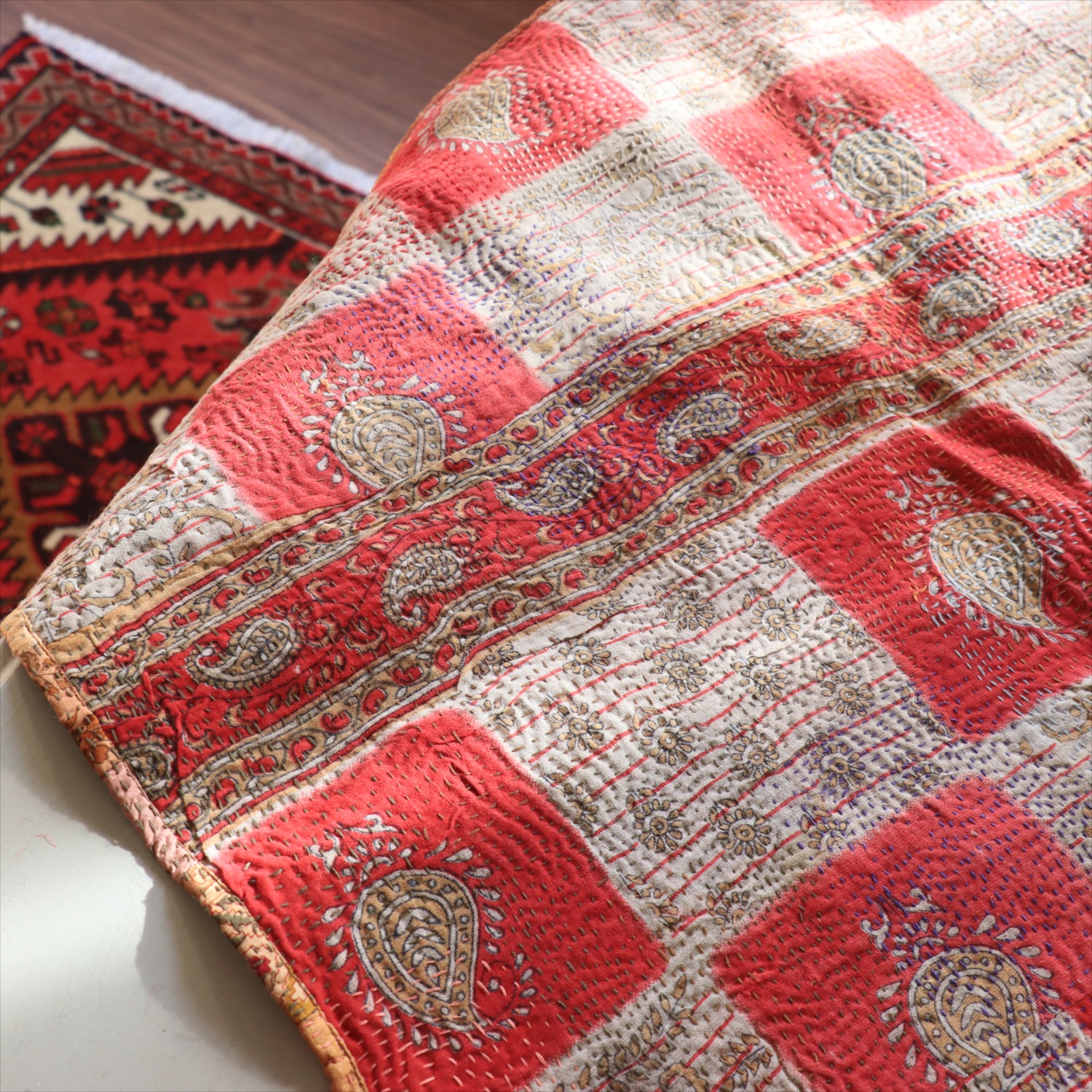 インド東部からバングラディシュにわたるベンガル地方で、古くから伝統的に作られてきた刺繍布。伝統的なものは、刺繍をするベースに古布が用いられ、ランニングステッチ(日本の刺し子に近い)で、シンプルなラインや時には小さなモチーフが表現されています。作られた布は、掛け布団(キルト加工がされる)、ショール、鏡カバー、その他生活の様々な道具として使われました。