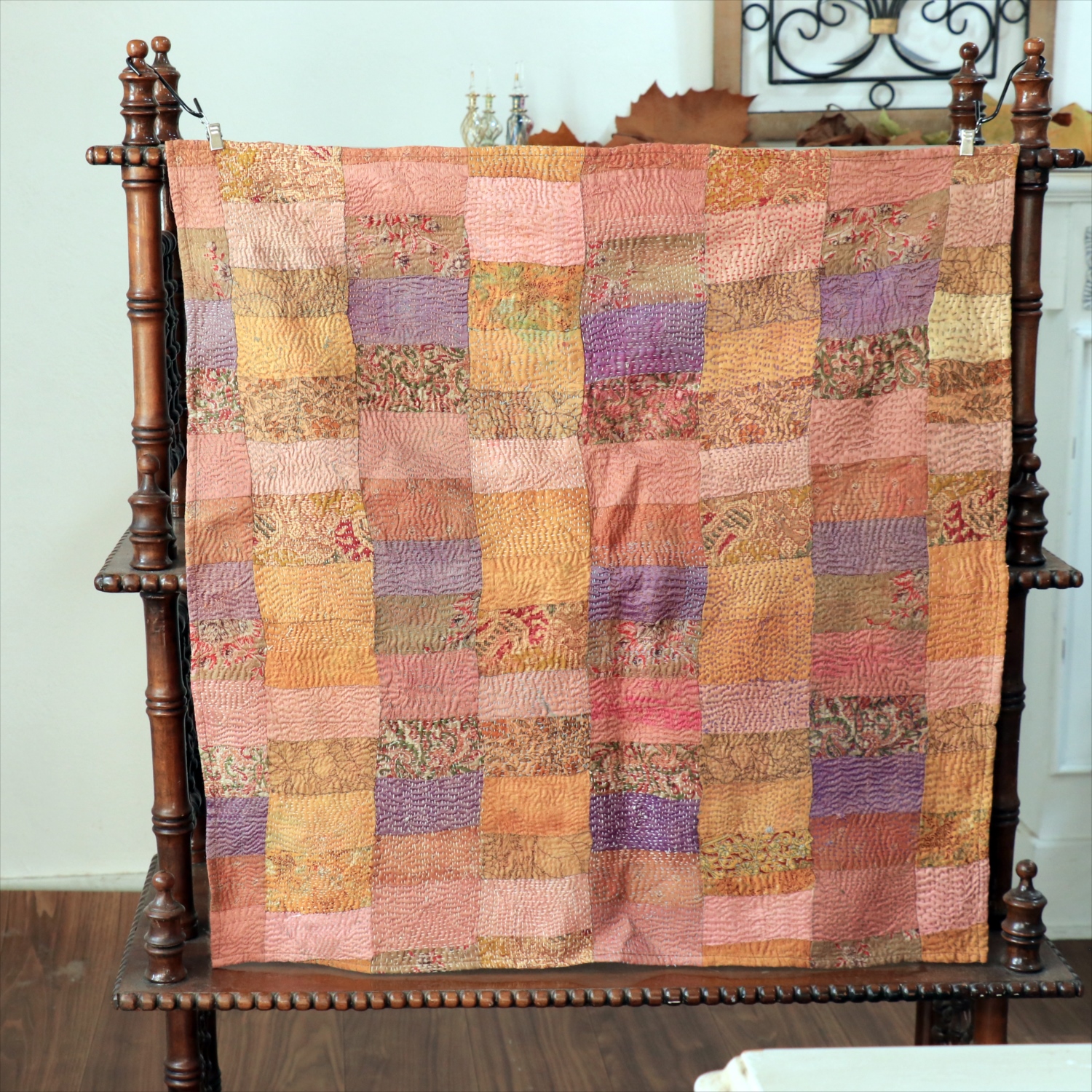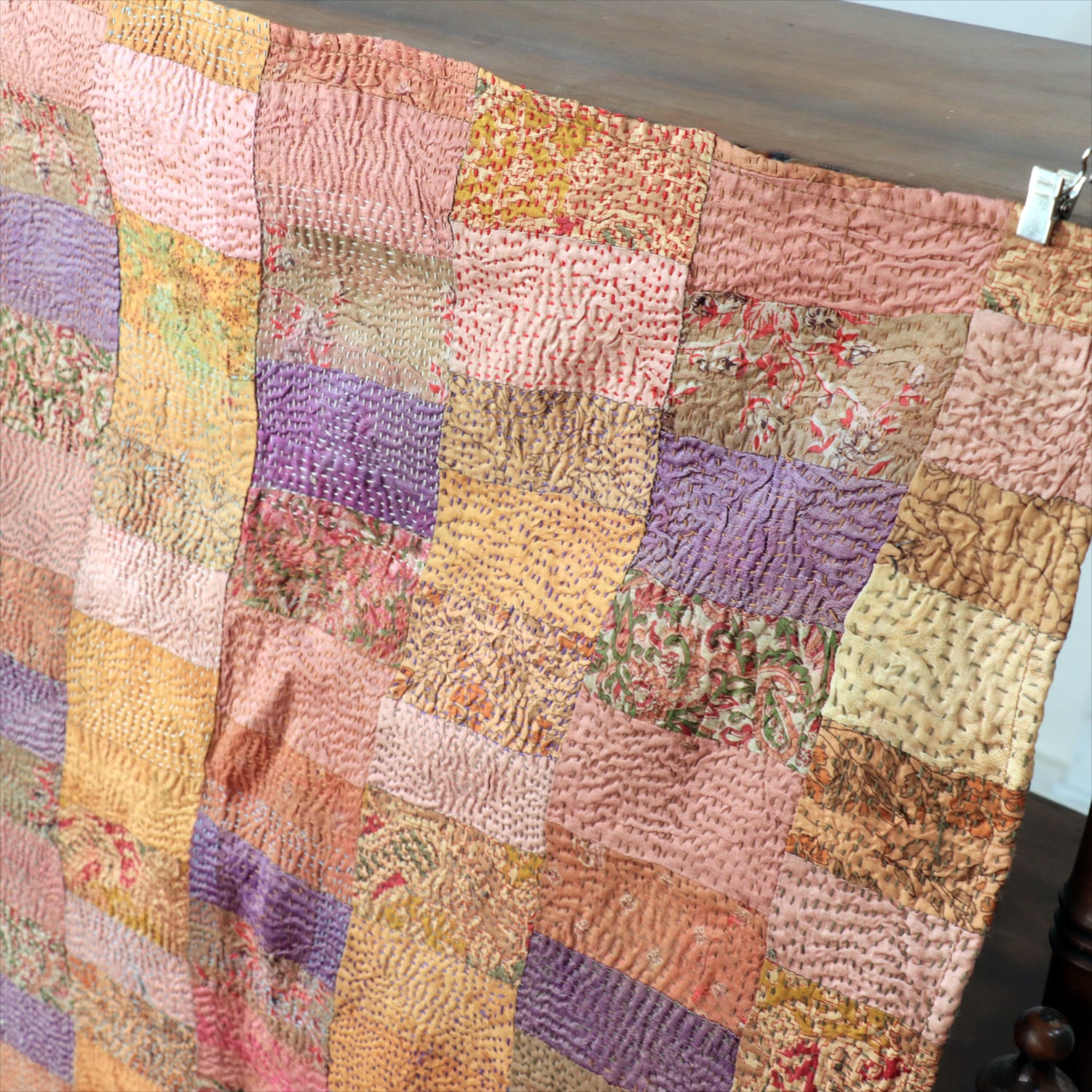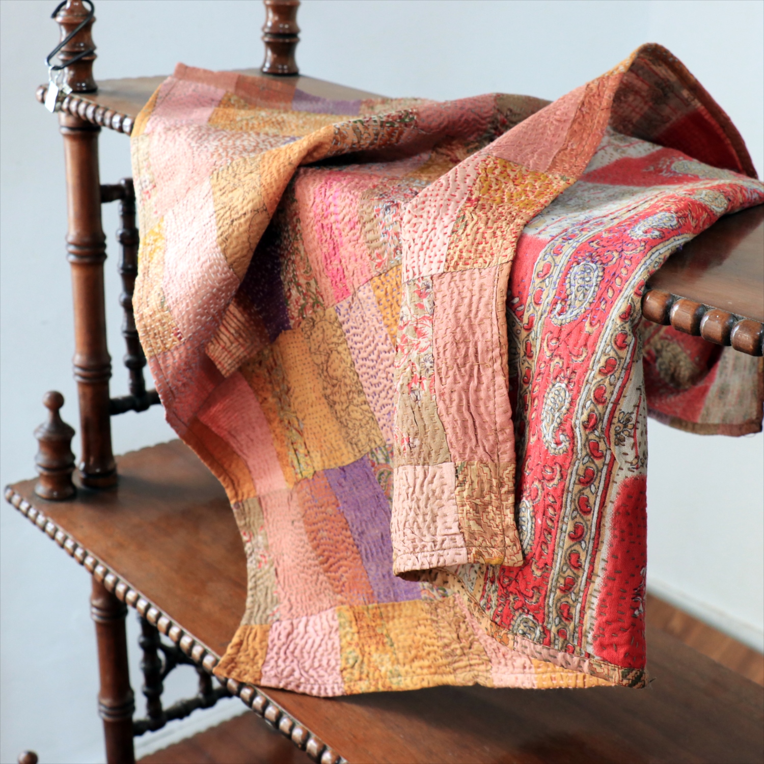 インド東部からバングラディシュにわたるベンガル地方で、古くから伝統的に作られてきた刺繍布。伝統的なものは、刺繍をするベースに古布が用いられ、ランニングステッチ(日本の刺し子に近い)で、シンプルなラインや時には小さなモチーフが表現されています。作られた布は、掛け布団(キルト加工がされる)、ショール、鏡カバー、その他生活の様々な道具として使われました。