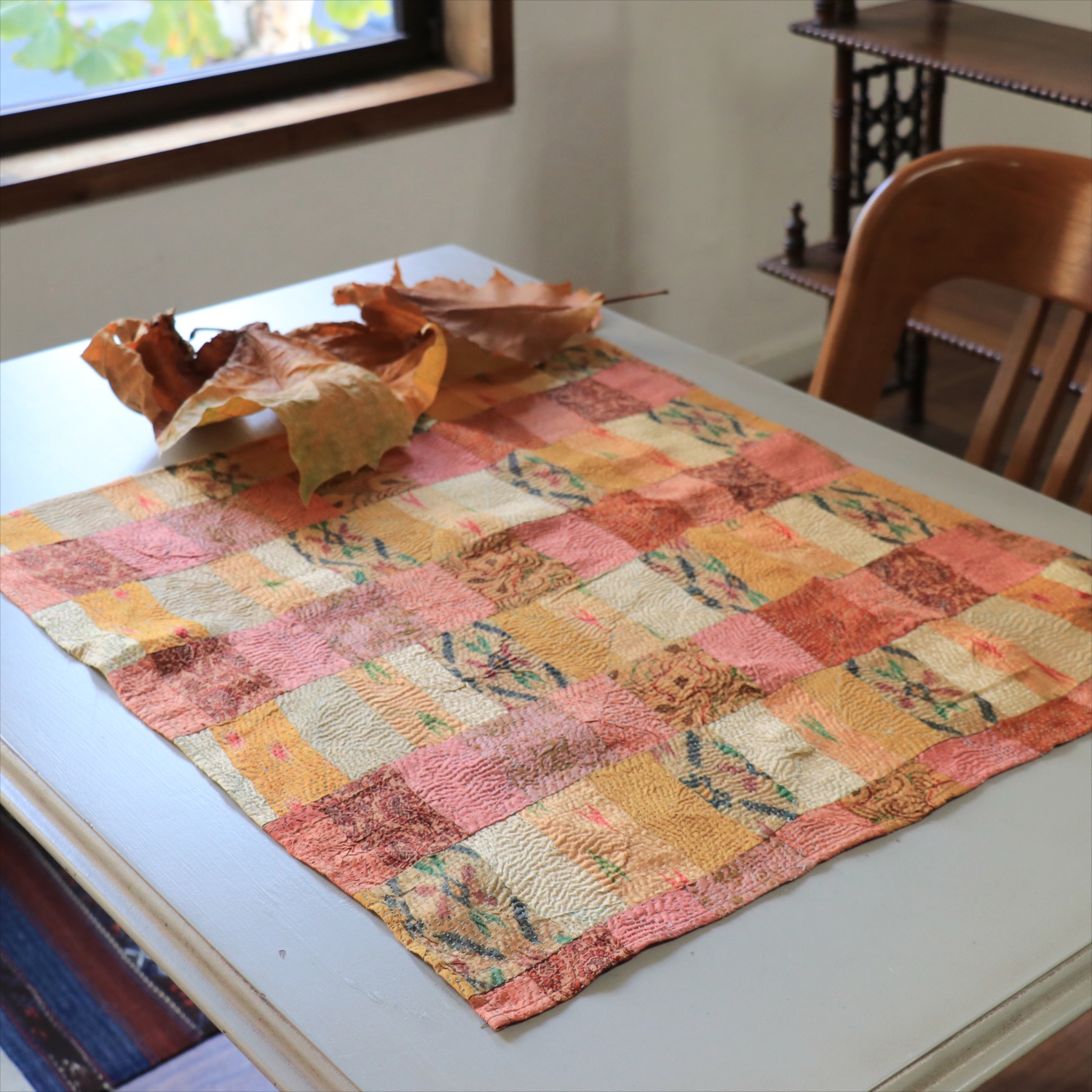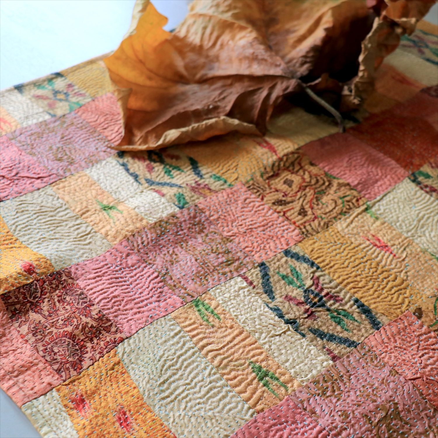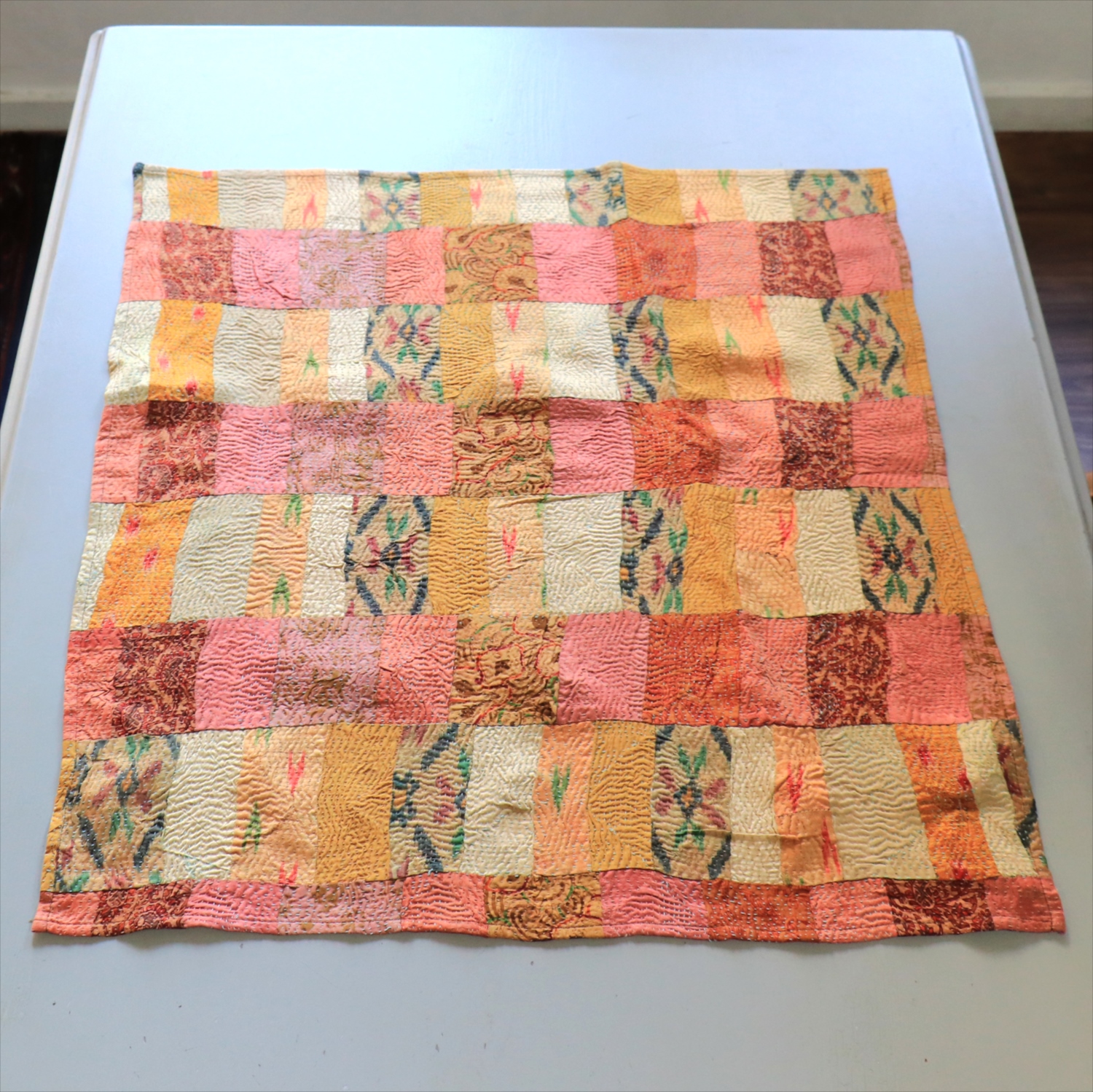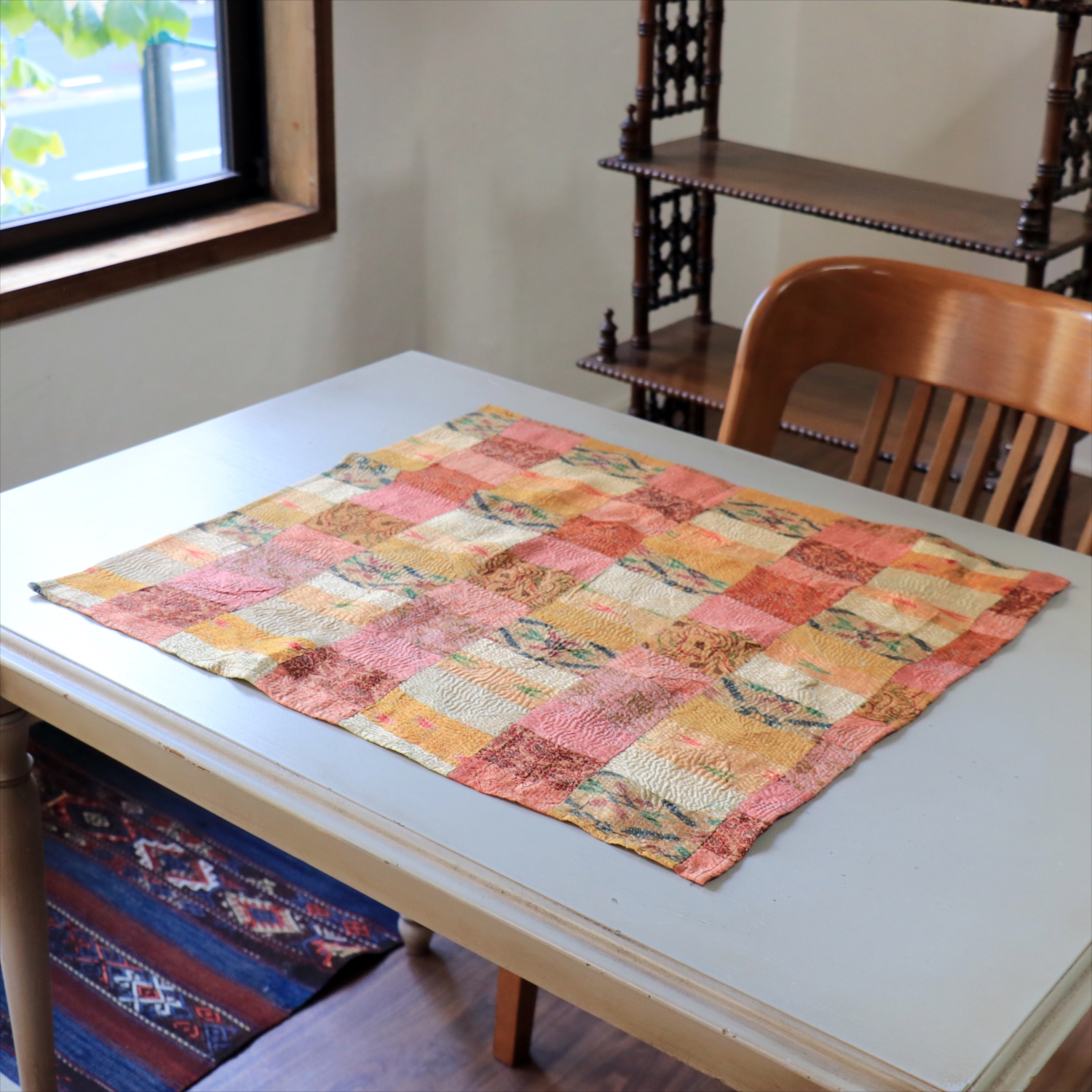 シルクのパッチワーク地に、丸いかたちの刺し子を施したカンタ刺繍の布です。ベースはサリー(女性の衣装)のリサイクルで、数種類の違う布を5cmくらいにカットして、それらを縫い合わせてつくられています。そしてその上から、使いやすく強度を増すためにコットンの糸で刺し子がほどこされています。細かなステッチを全面に施し、手間を惜しまず、根気よく針を進めて作られた布です。裏面は別のサリーの生地を貼り合わせてあり、両面別のイメージでどちらも使えます。