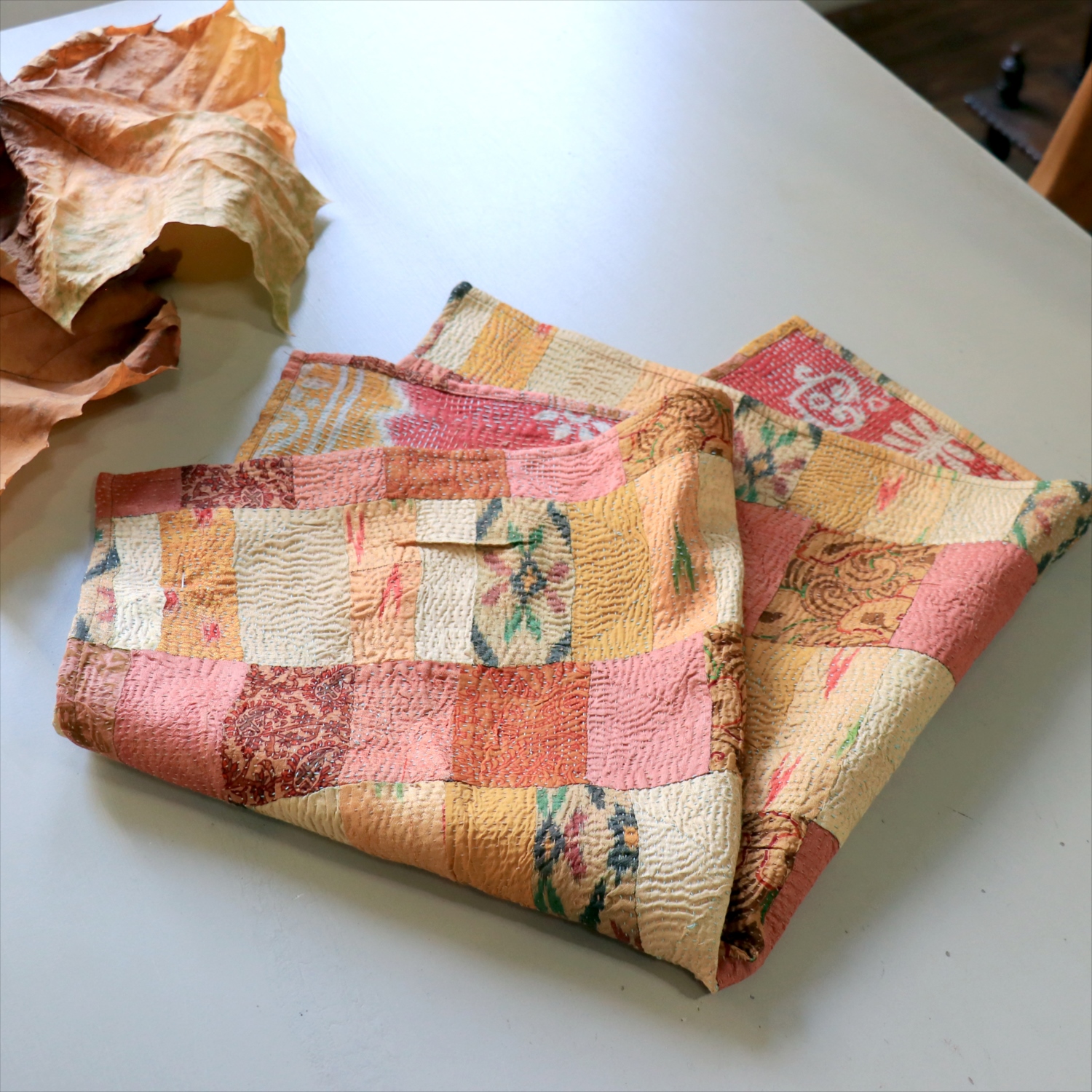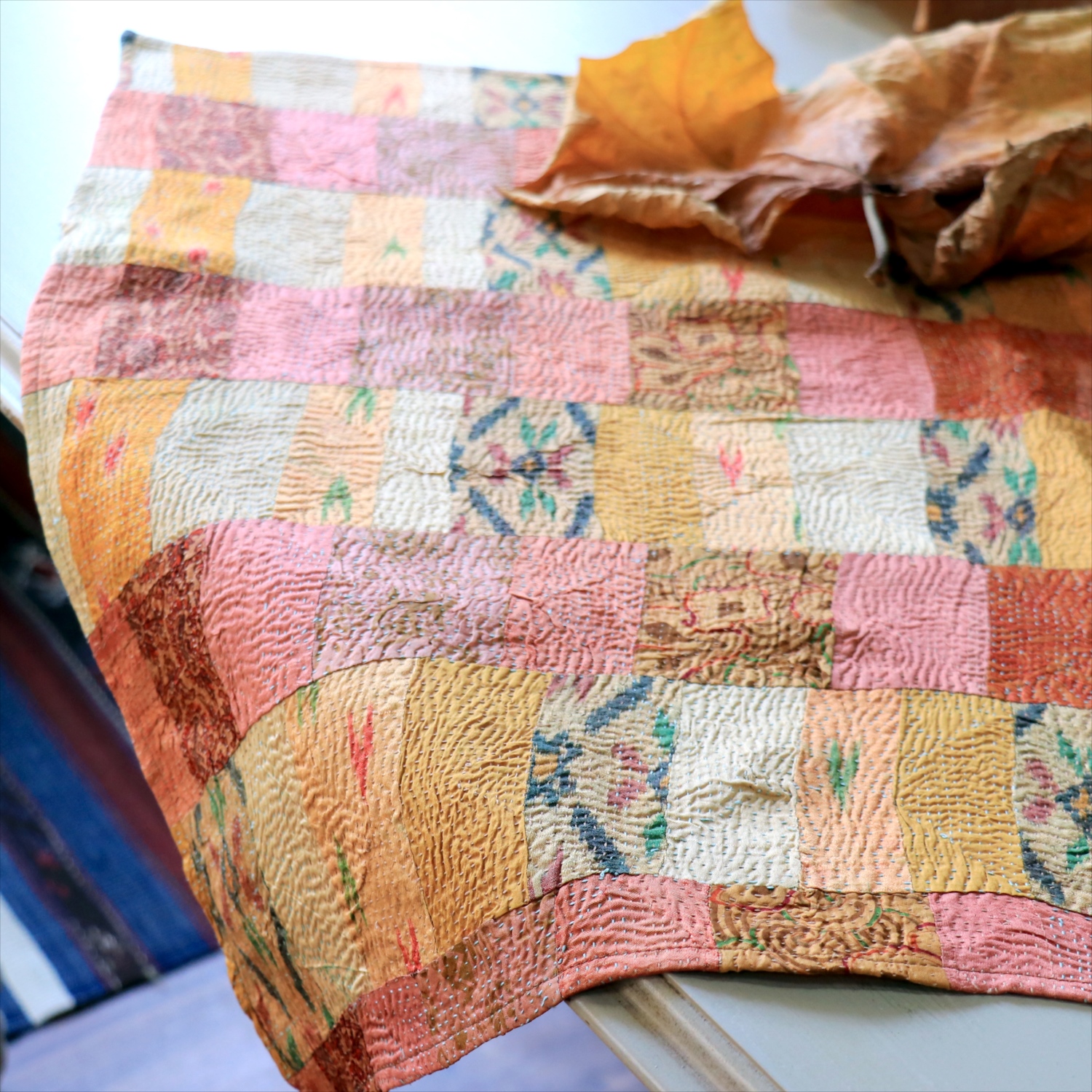 インド東部からバングラディシュにわたるベンガル地方で、古くから伝統的に作られてきた刺繍布。伝統的なものは、刺繍をするベースに古布が用いられ、ランニングステッチ(日本の刺し子に近い)で、シンプルなラインや時には小さなモチーフが表現されています。作られた布は、掛け布団(キルト加工がされる)、ショール、鏡カバー、その他生活の様々な道具として使われました。