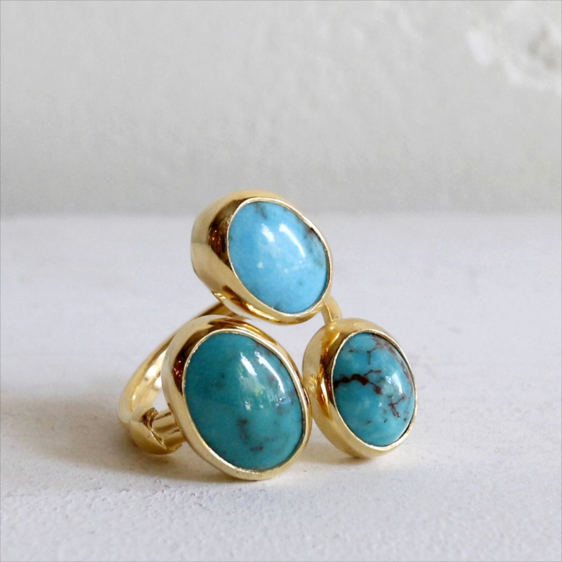 三つの色の違うマットなターコイズカラーを集めたユニークなデザインのリングです。それぞれの異なるターコイズの自然な色ムラや模様が色合いが、唯一無二の美しさを作ります。※大きいターコイズ1.5×1cm