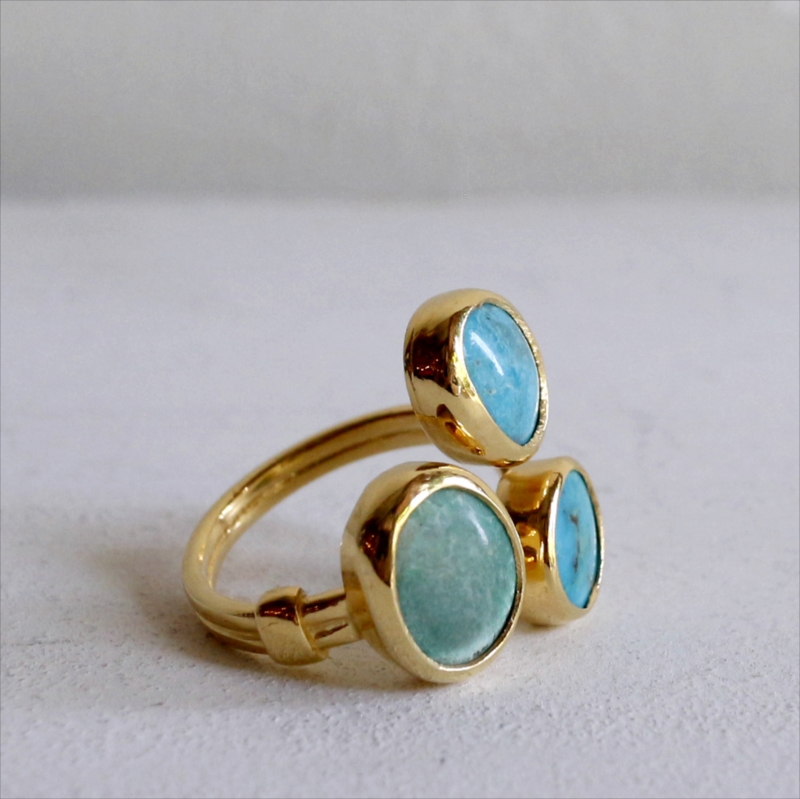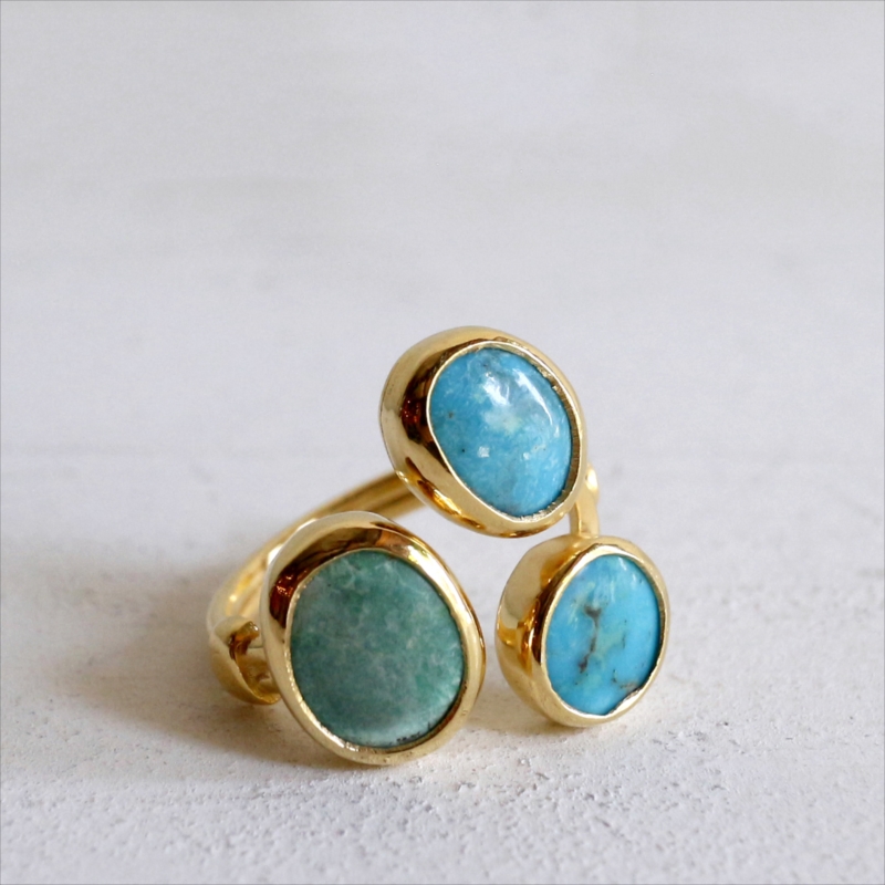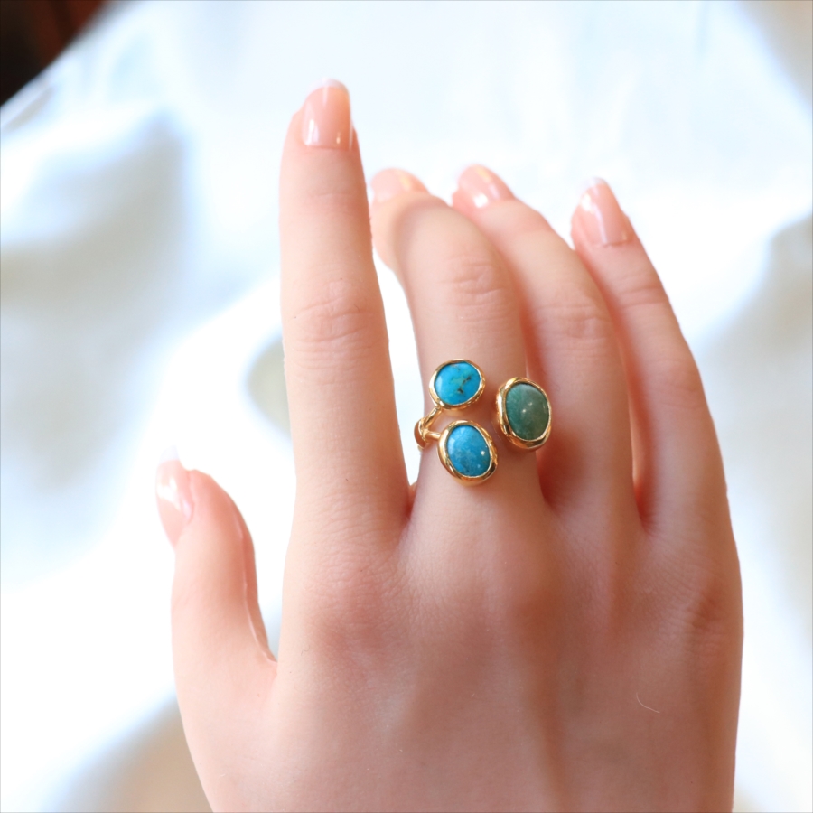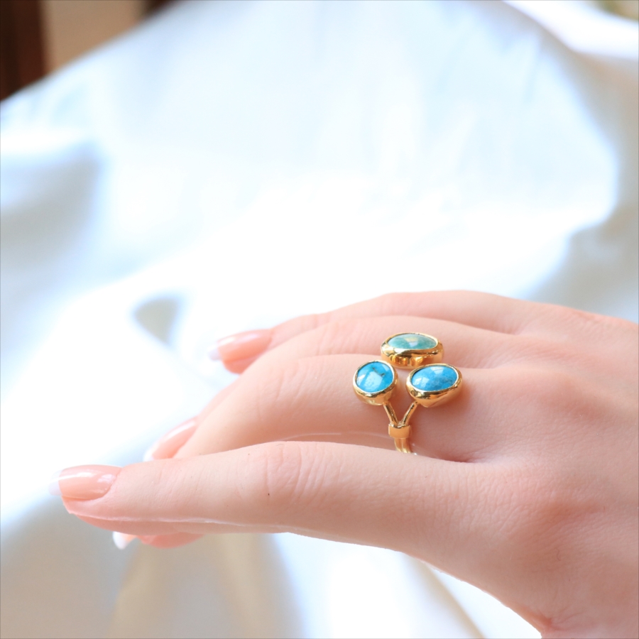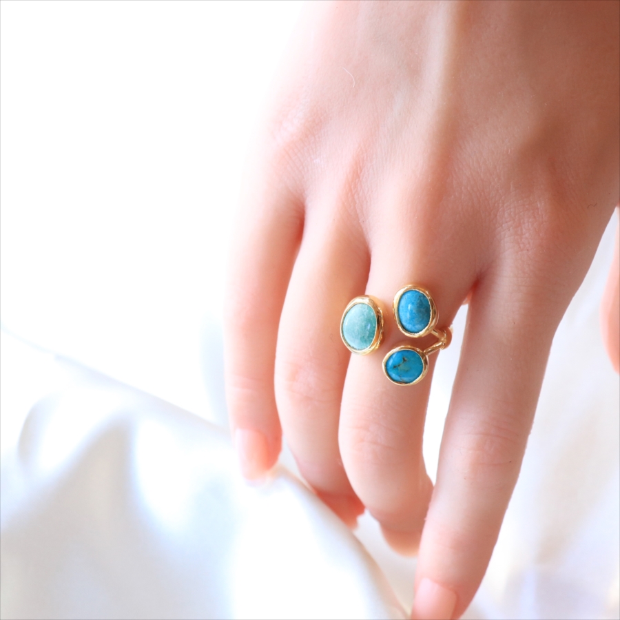 三つの色の違うマットなターコイズカラーを集めたユニークなデザインのリングです。それぞれの異なるターコイズの自然な色ムラや模様が色合いが、唯一無二の美しさを作ります。※大きいターコイズ1.2×1cm