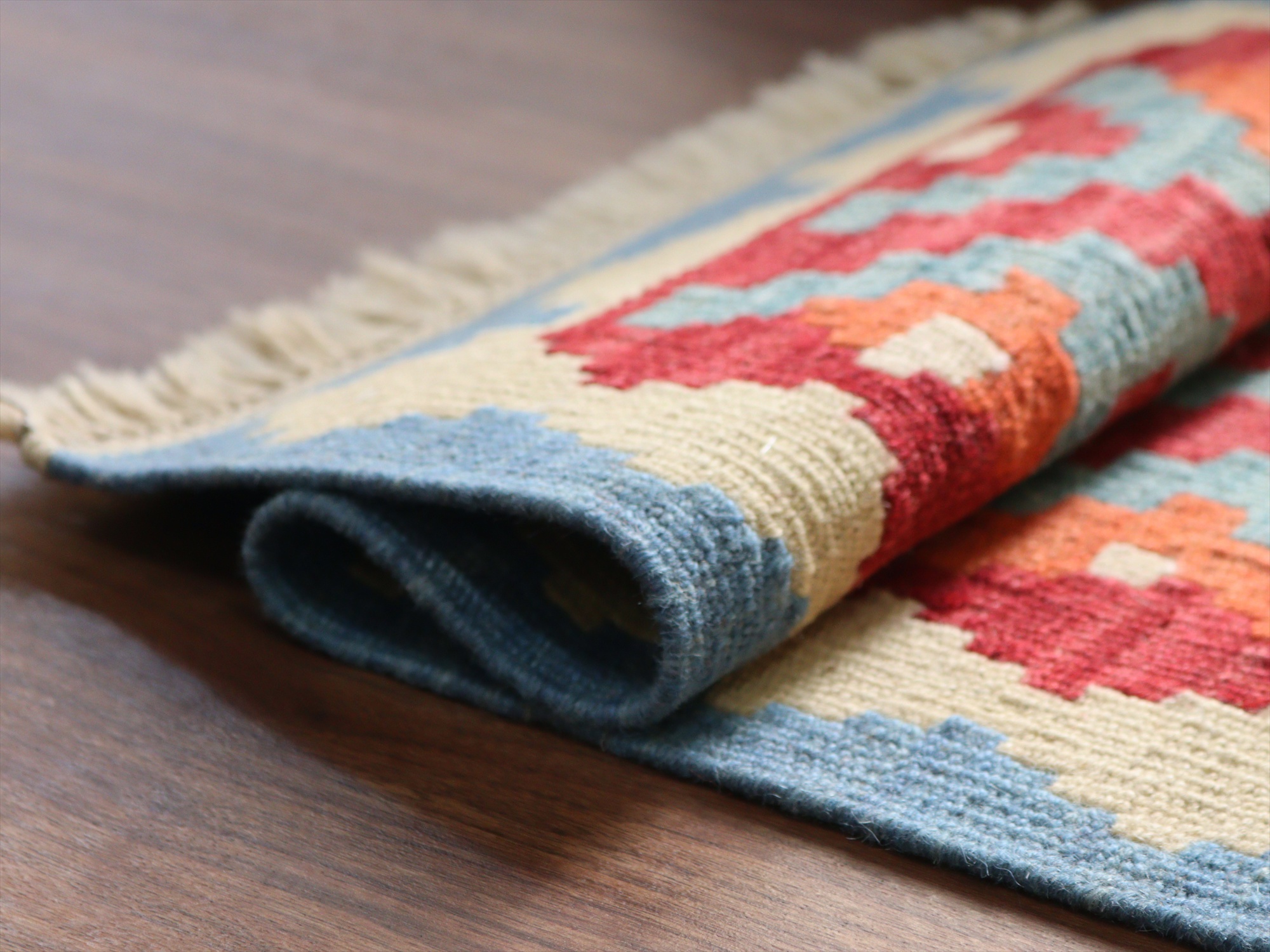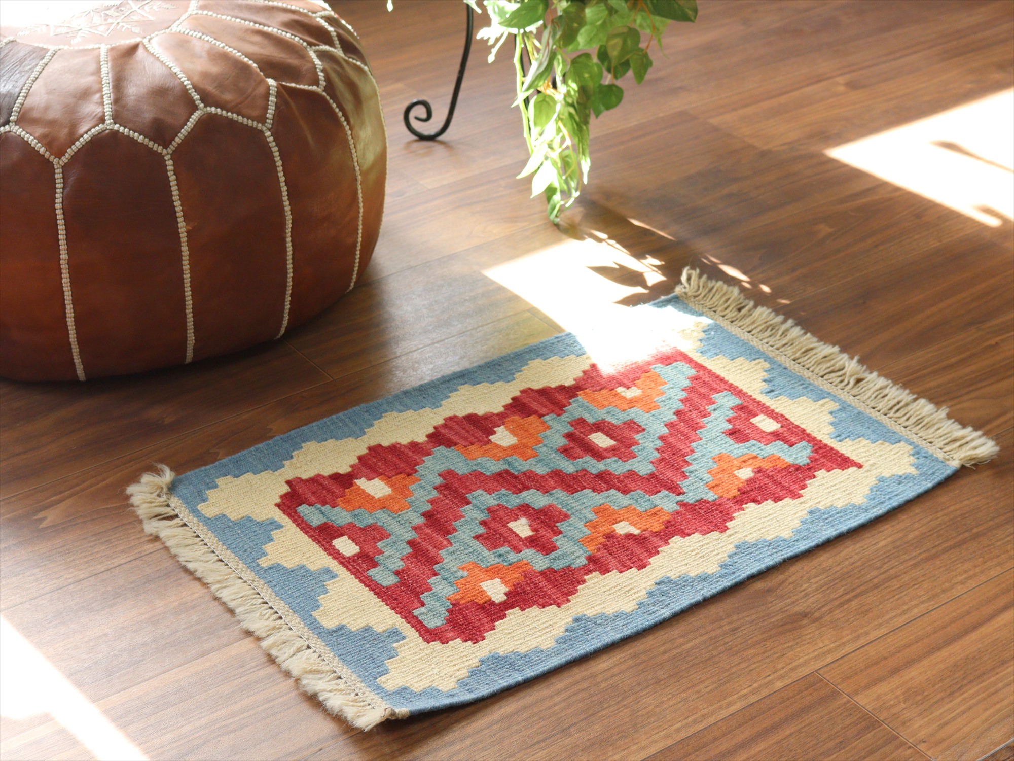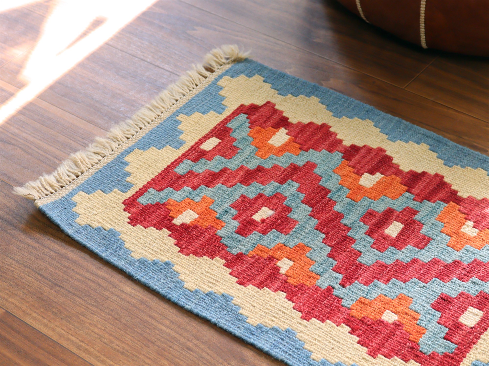 しっかりとしたハリのある織りで、厚みは4mm前後。多少カタチがゆがみがありますが、手織りキリムならではの味わいとご理解ください。