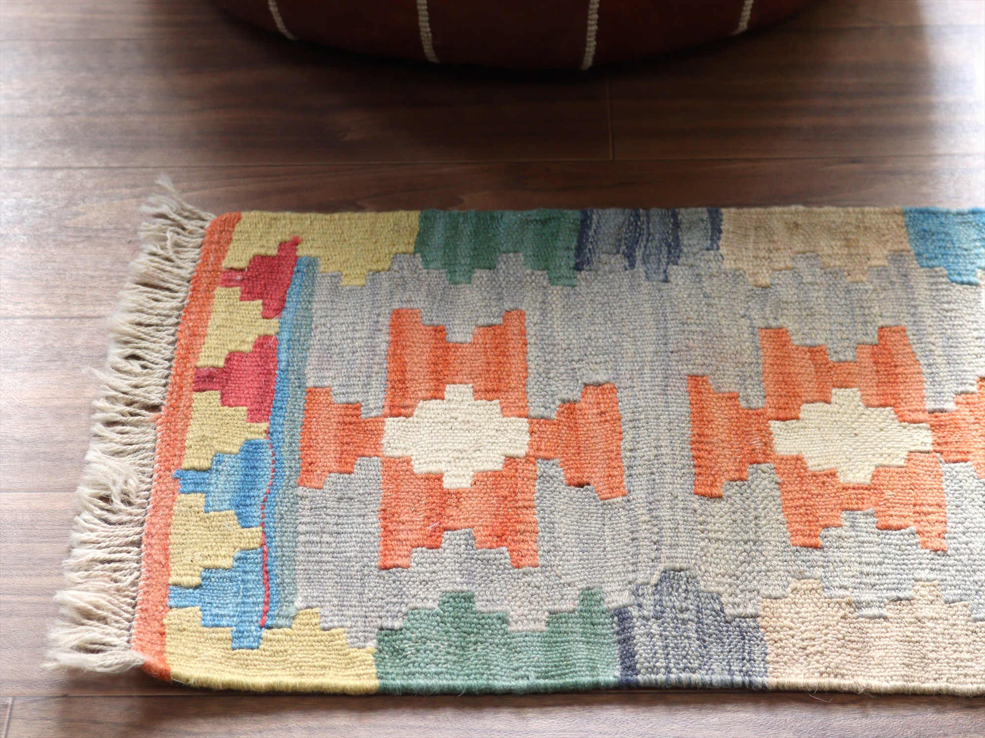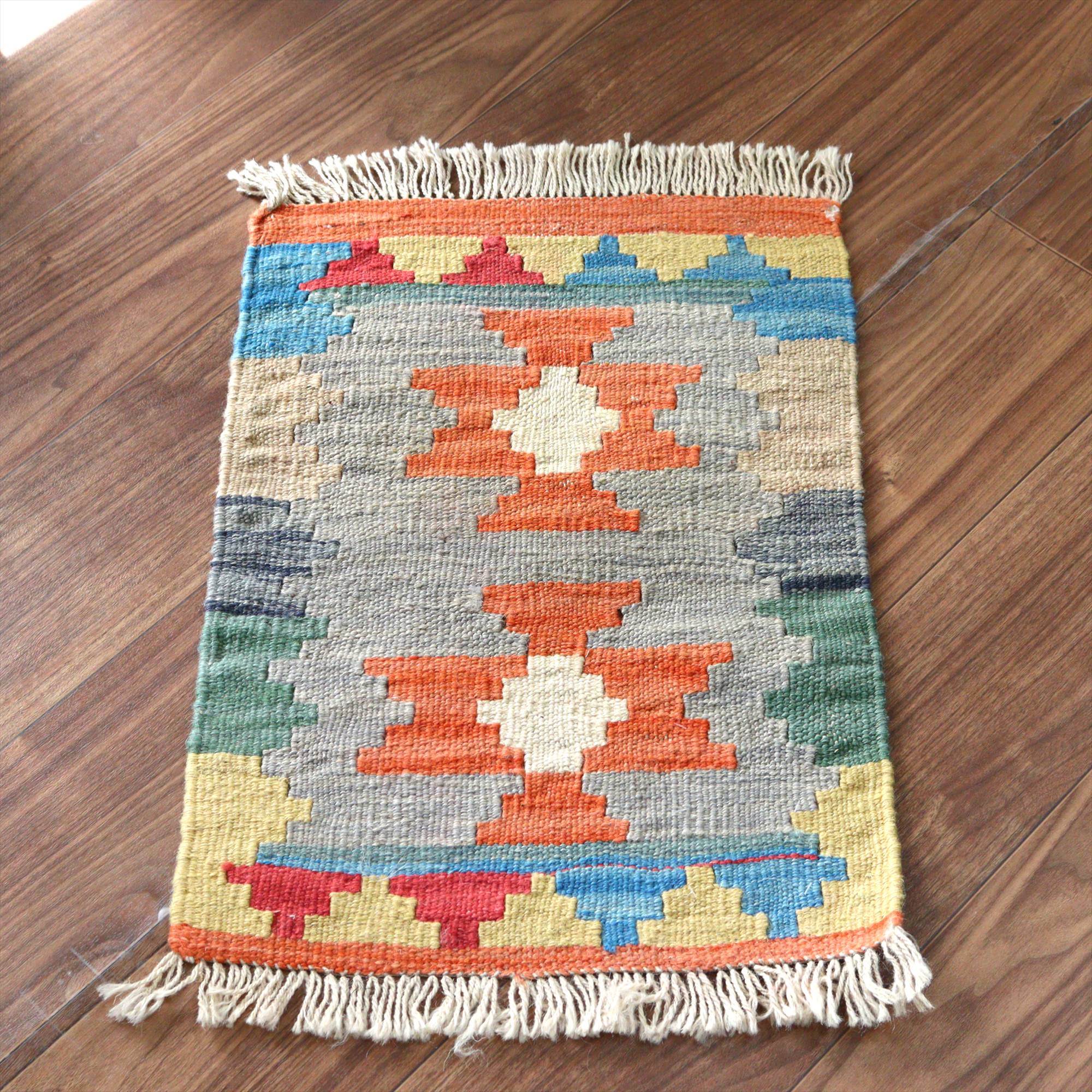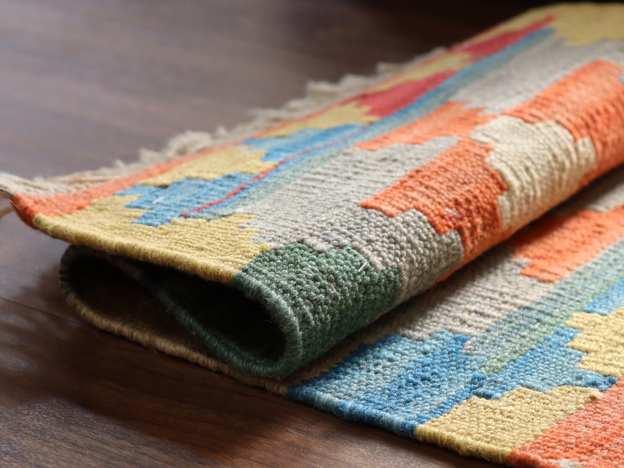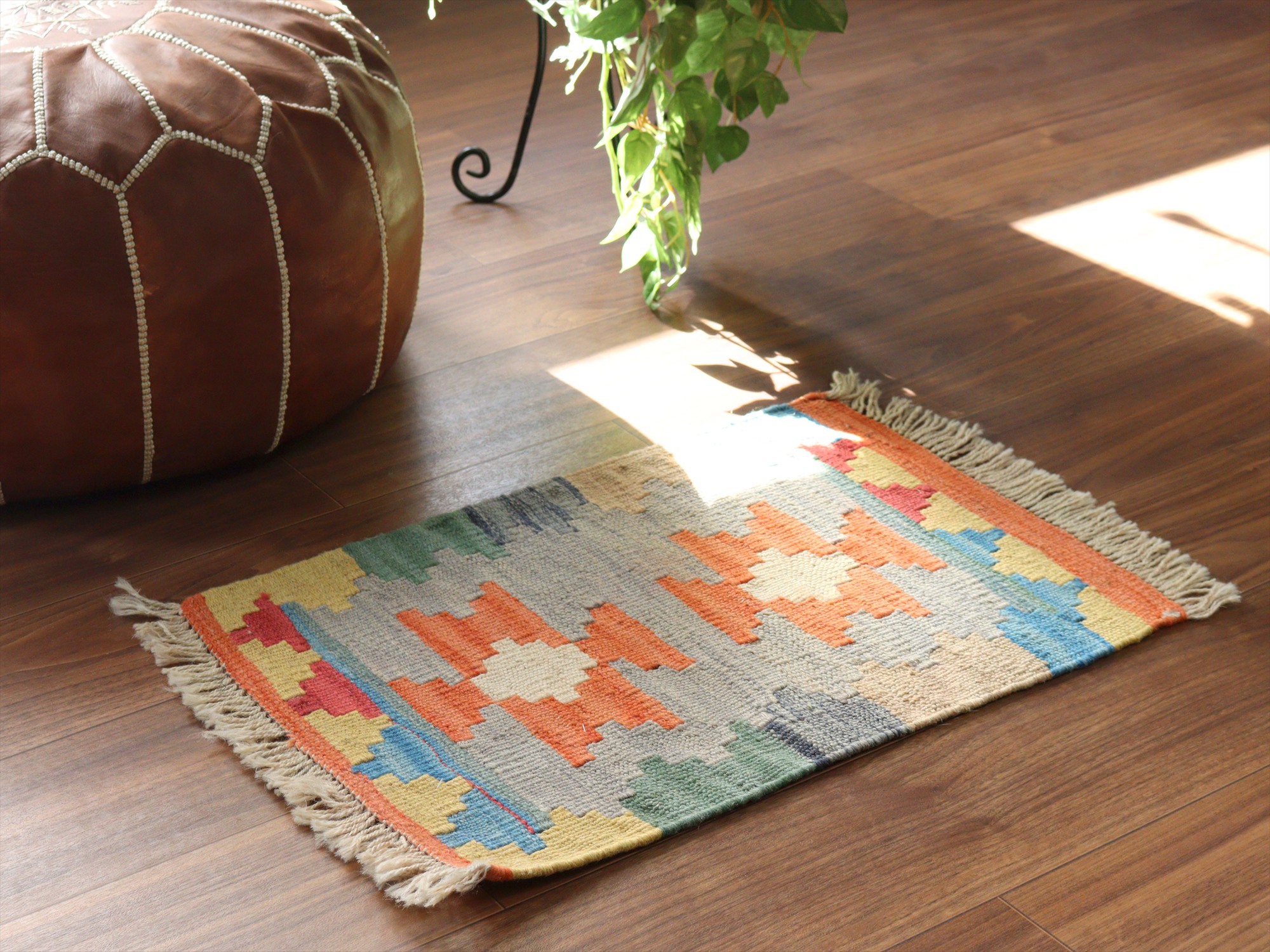 しっかりとしたハリのある織りで、厚みは4mm前後。多少カタチがゆがみがありますが、手織りキリムならではの味わいとご理解ください。