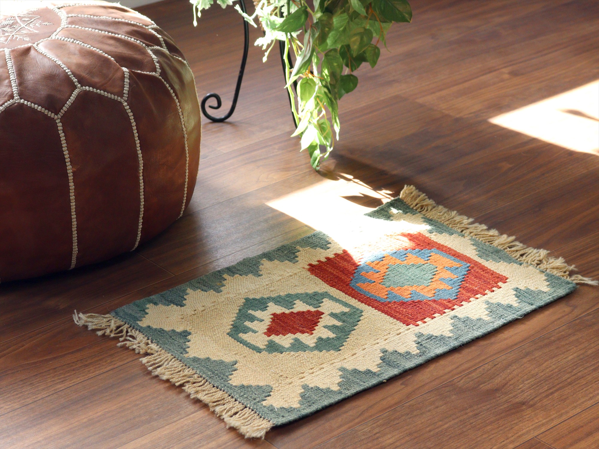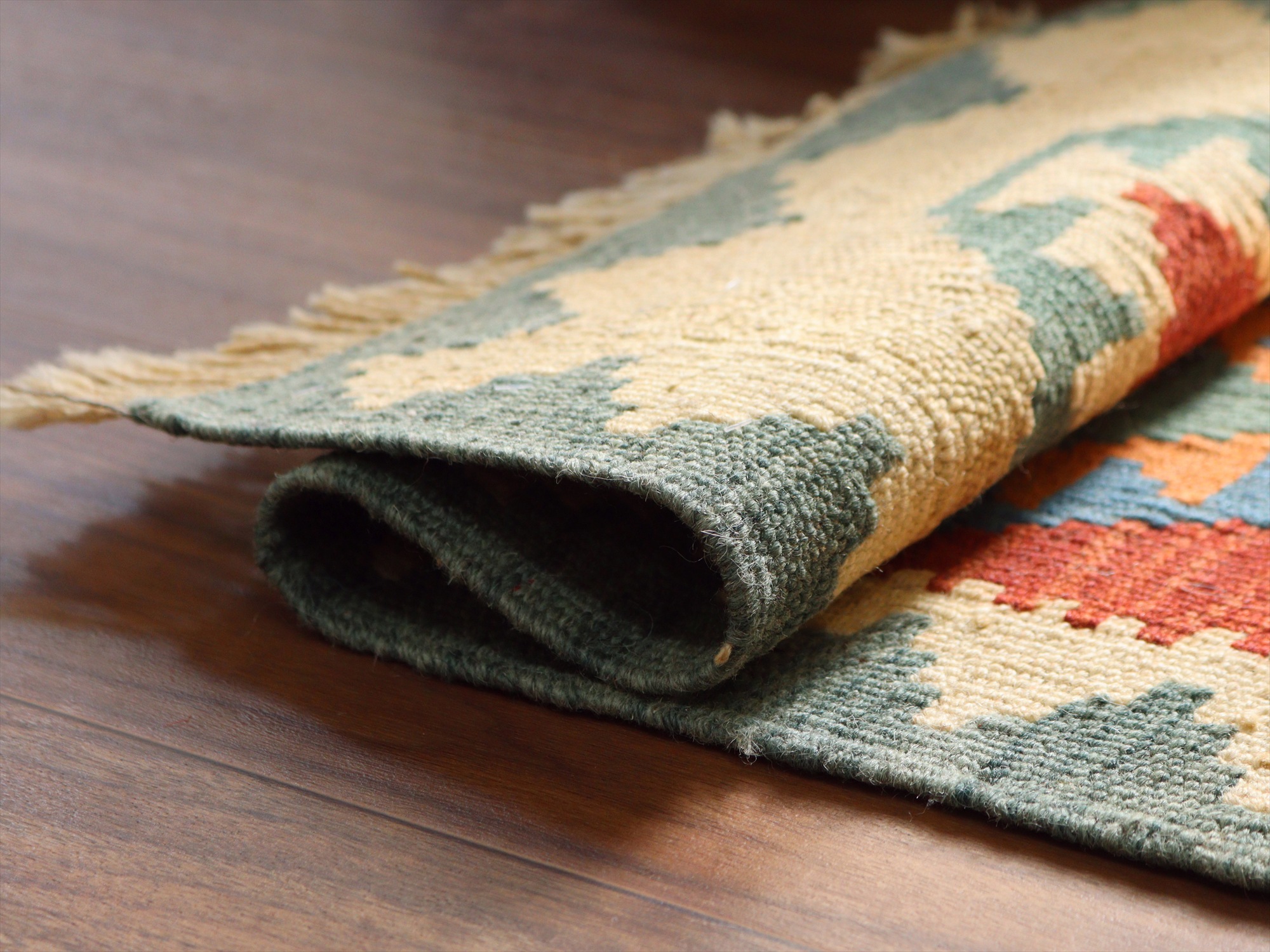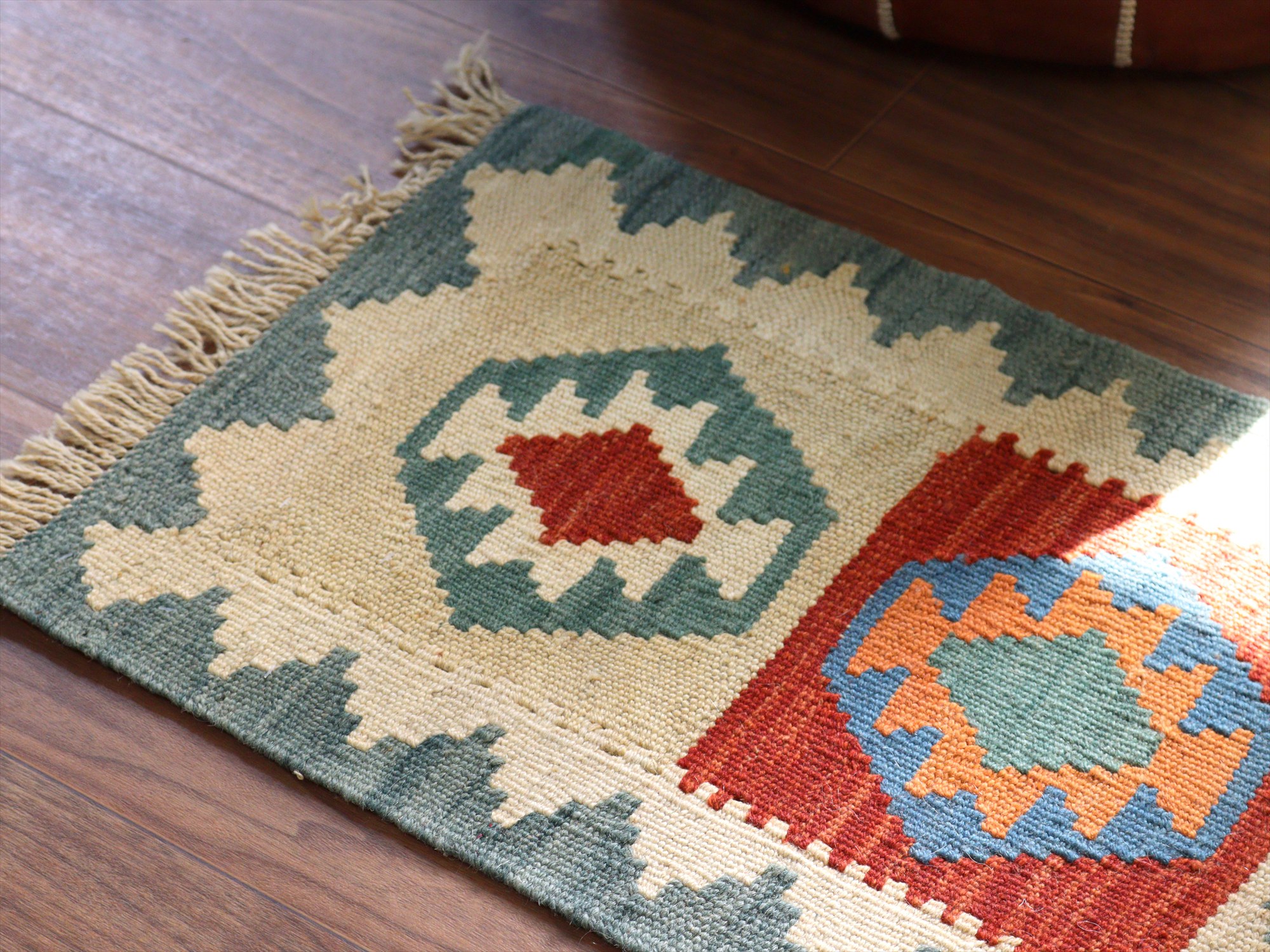 しっかりとしたハリのある織りで、厚みは4mm前後。多少カタチがゆがみがありますが、手織りキリムならではの味わいとご理解ください。