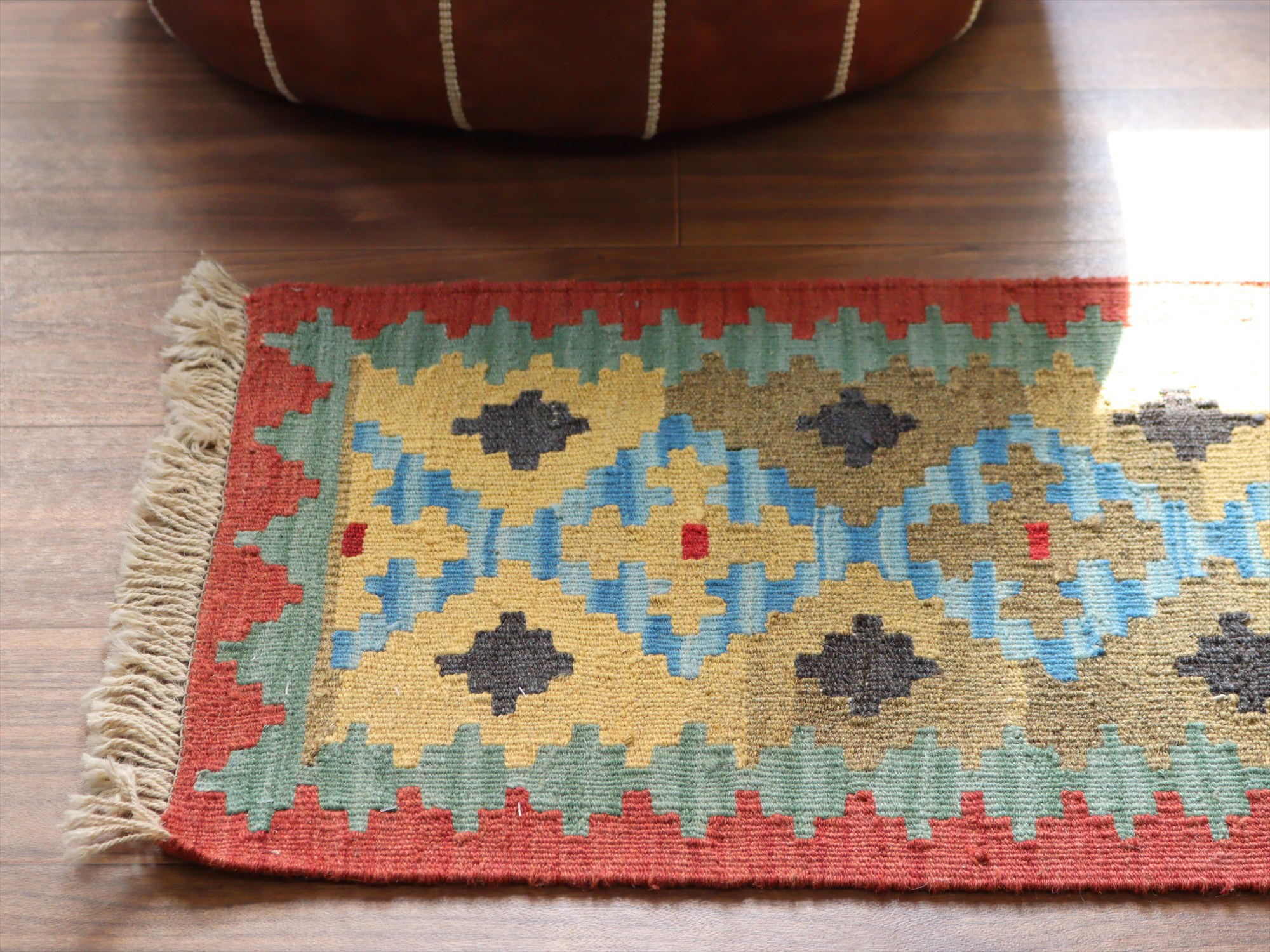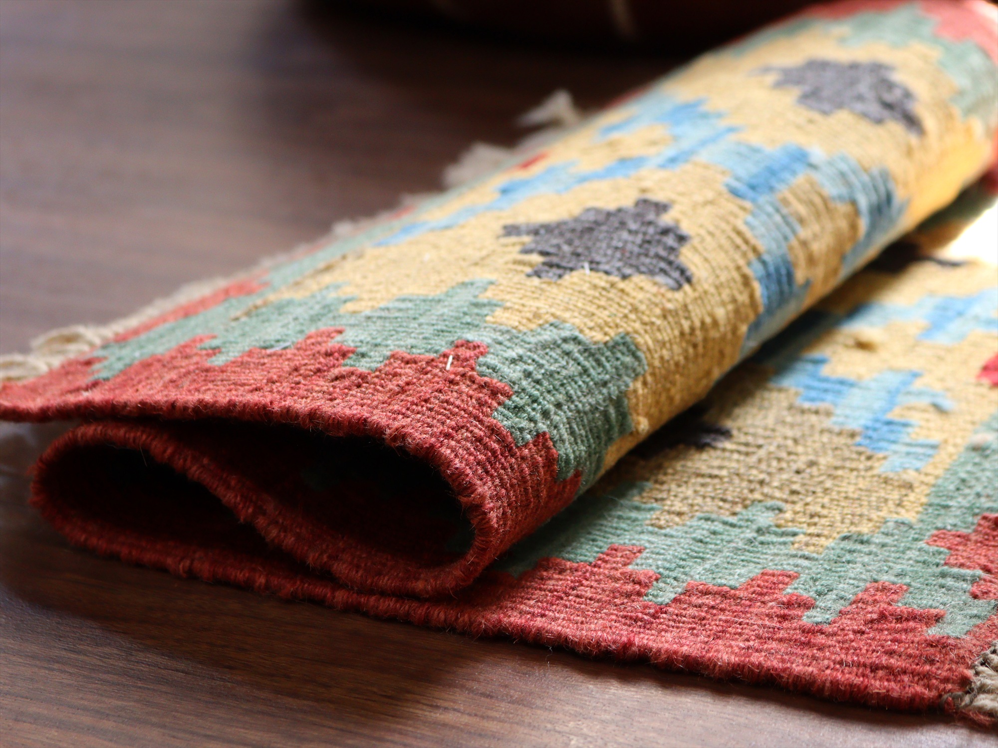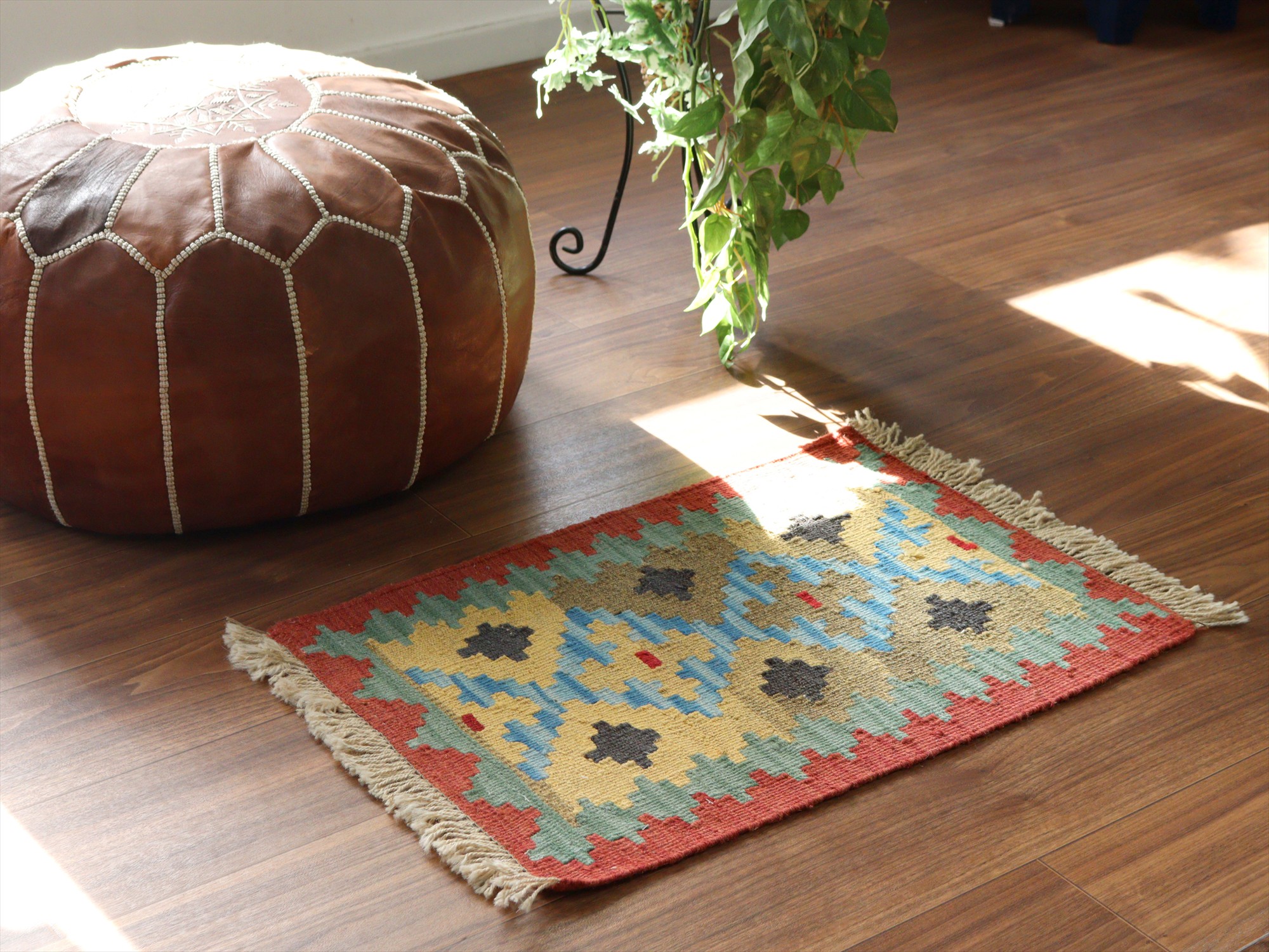 しっかりとしたハリのある織りで、厚みは4mm前後。多少カタチがゆがみがありますが、手織りキリムならではの味わいとご理解ください。