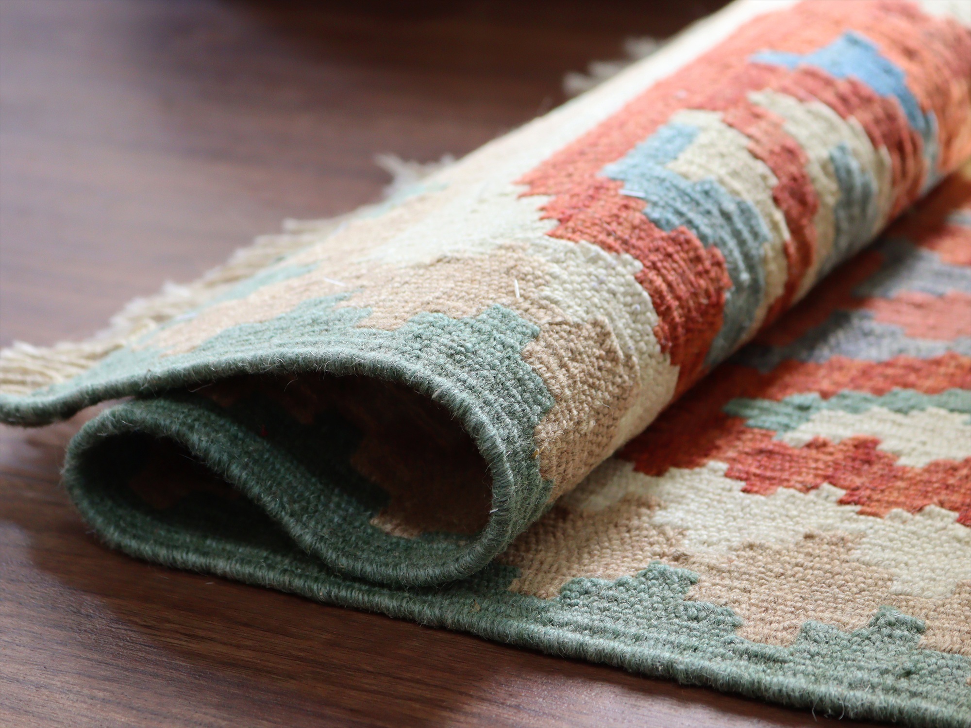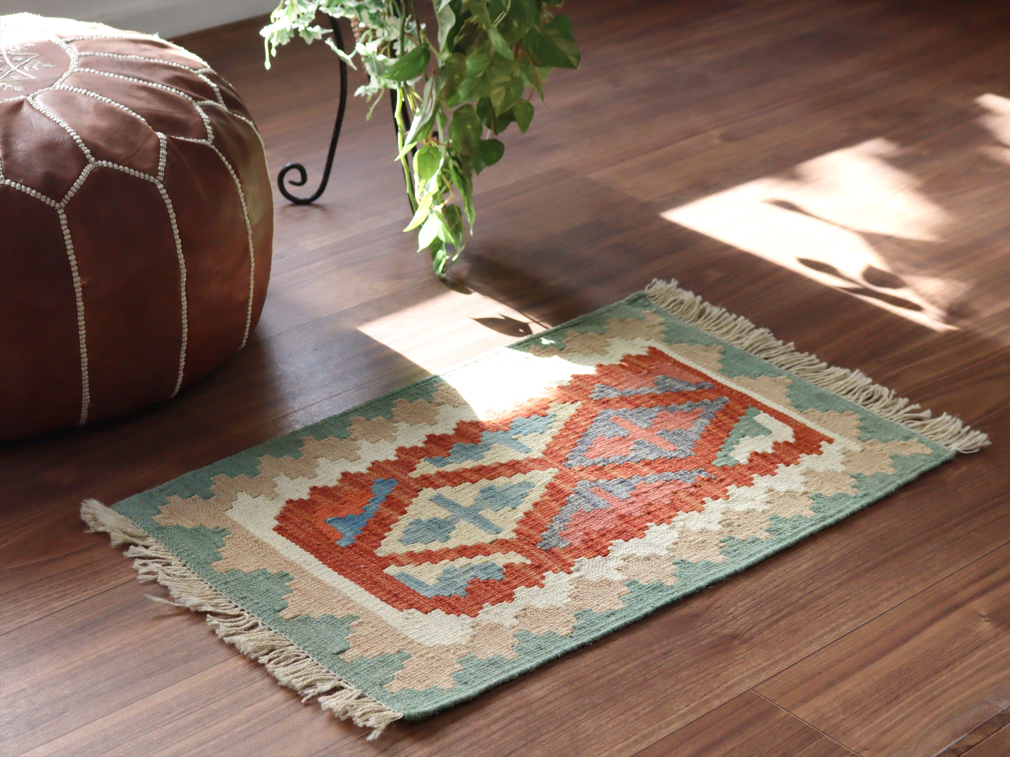 しっかりとしたハリのある織りで、厚みは4mm前後。多少カタチがゆがみがありますが、手織りキリムならではの味わいとご理解ください。