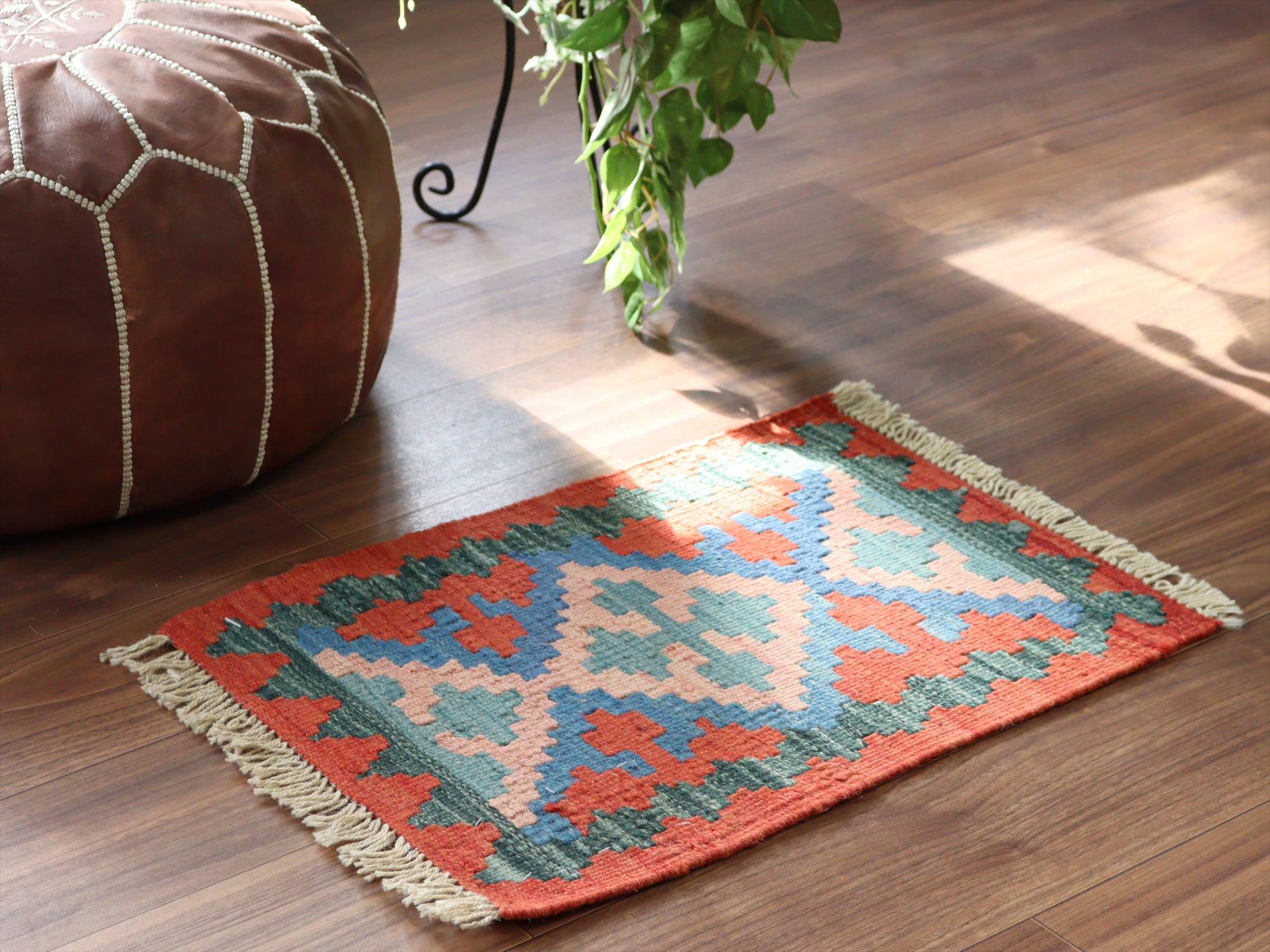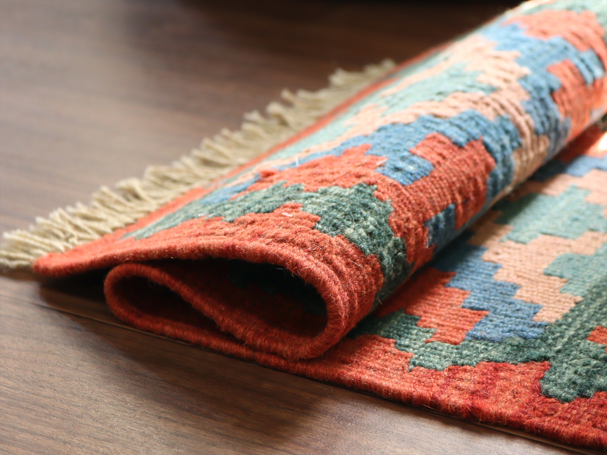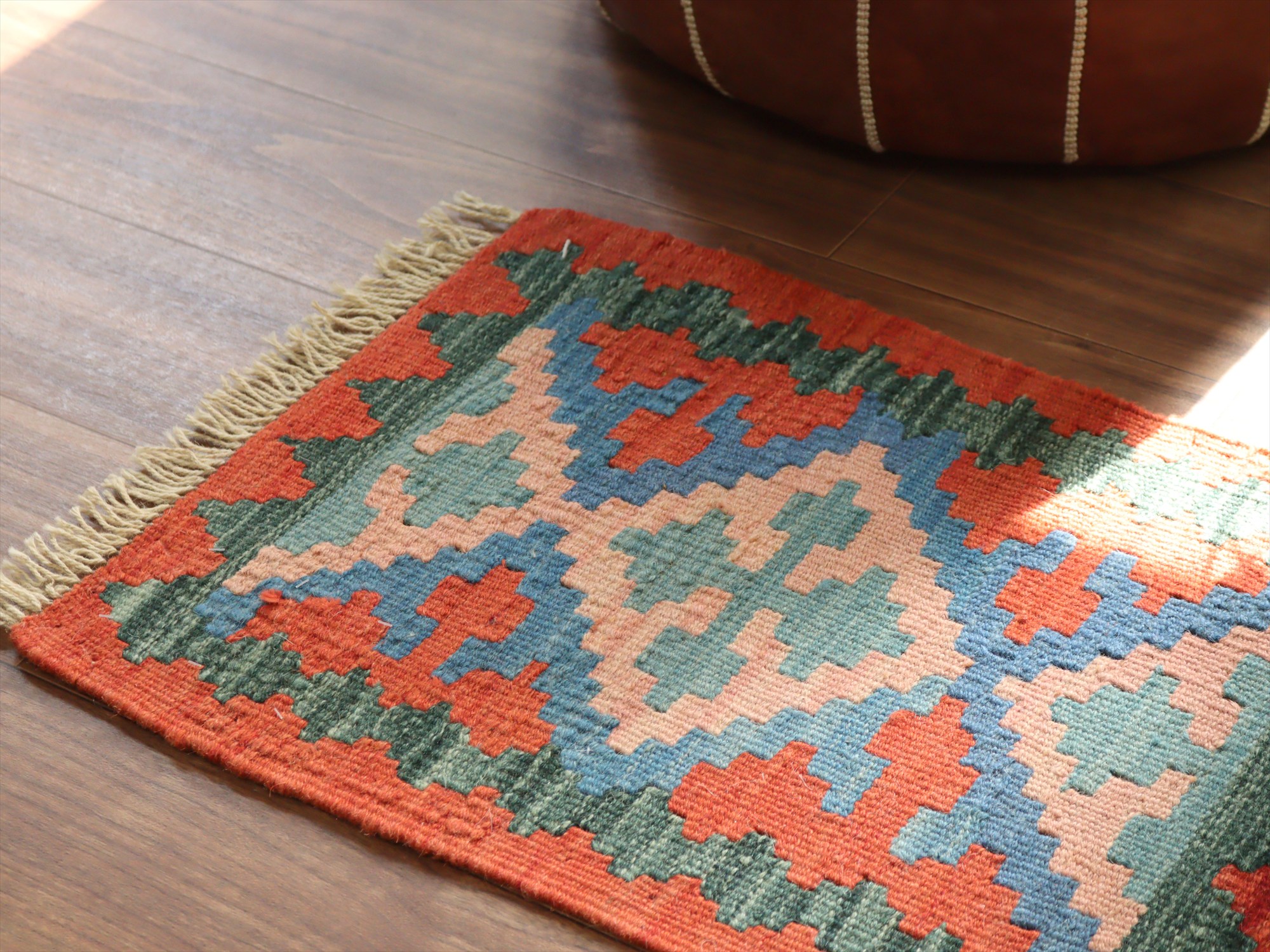 しっかりとしたハリのある織りで、厚みは4mm前後。多少カタチがゆがみがありますが、手織りキリムならではの味わいとご理解ください。
