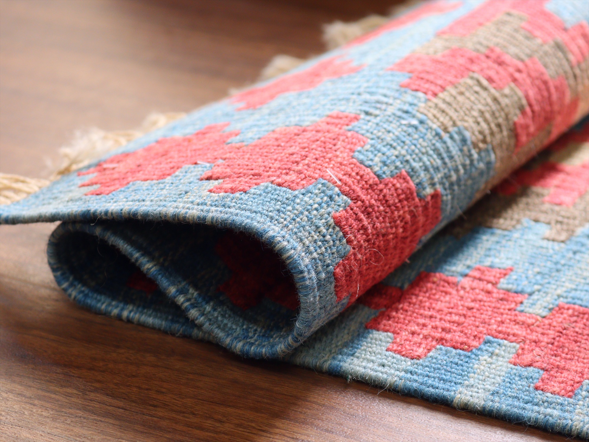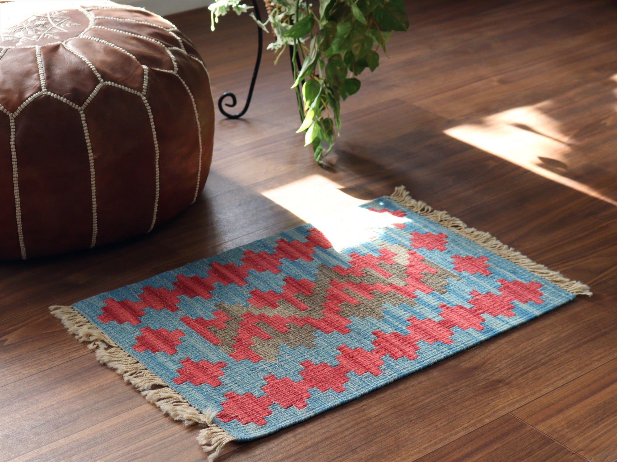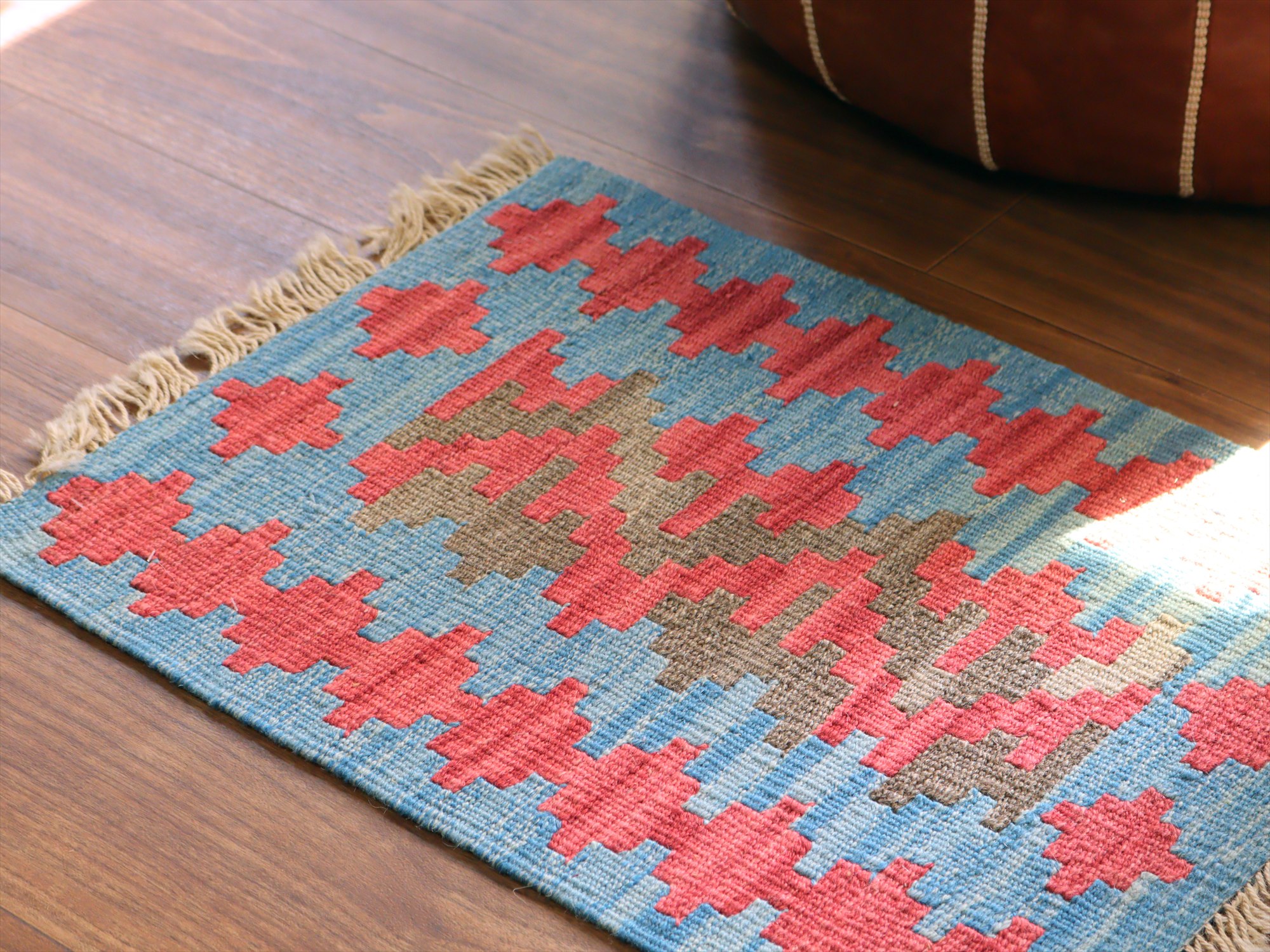 しっかりとしたハリのある織りで、厚みは4mm前後。多少カタチがゆがみがありますが、手織りキリムならではの味わいとご理解ください。