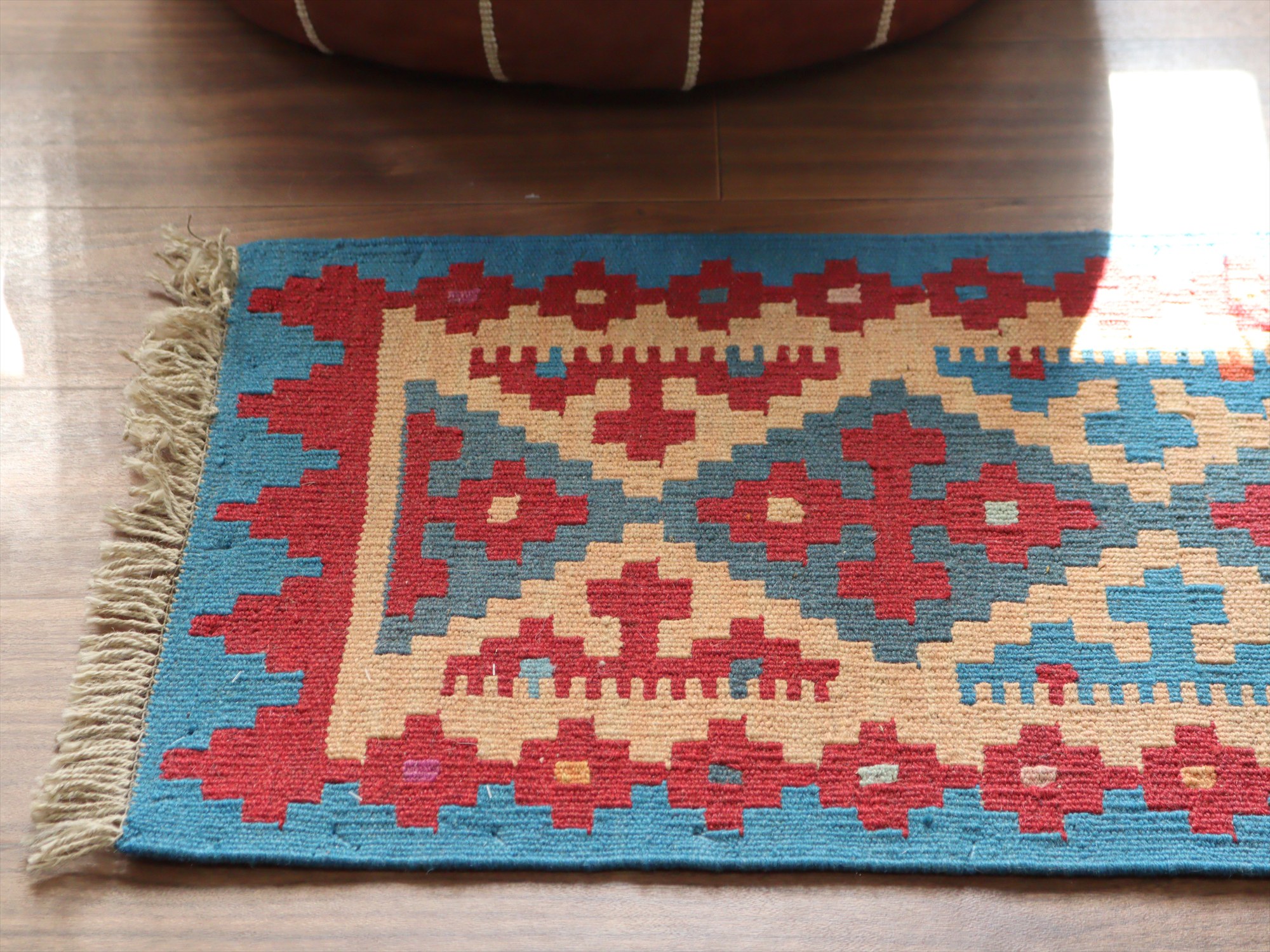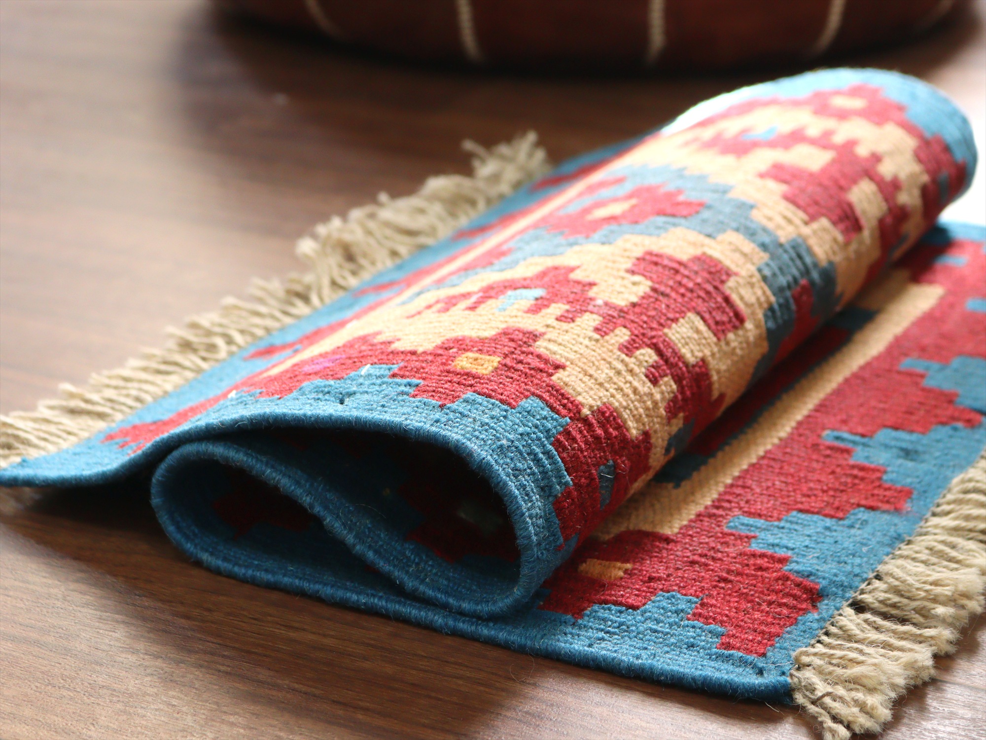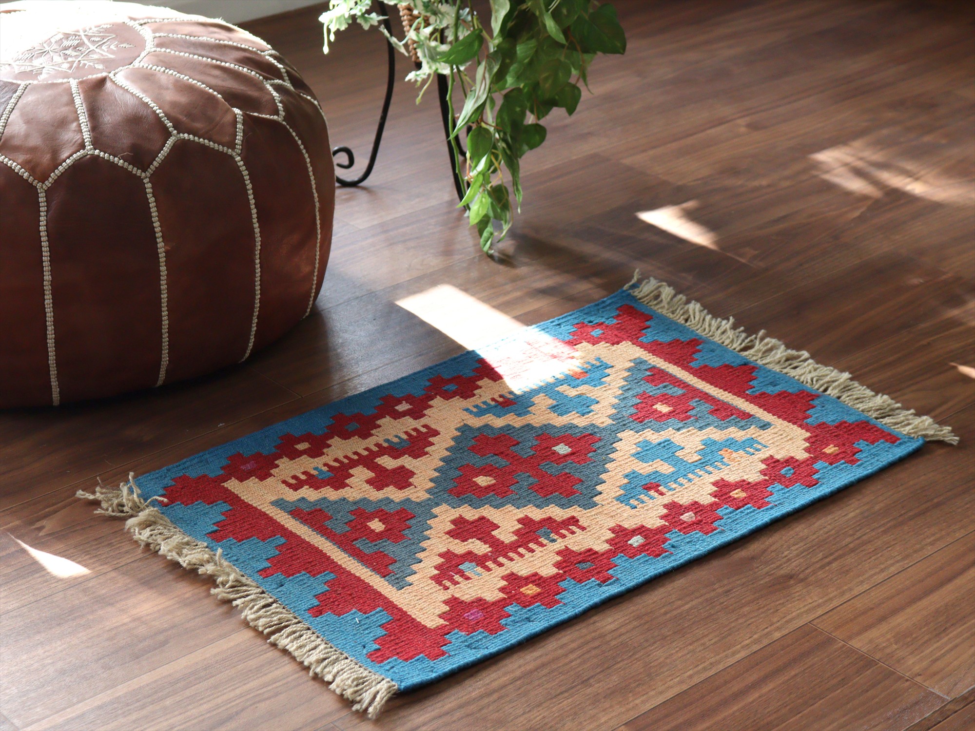 しっかりとしたハリのある織りで、厚みは4mm前後。多少カタチがゆがみがありますが、手織りキリムならではの味わいとご理解ください。