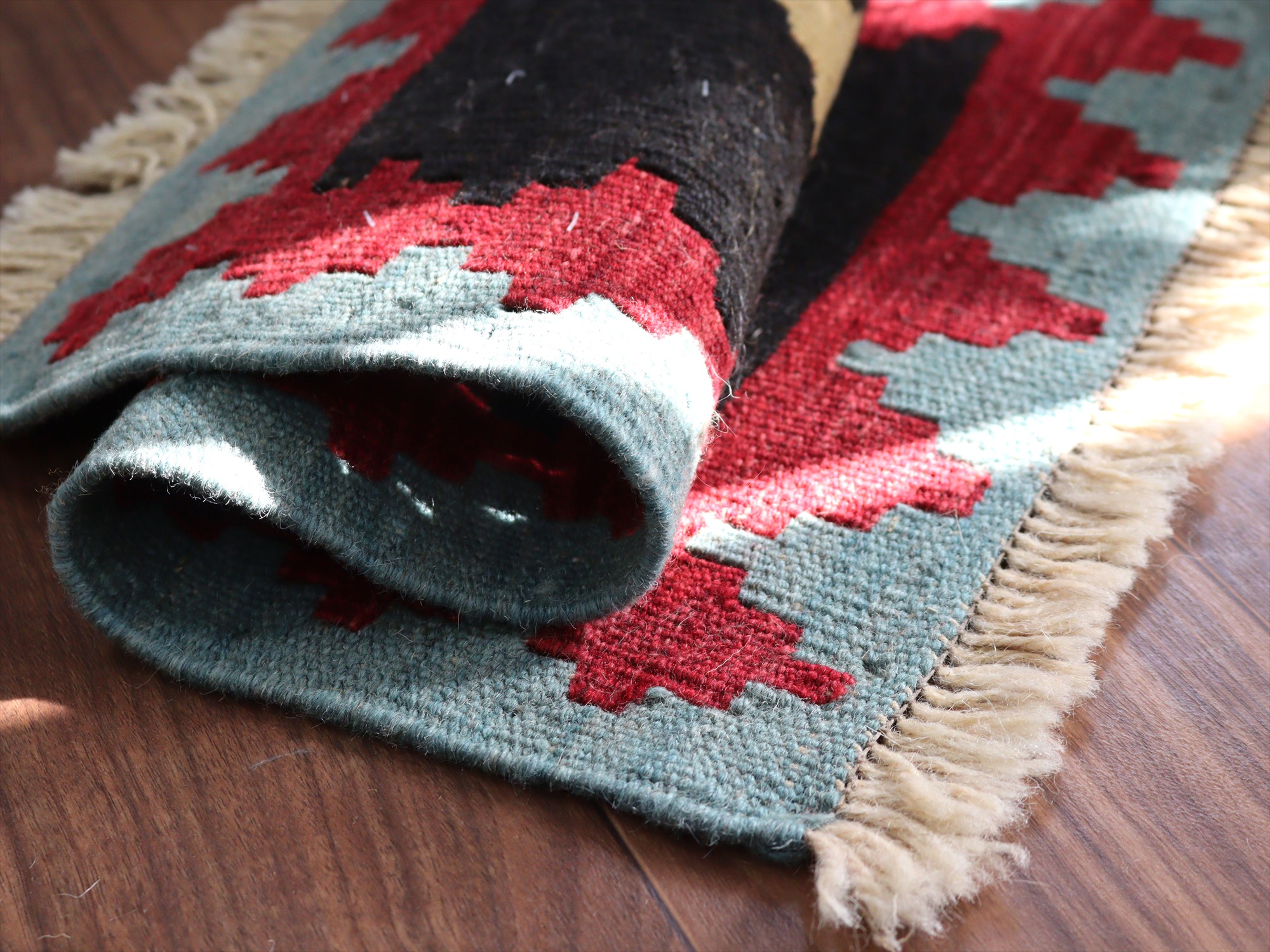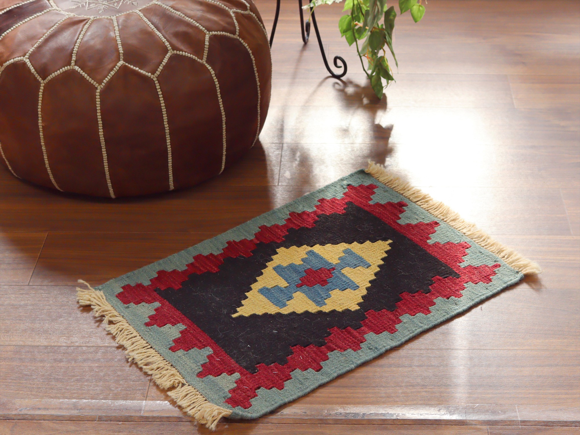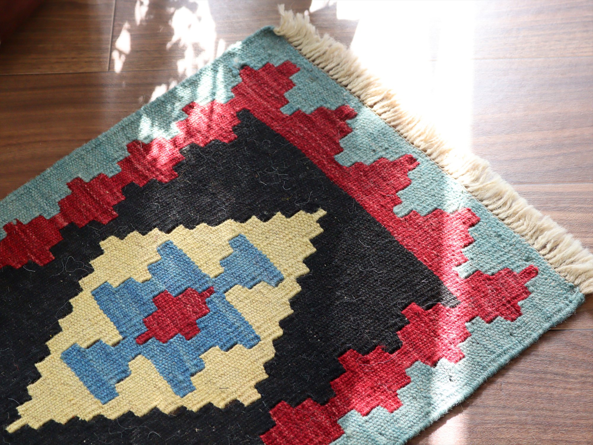 しっかりとしたハリのある織りで、厚みは4mm前後。多少カタチがゆがみがありますが、手織りキリムならではの味わいとご理解ください。