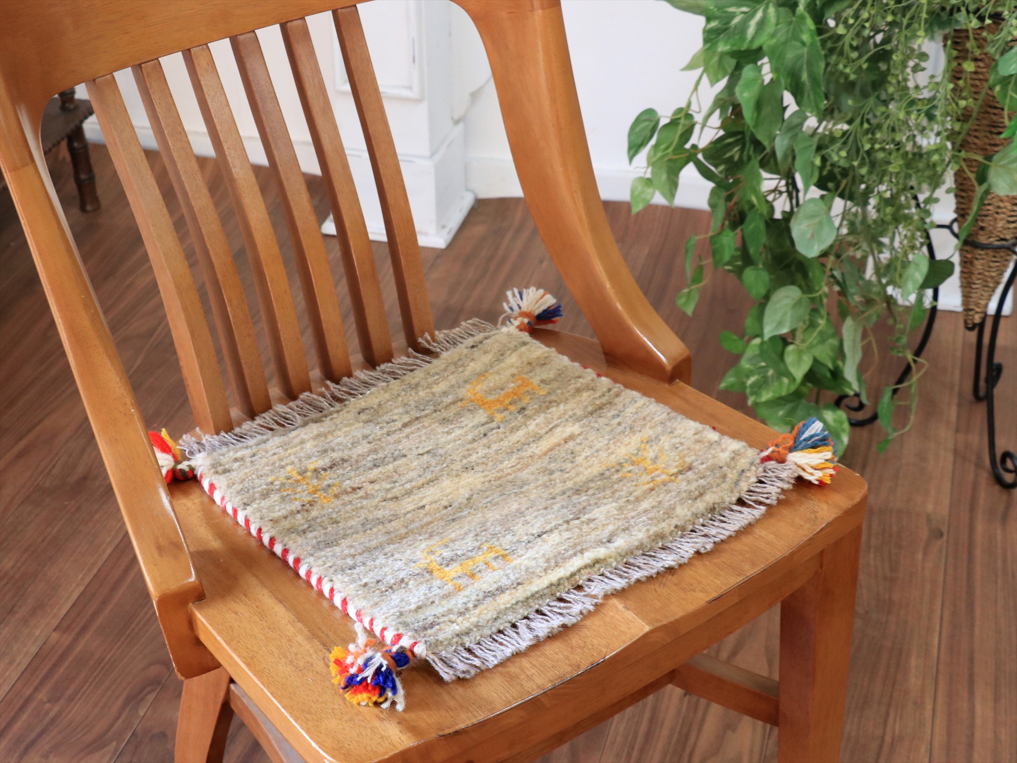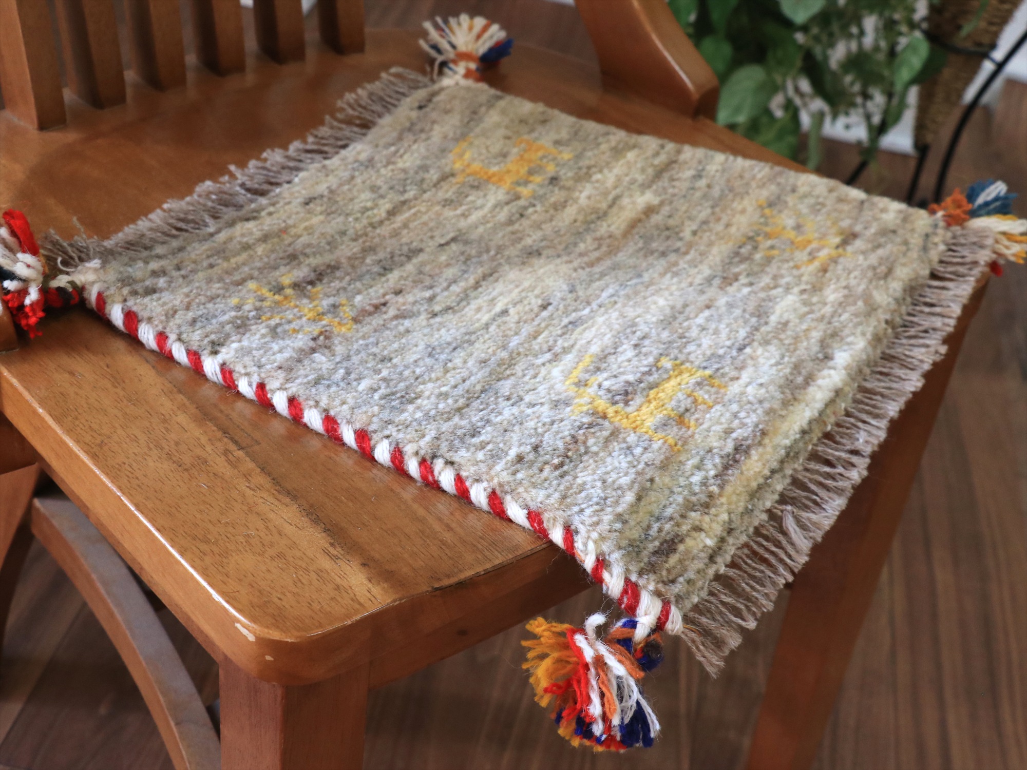 ふかふかした毛足(パイル)で、手触りが気持ちいい手織りのギャッベ。ミニサイズなので、座布団代わりに敷くのはもちろん、ダイニングチェアに敷いたり、絵画のように壁に貼ってデコレーションとしても楽しめます。手織りならではの一枚一枚違ったテイストをお楽しみください。