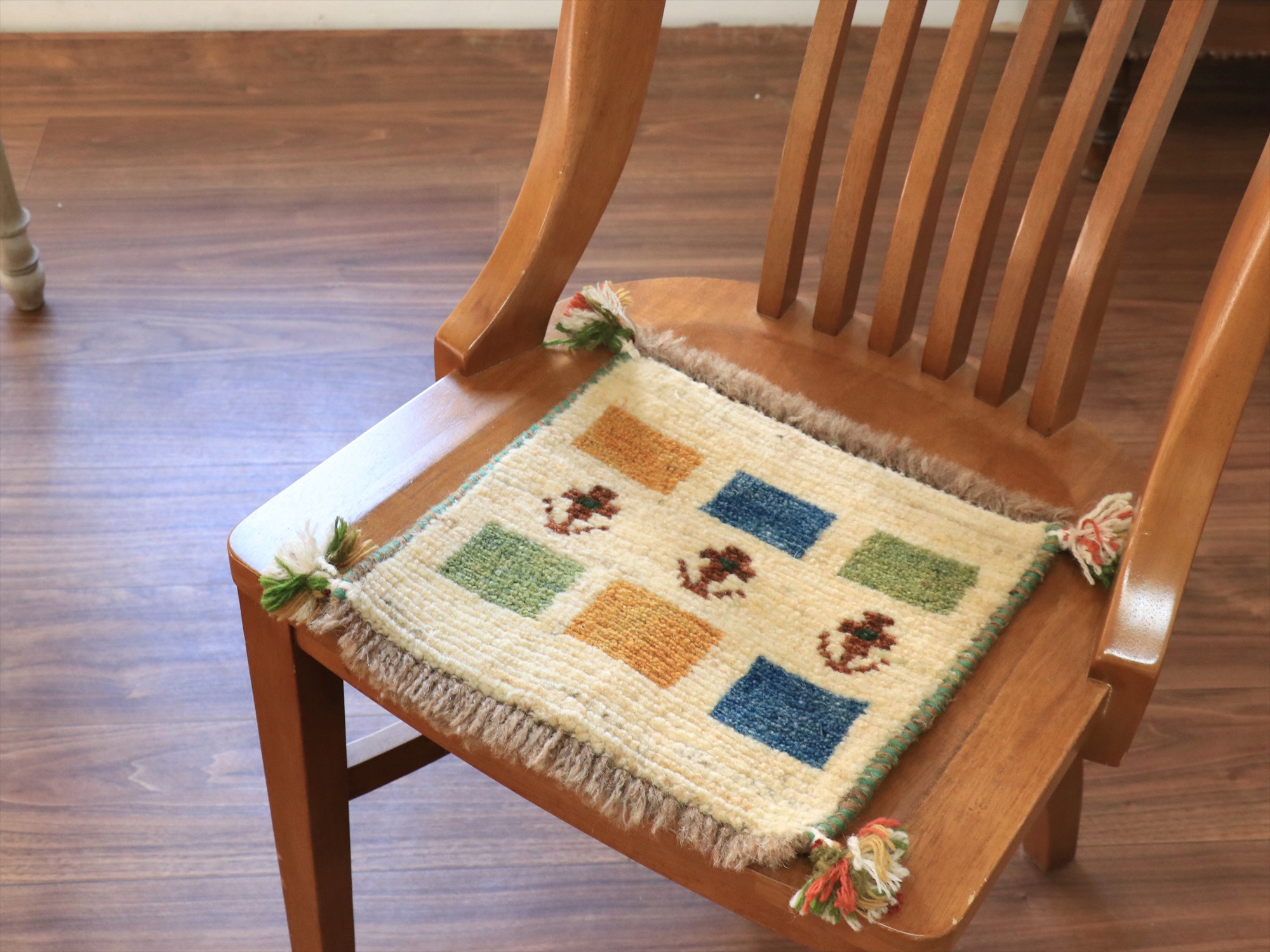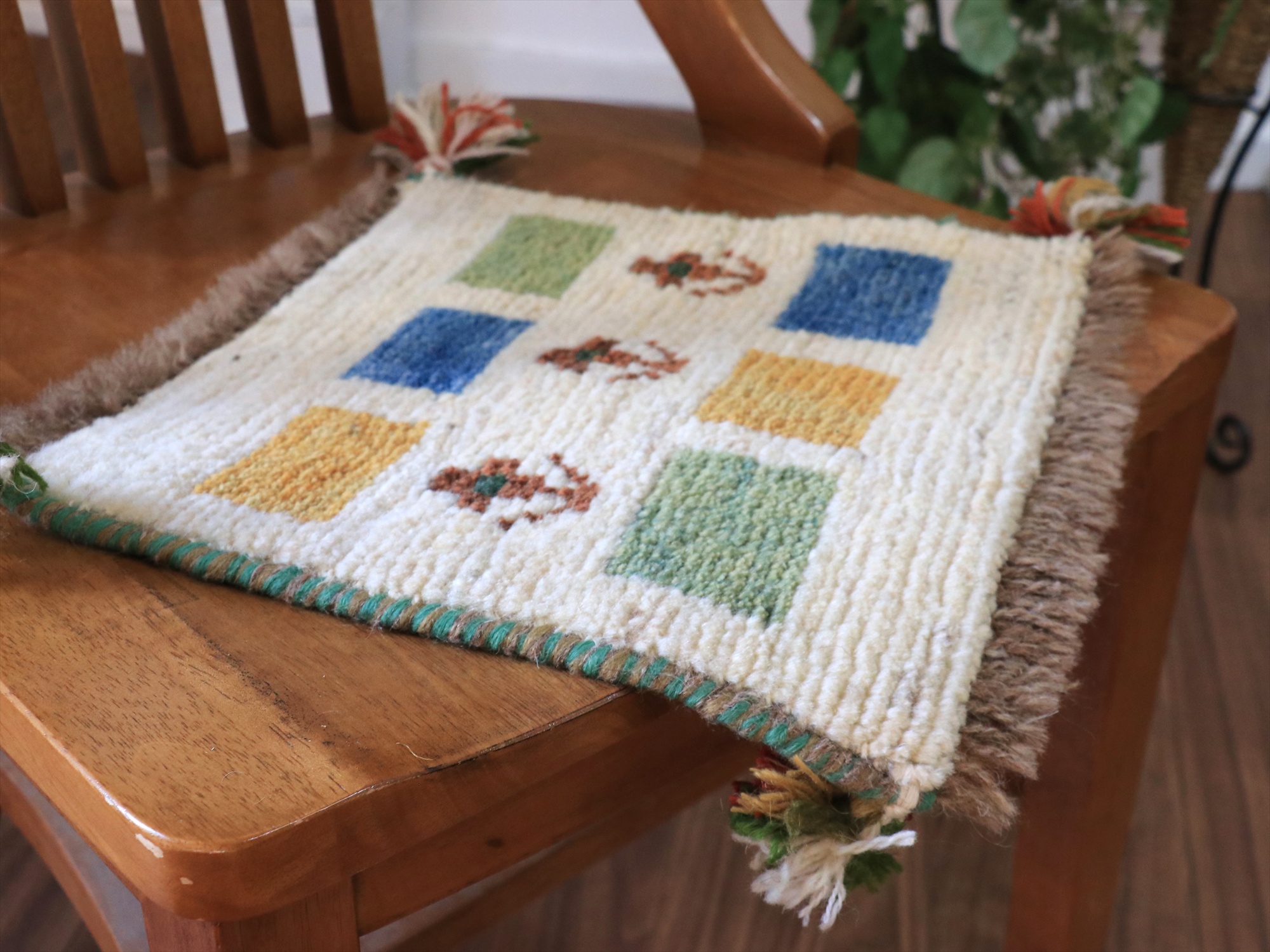 ふかふかした毛足(パイル)で、手触りが気持ちいい手織りのギャッベ。ミニサイズなので、座布団代わりに敷くのはもちろん、ダイニングチェアに敷いたり、絵画のように壁に貼ってデコレーションとしても楽しめます。手織りならではの一枚一枚違ったテイストをお楽しみください。