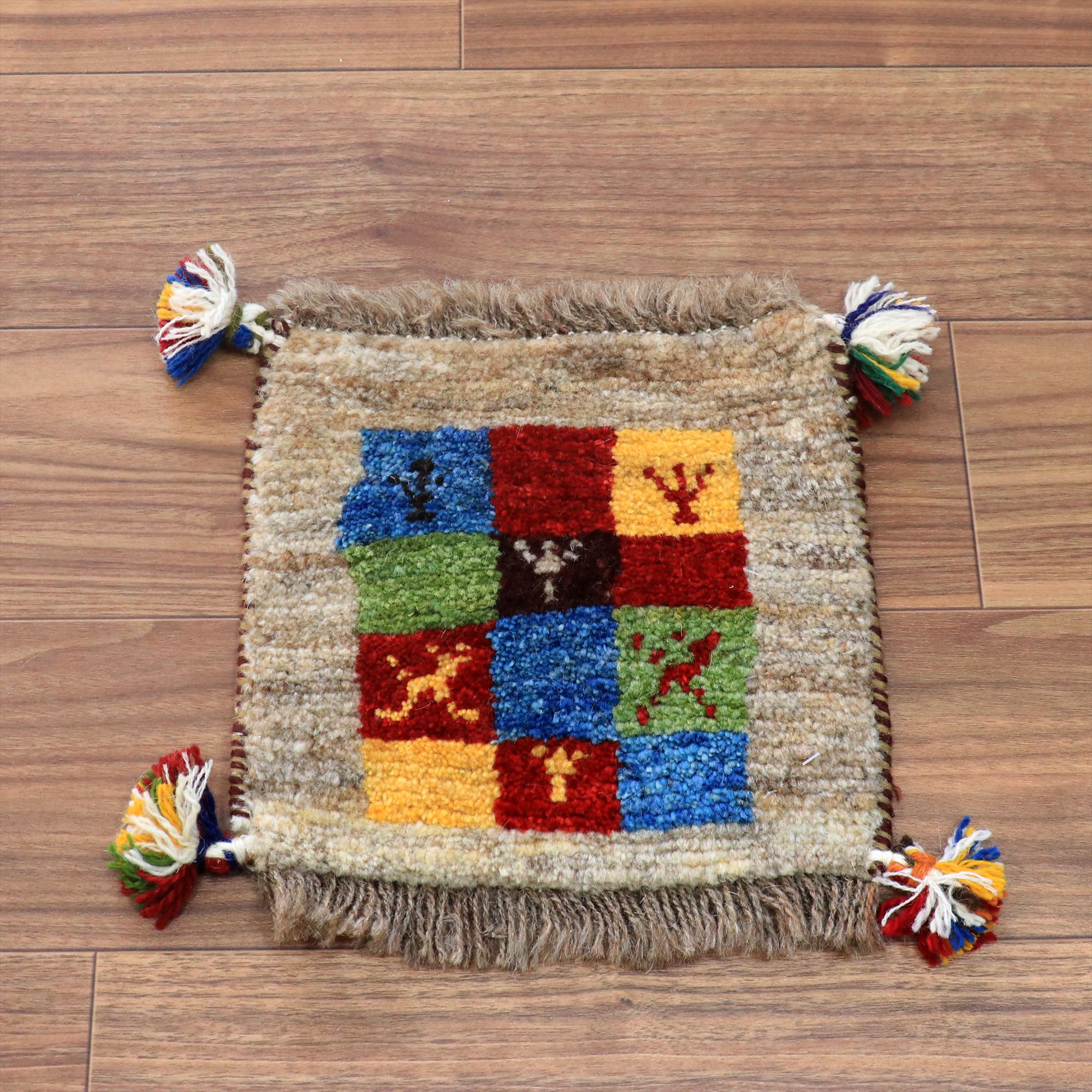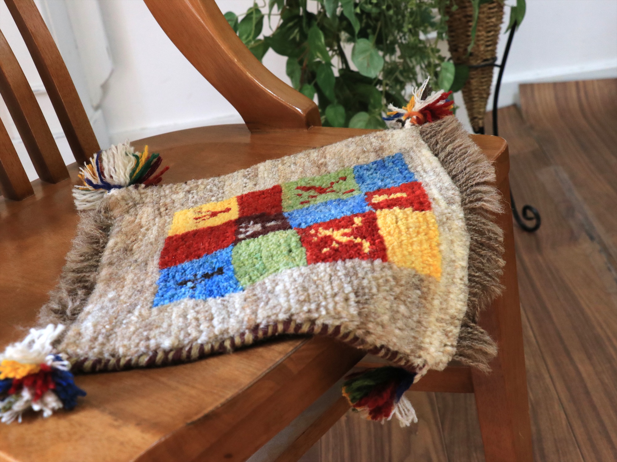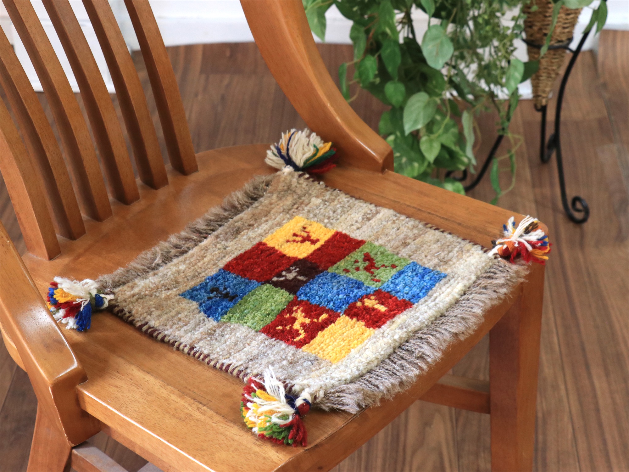 ふかふかした毛足(パイル)で、手触りが気持ちいい手織りのギャッベ。ミニサイズなので、座布団代わりに敷くのはもちろん、ダイニングチェアに敷いたり、絵画のように壁に貼ってデコレーションとしても楽しめます。手織りならではの一枚一枚違ったテイストをお楽しみください。