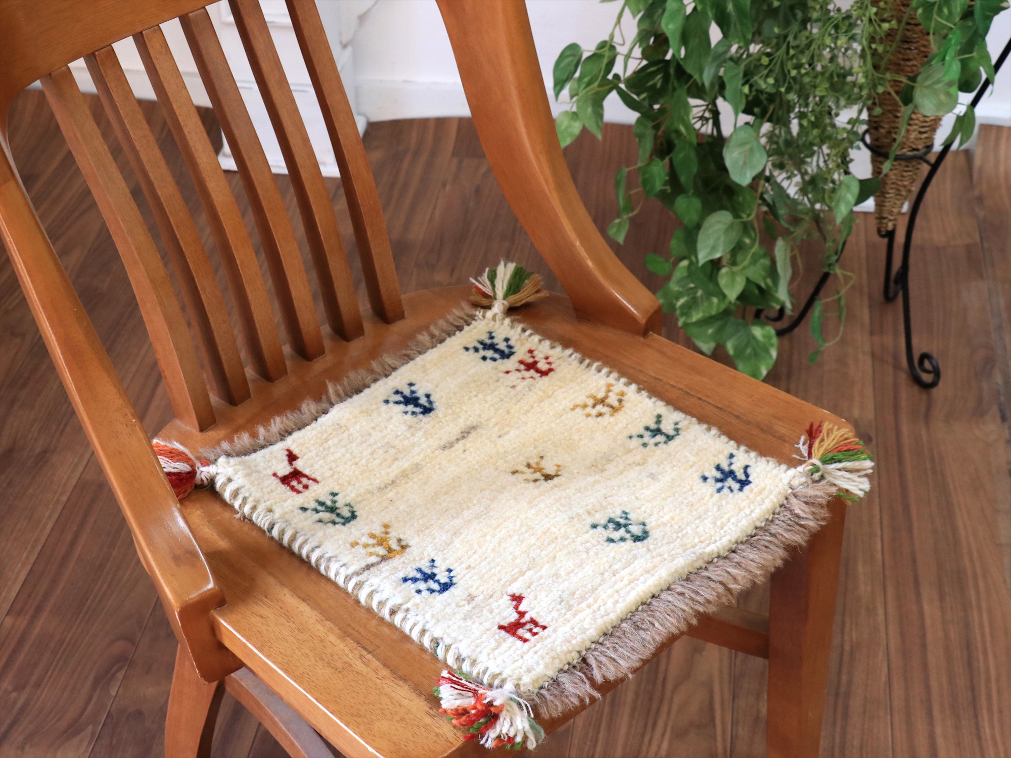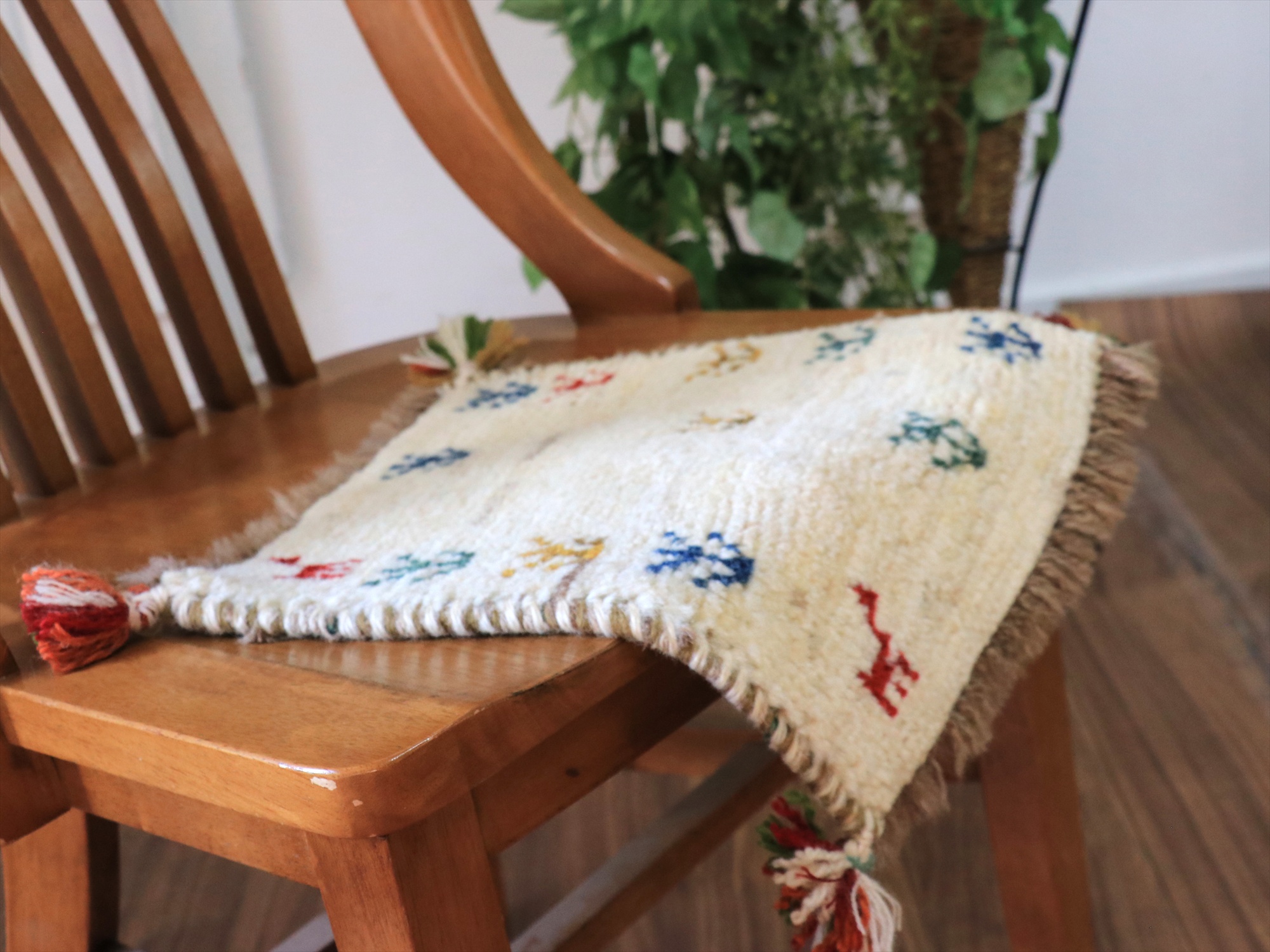 ふかふかした毛足(パイル)で、手触りが気持ちいい手織りのギャッベ。ミニサイズなので、座布団代わりに敷くのはもちろん、ダイニングチェアに敷いたり、絵画のように壁に貼ってデコレーションとしても楽しめます。手織りならではの一枚一枚違ったテイストをお楽しみください。