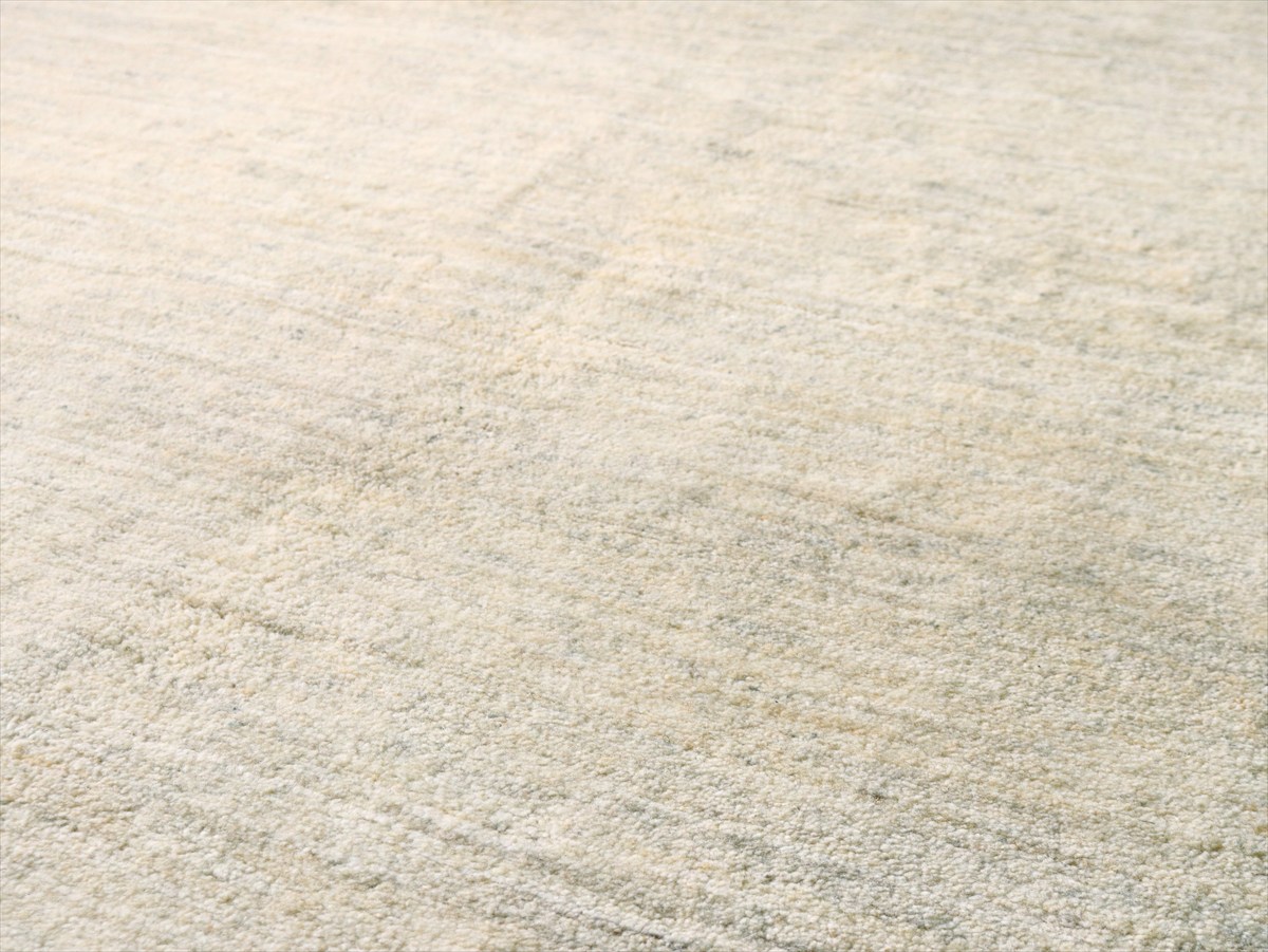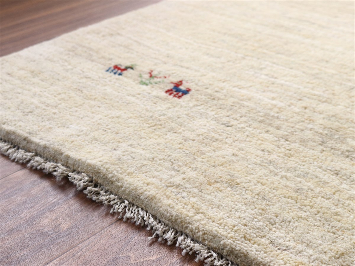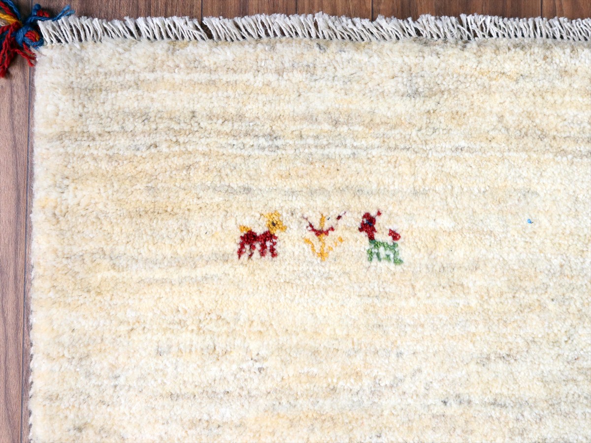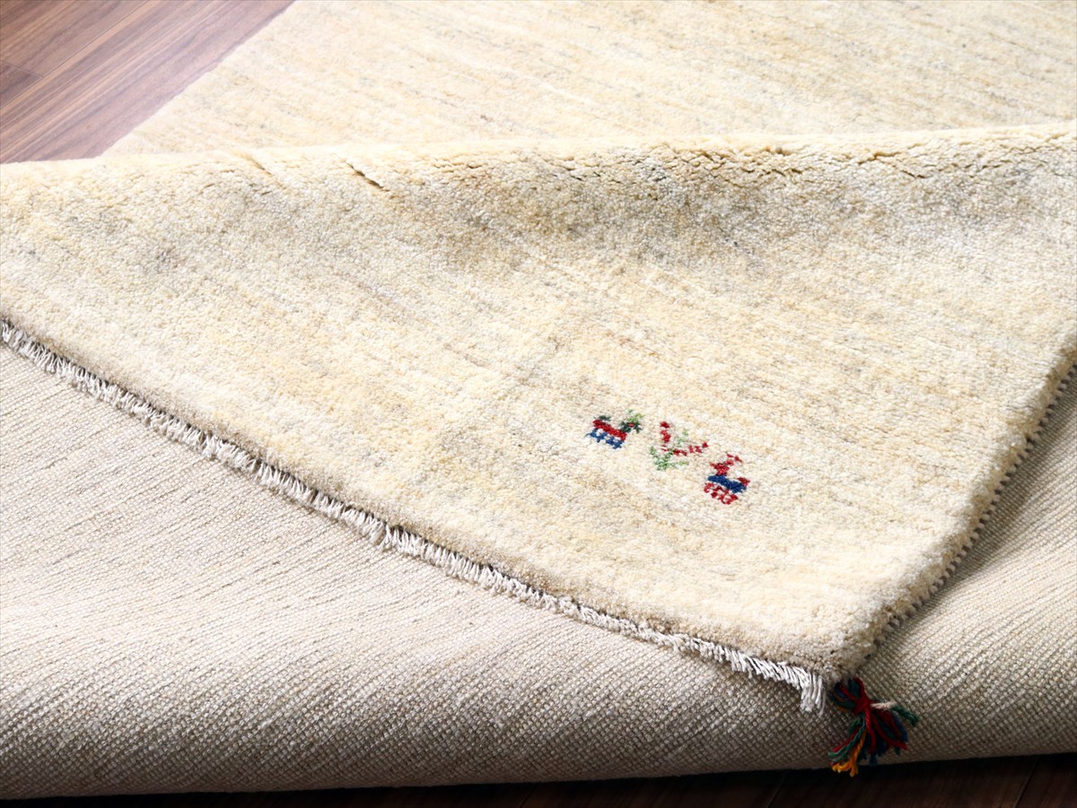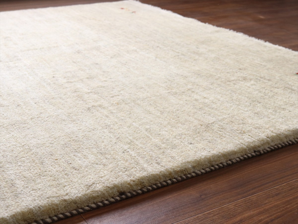 染めていない天然の羊毛の色をいかして織られたアイボリー色のギャッベです。シンプルなデザインながら、羊毛の色の濃淡が自然な感じに混ざり合っていて、ナチュラルであたたかみのある風合いに仕上がっています。