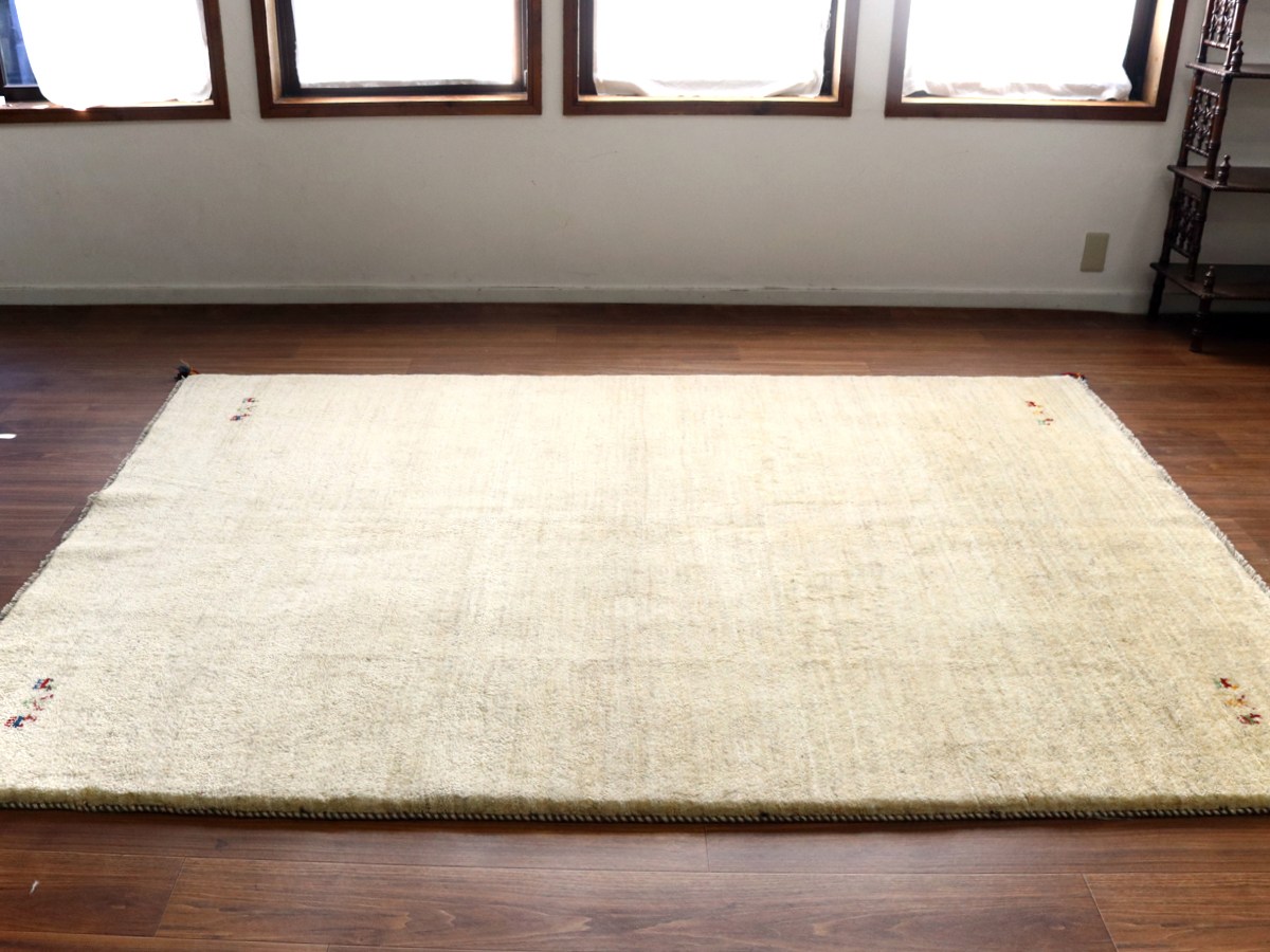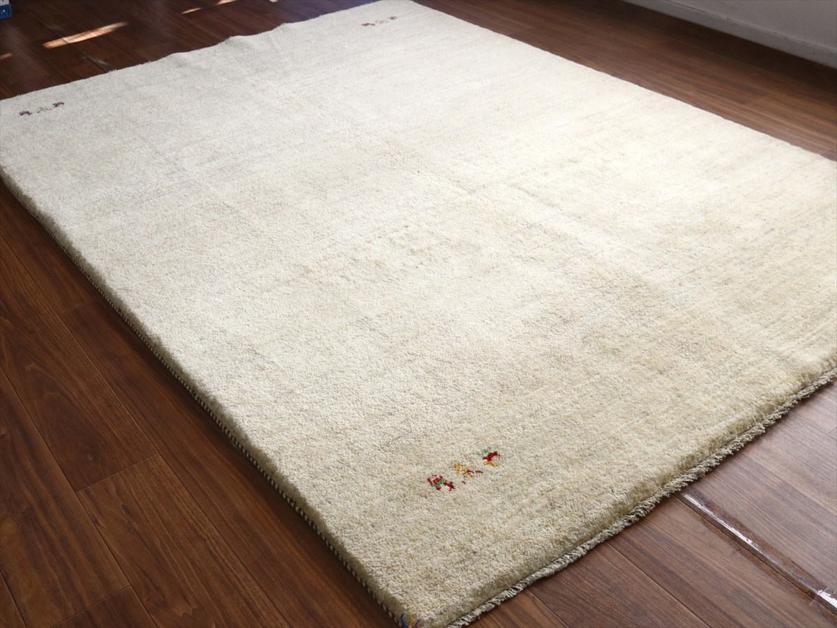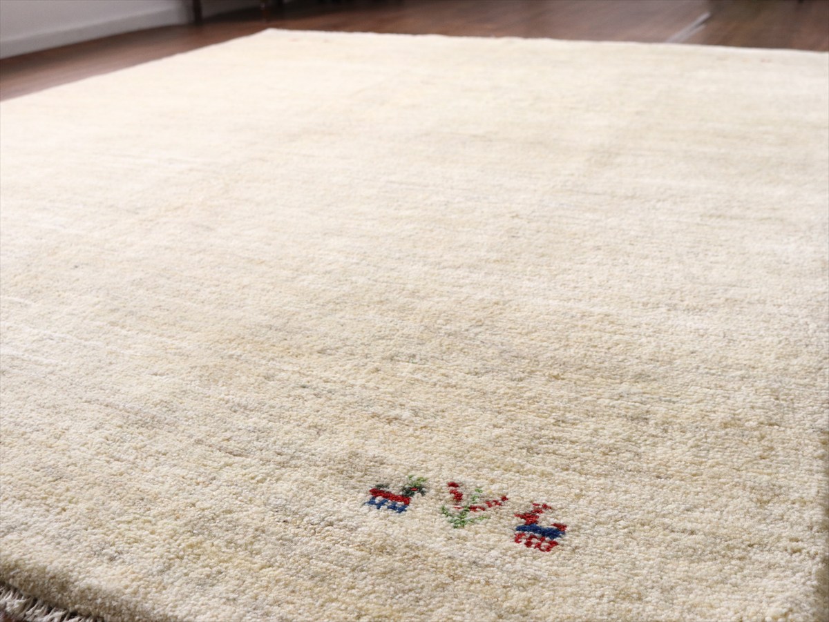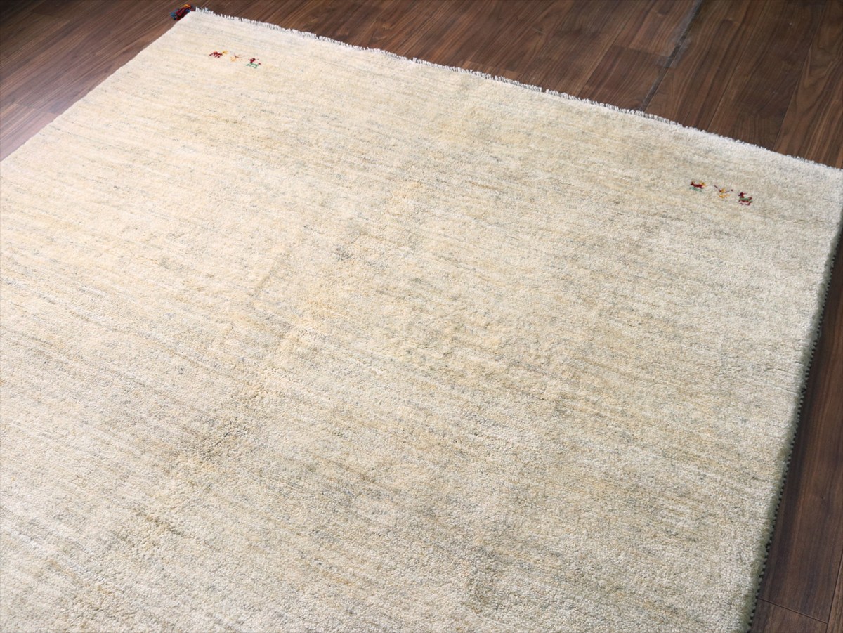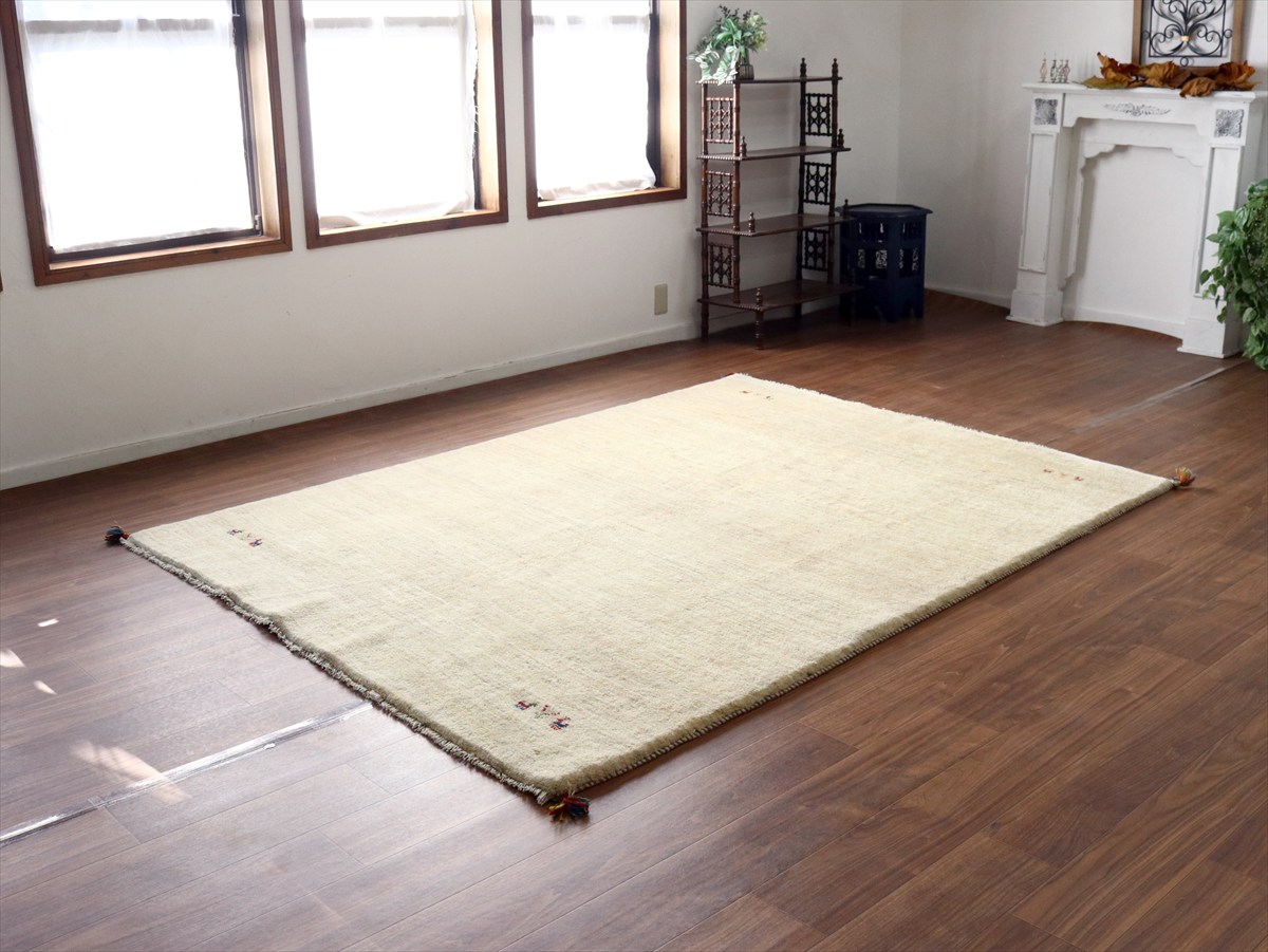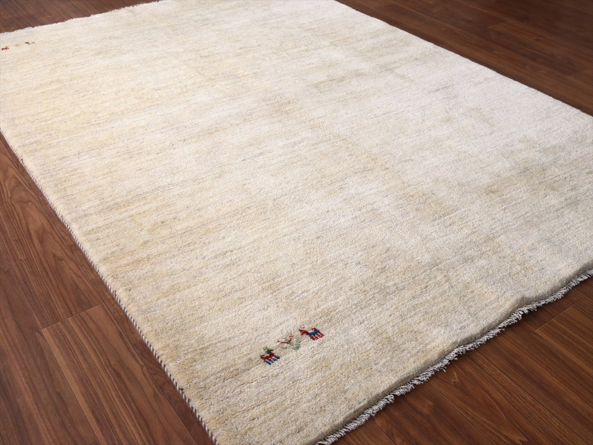 染めていない天然の羊毛の色をいかして織られたアイボリー色のギャッベです。シンプルなデザインながら、羊毛の色の濃淡が自然な感じに混ざり合っていて、ナチュラルであたたかみのある風合いに仕上がっています。