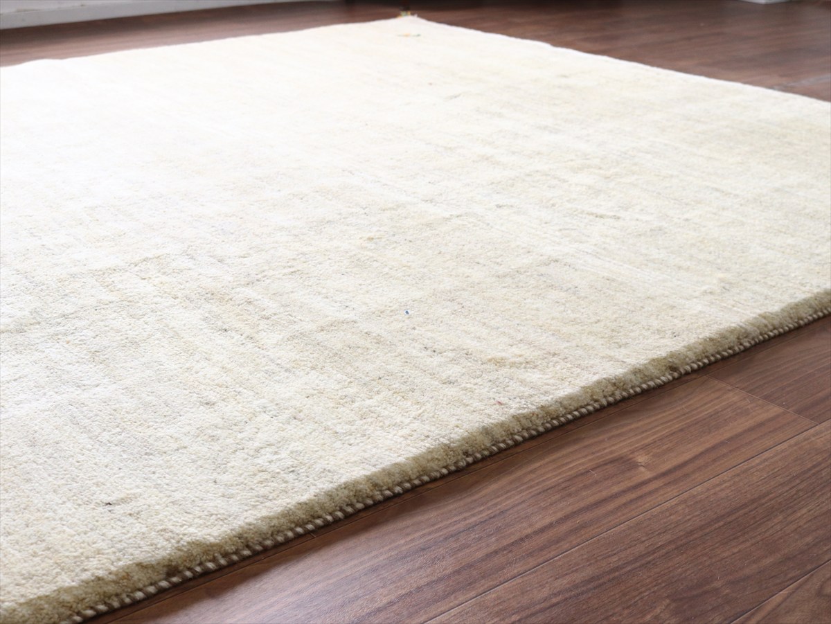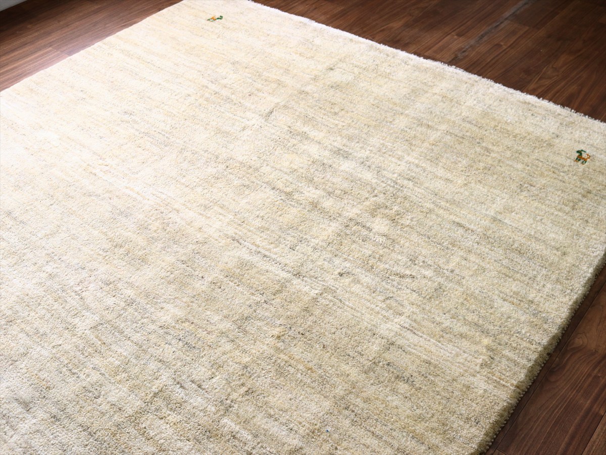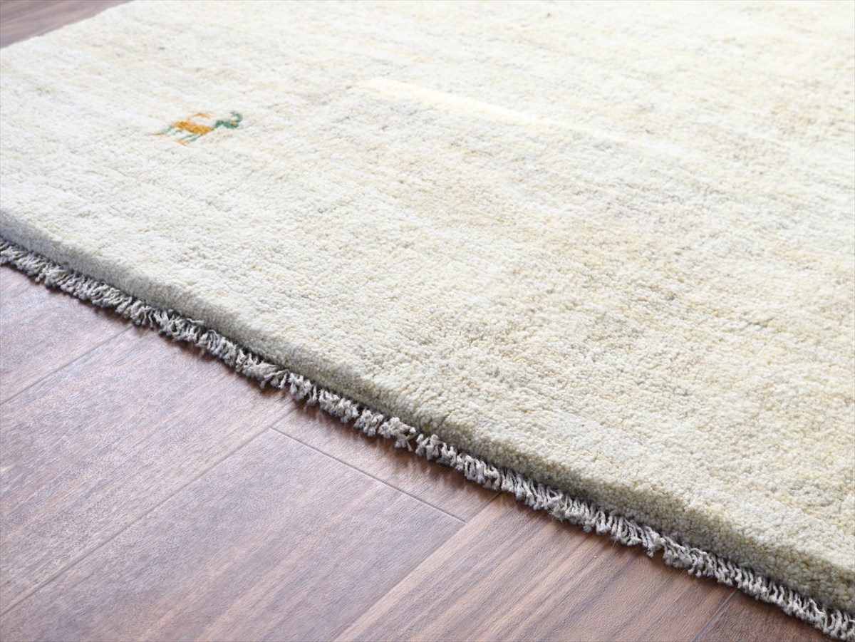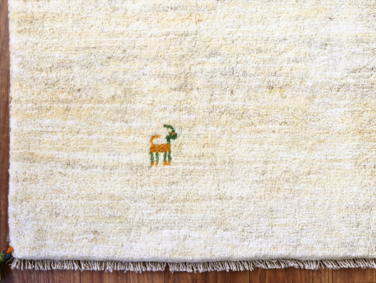 染めていない天然の羊毛の色をいかして織られたアイボリー色のギャッベです。シンプルなデザインながら、羊毛の色の濃淡が自然な感じに混ざり合っていて、ナチュラルであたたかみのある風合いに仕上がっています。