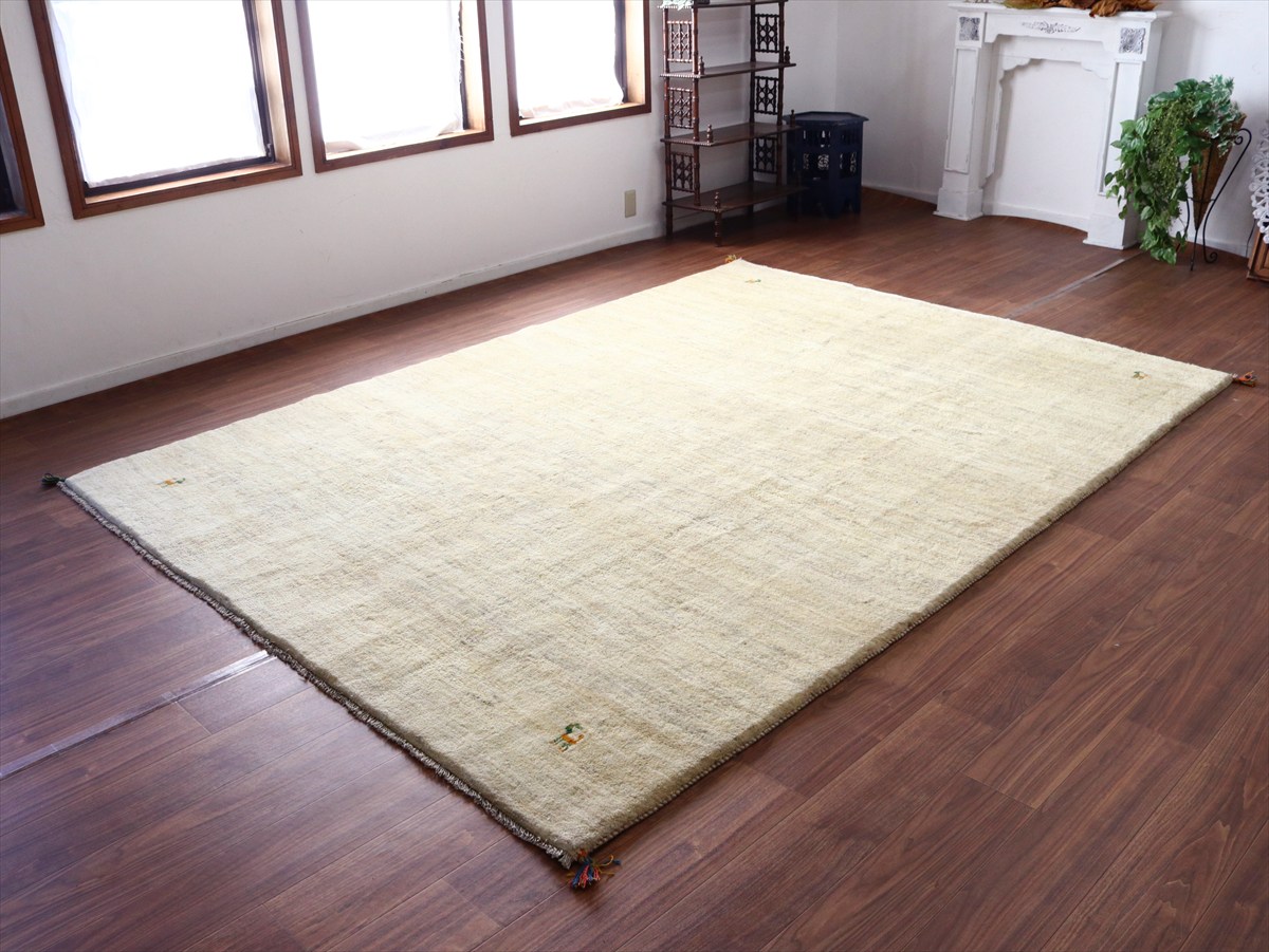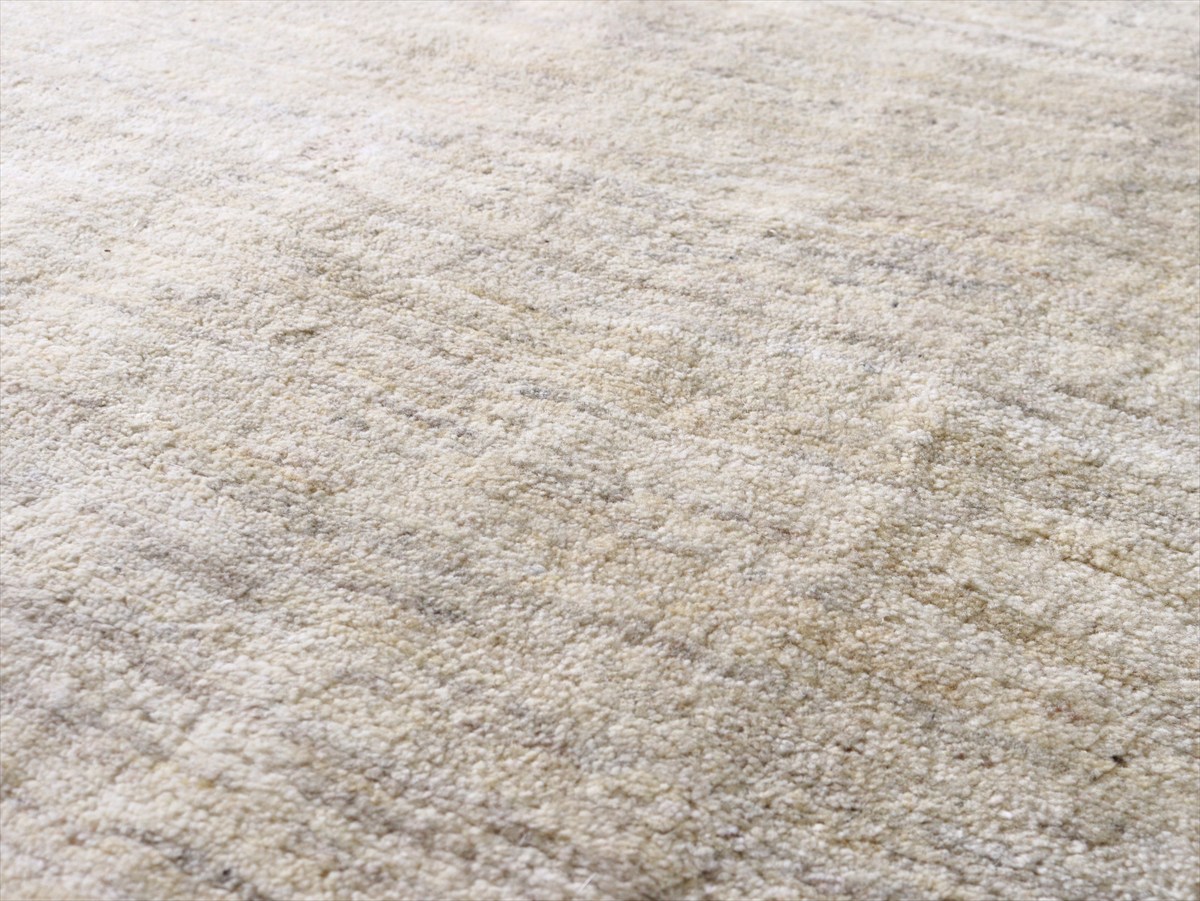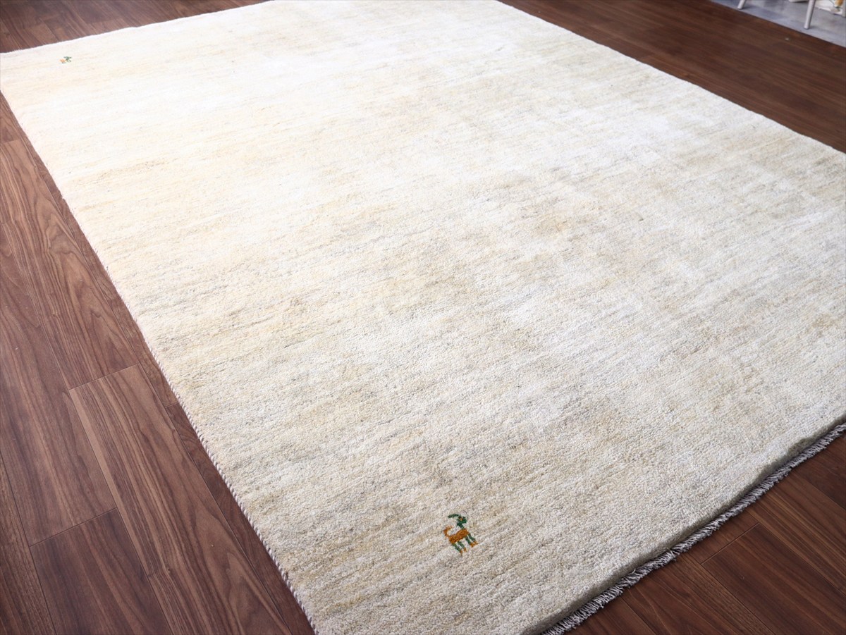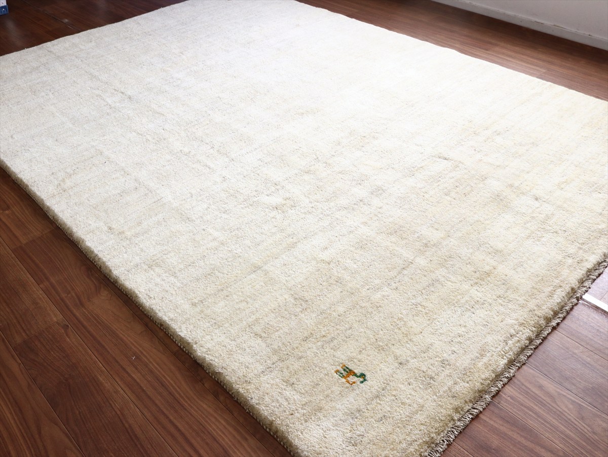 染めていない天然の羊毛の色をいかして織られたアイボリー色のギャッベです。シンプルなデザインながら、羊毛の色の濃淡が自然な感じに混ざり合っていて、ナチュラルであたたかみのある風合いに仕上がっています。
