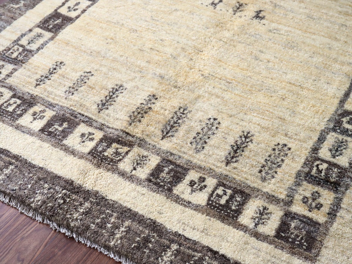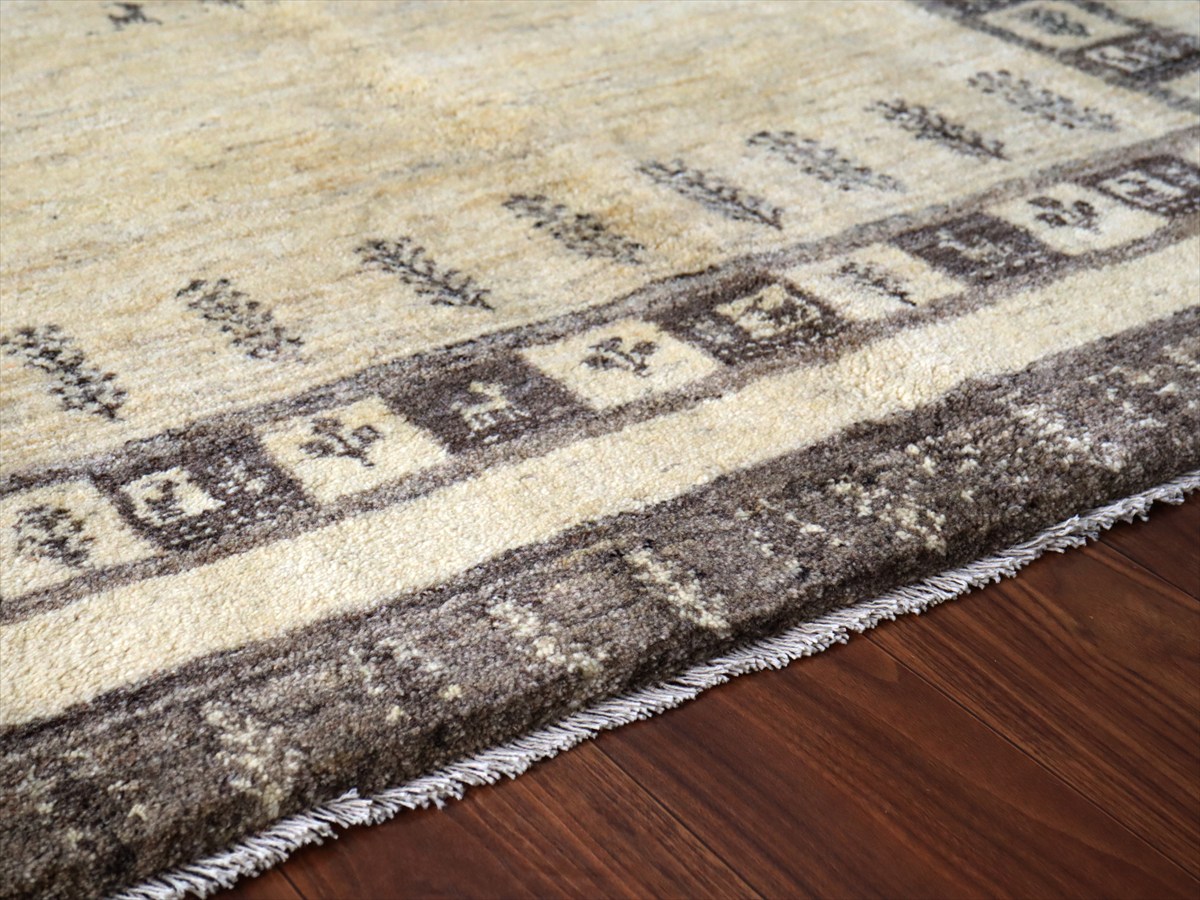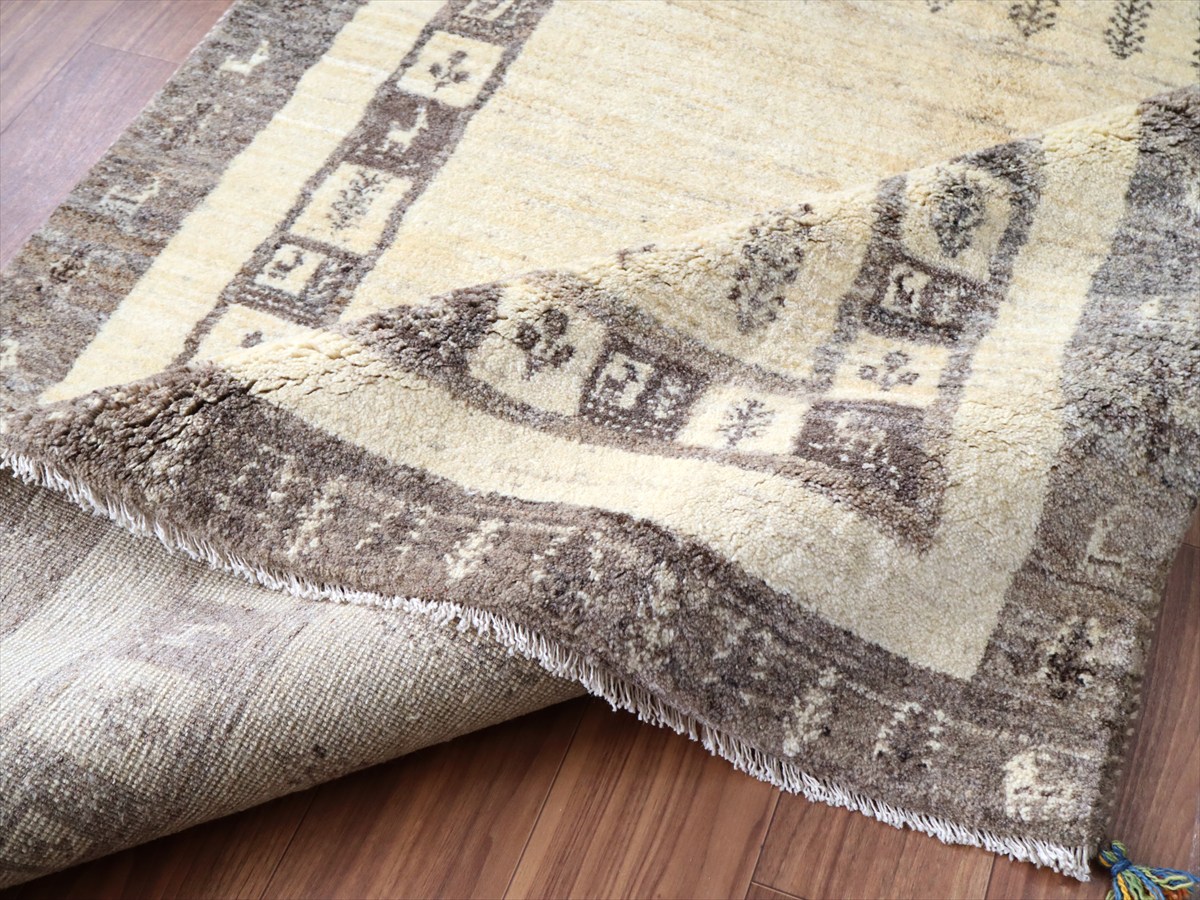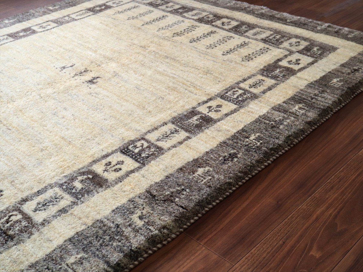 羊毛の自然な色味を活かしたナチュラルアイボリー、グレーをベースに、ド物と生命の樹モチーフが額縁にもたくさん織られています。モチーフがたくさん織られていますが、ナチュラルアイボリーとグレーのトーンで落ち着いた雰囲気に仕上がっています。