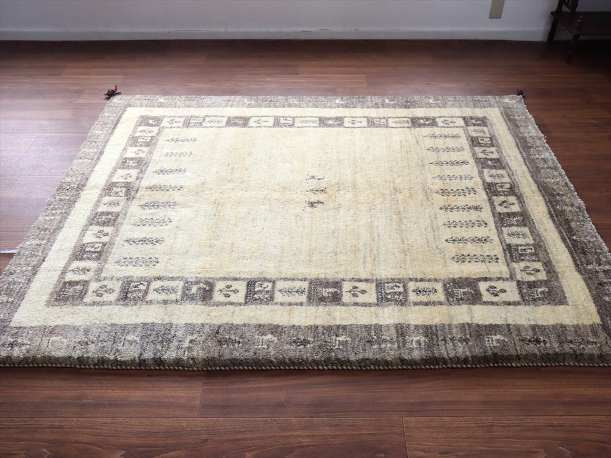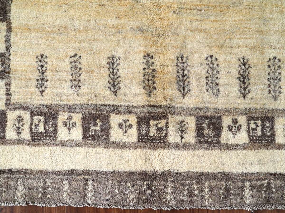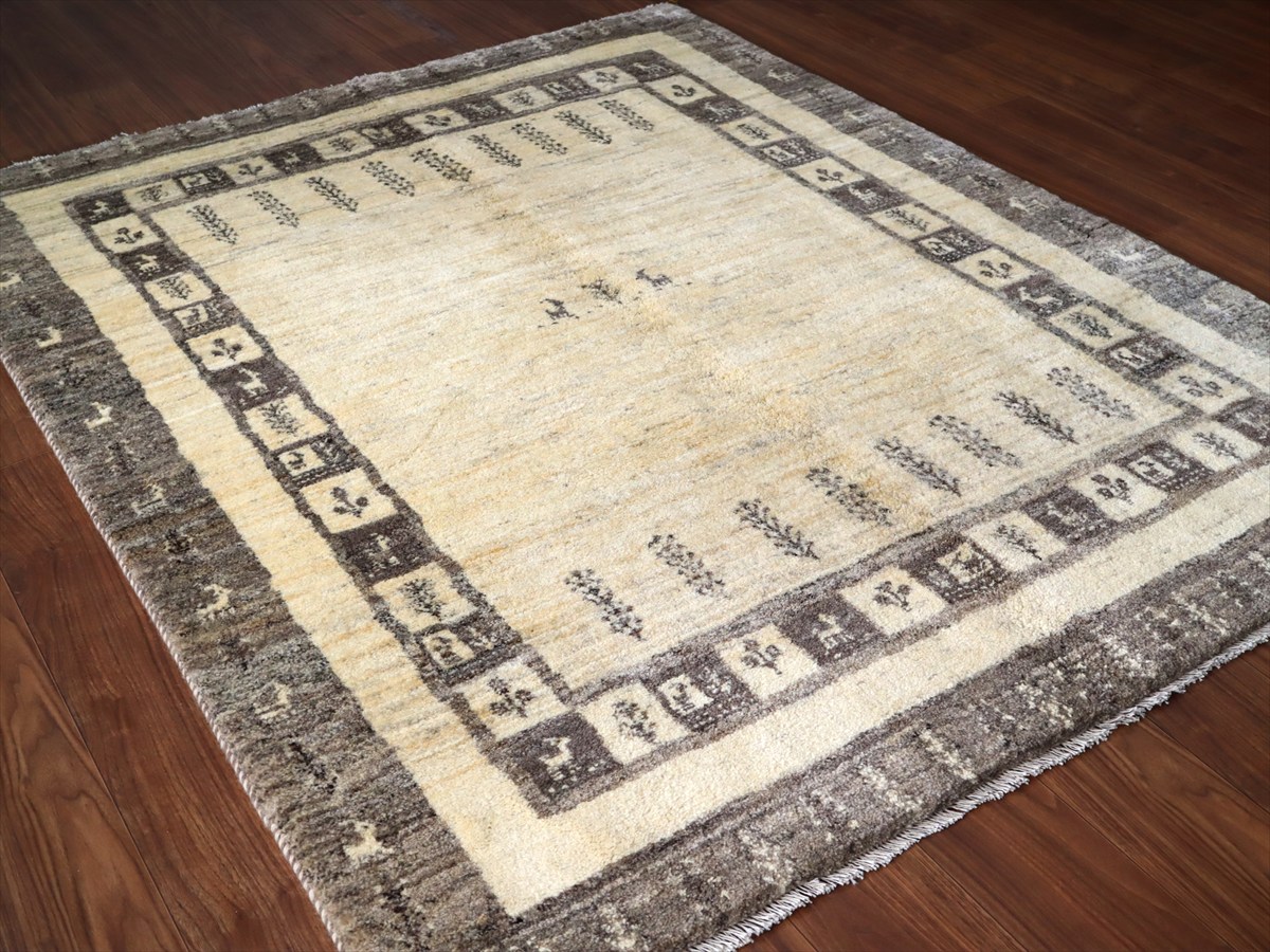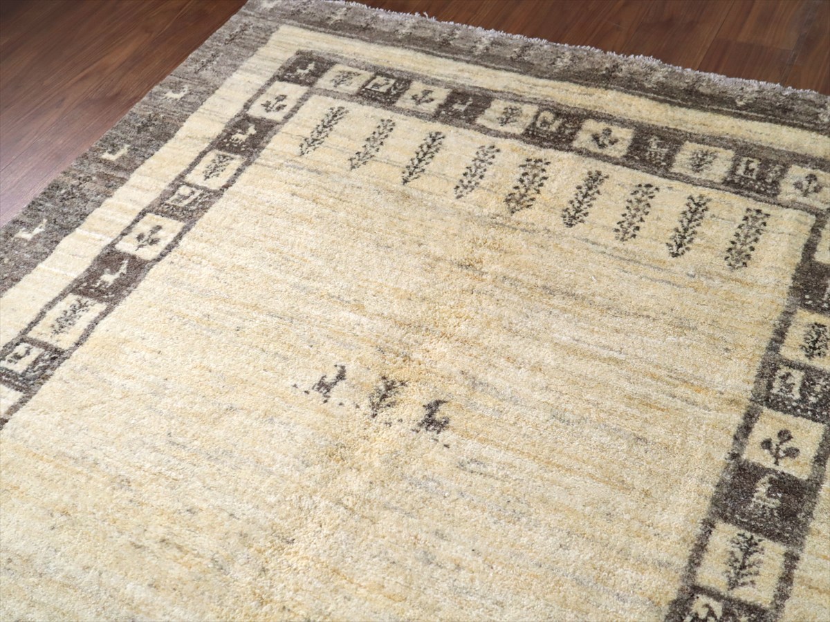羊毛の自然な色味を活かしたナチュラルアイボリー、グレーをベースに、ド物と生命の樹モチーフが額縁にもたくさん織られています。モチーフがたくさん織られていますが、ナチュラルアイボリーとグレーのトーンで落ち着いた雰囲気に仕上がっています。