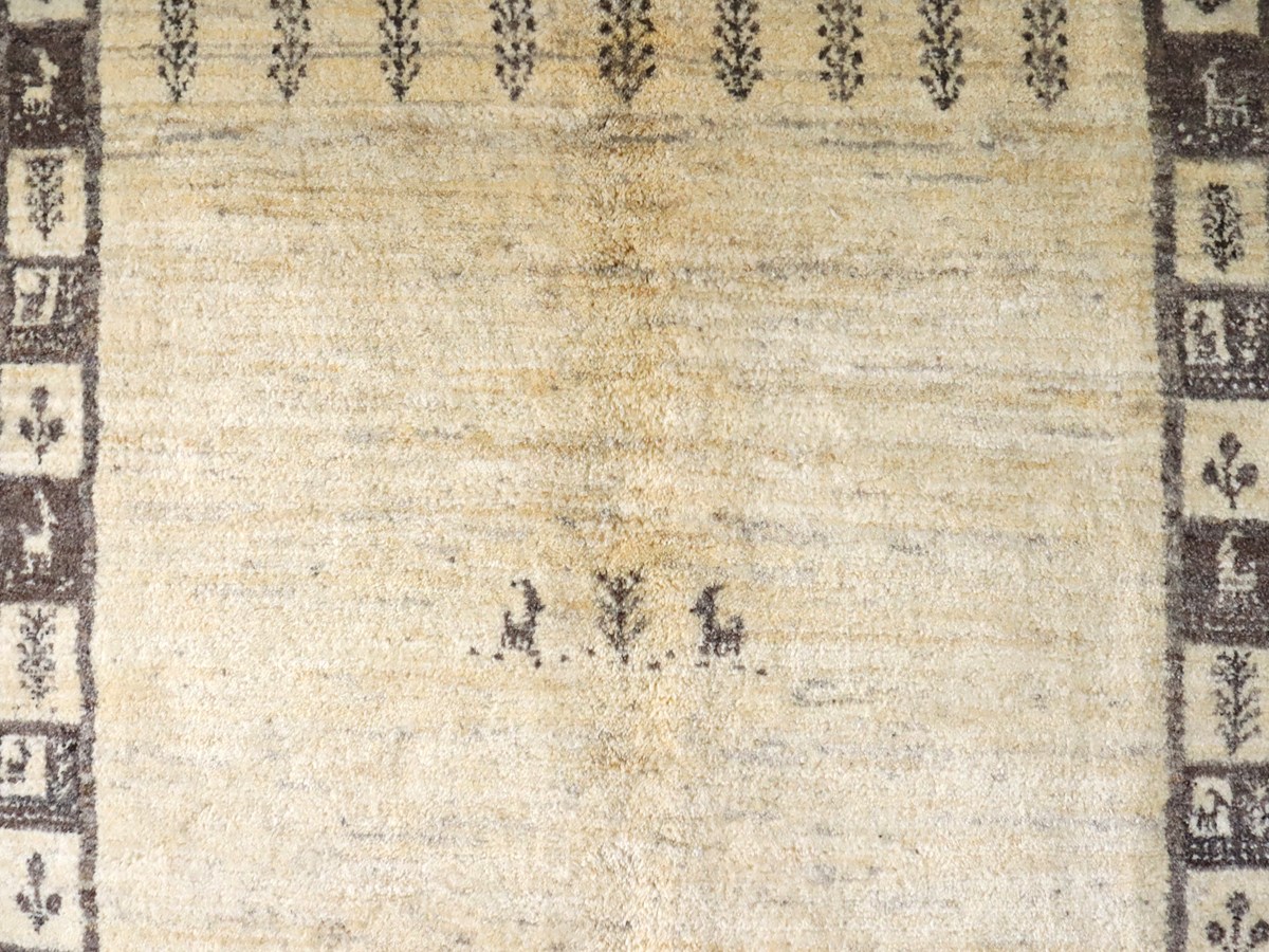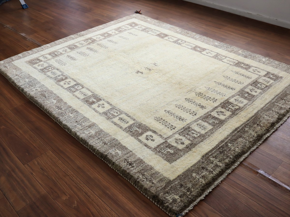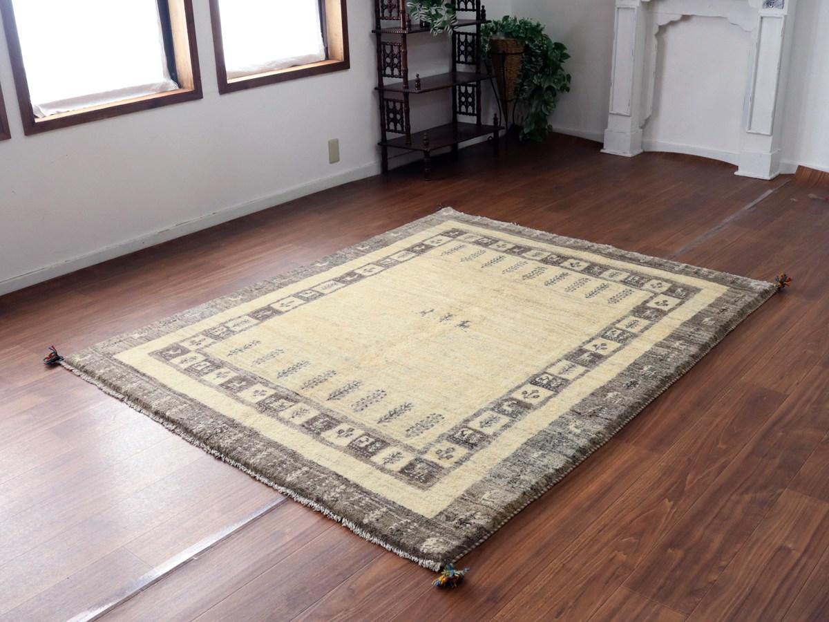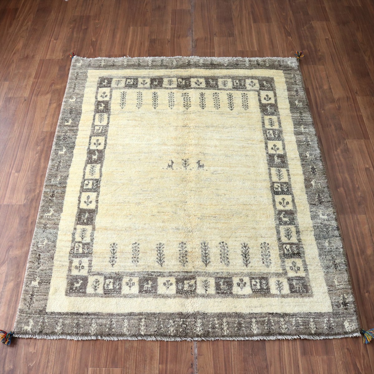 羊毛の自然な色味を活かしたナチュラルアイボリー、グレーをベースに、ド物と生命の樹モチーフが額縁にもたくさん織られています。モチーフがたくさん織られていますが、ナチュラルアイボリーとグレーのトーンで落ち着いた雰囲気に仕上がっています。