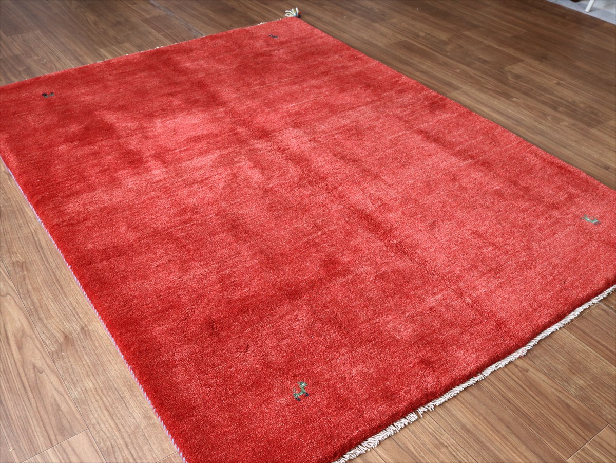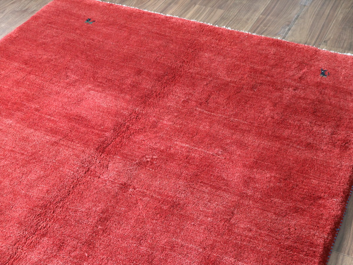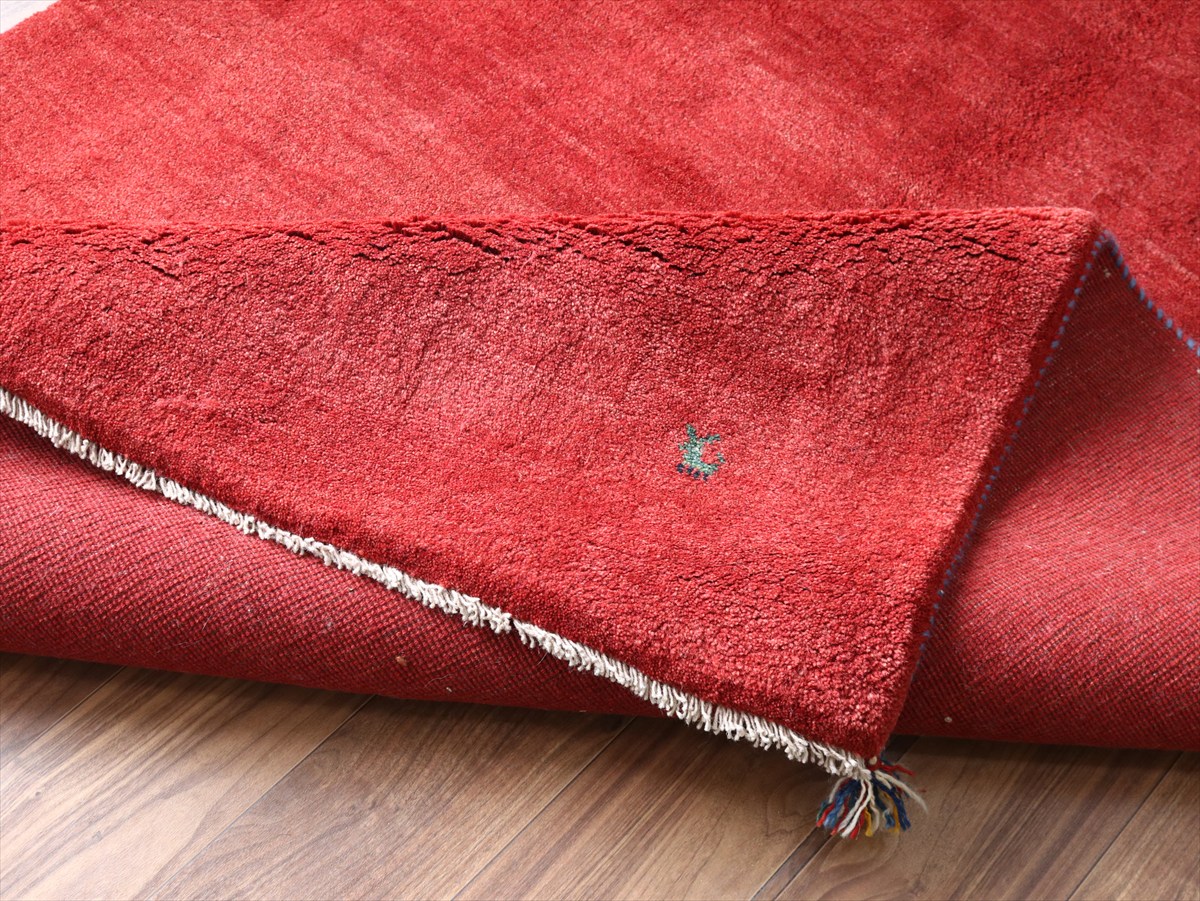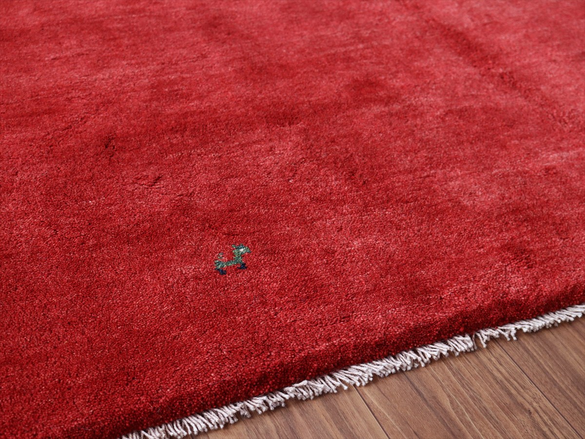 草木染めの染め色の濃淡を活かしたグラデーションがきれいな一枚。発色がよく、明るいイメージのレッドです。モチーフが四隅に入っているシンプルなデザインで、染めの濃淡による自然なグラデーションができています。明るいところで、パイル(毛足)の反対側からみると明るく見えます。