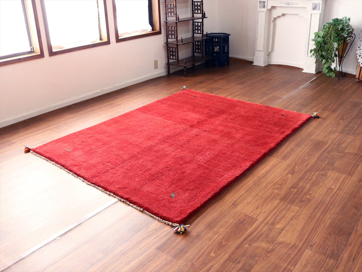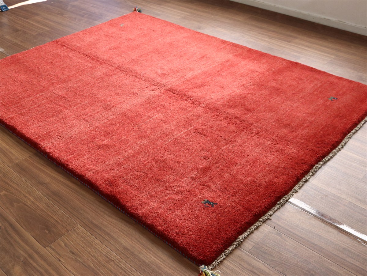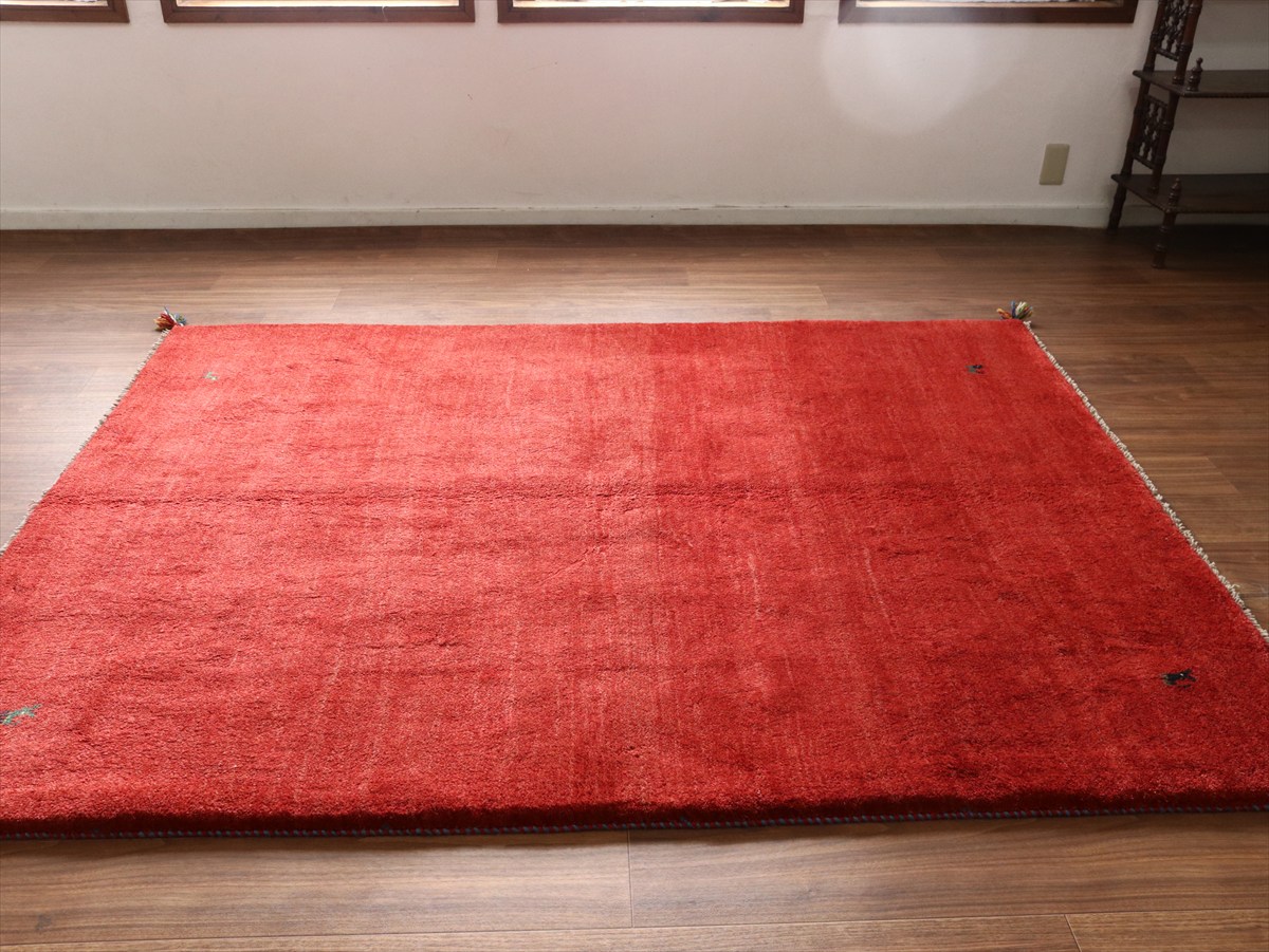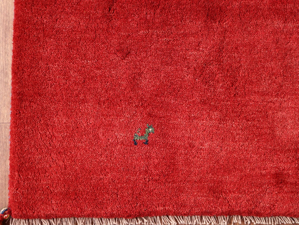 草木染めの染め色の濃淡を活かしたグラデーションがきれいな一枚。発色がよく、明るいイメージのレッドです。モチーフが四隅に入っているシンプルなデザインで、染めの濃淡による自然なグラデーションができています。明るいところで、パイル(毛足)の反対側からみると明るく見えます。