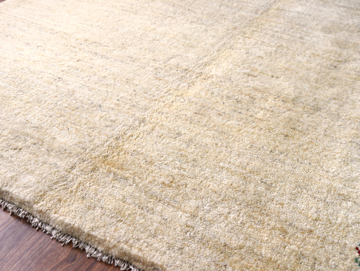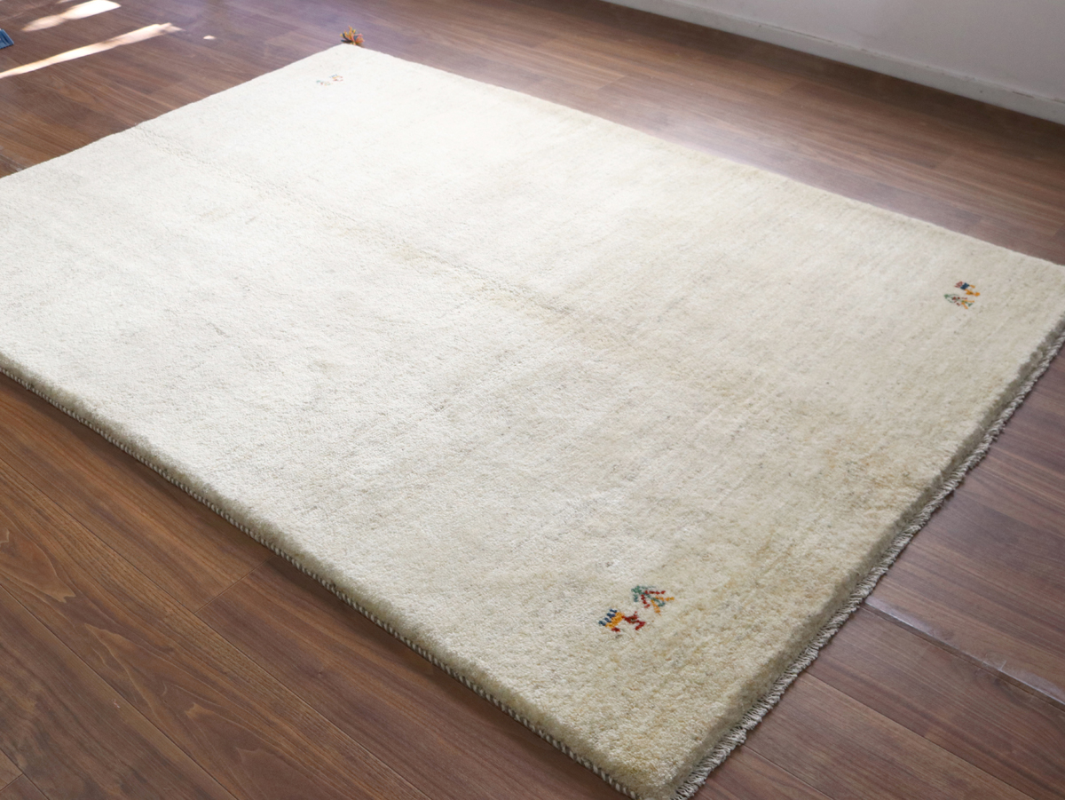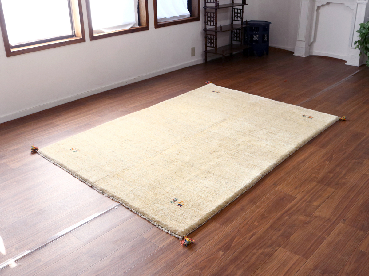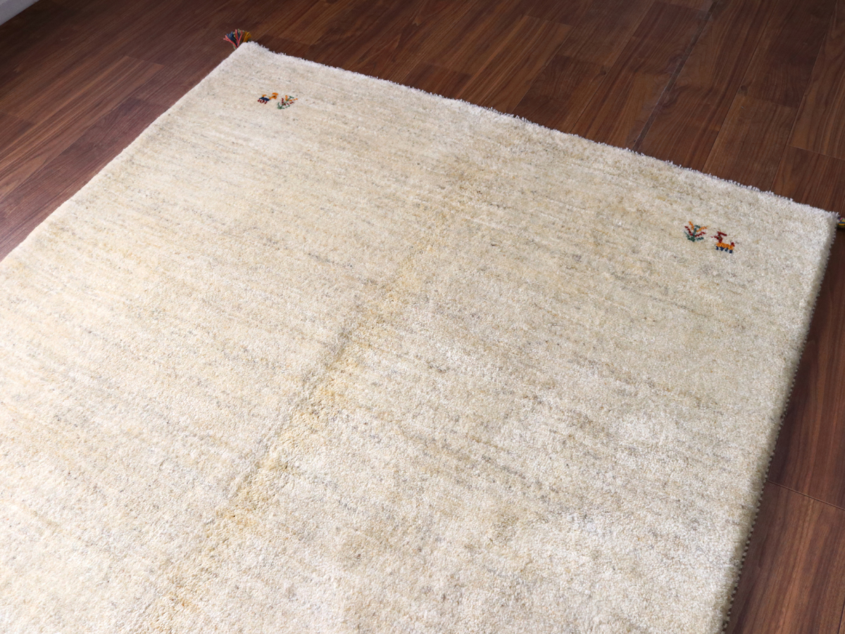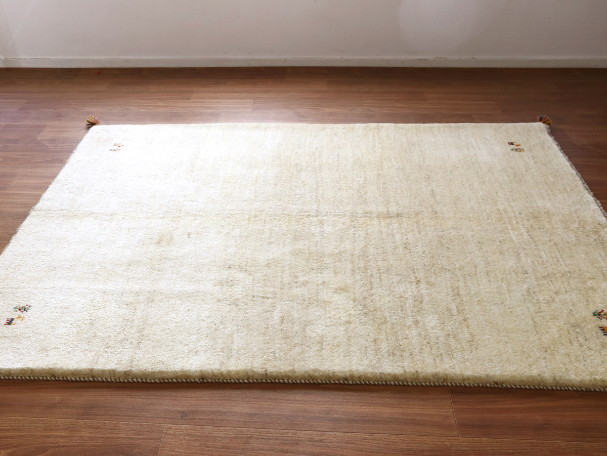 染めていない天然の羊毛の色をいかして織られたアイボリー色のギャッベです。シンプルなデザインながら、羊毛の色の濃淡が自然な感じに混ざり合っていて、ナチュラルであたたかみのある風合いに仕上がっています。