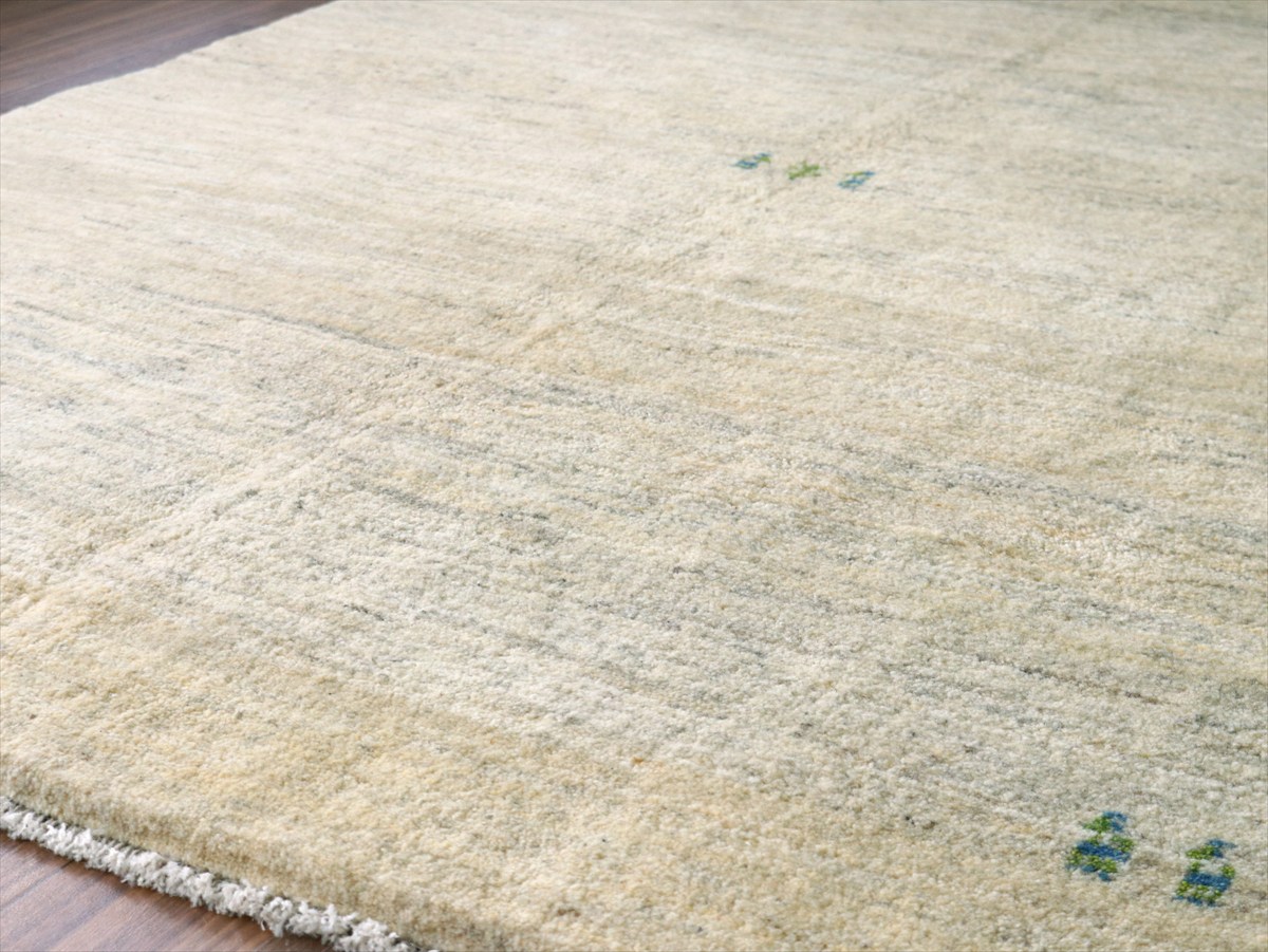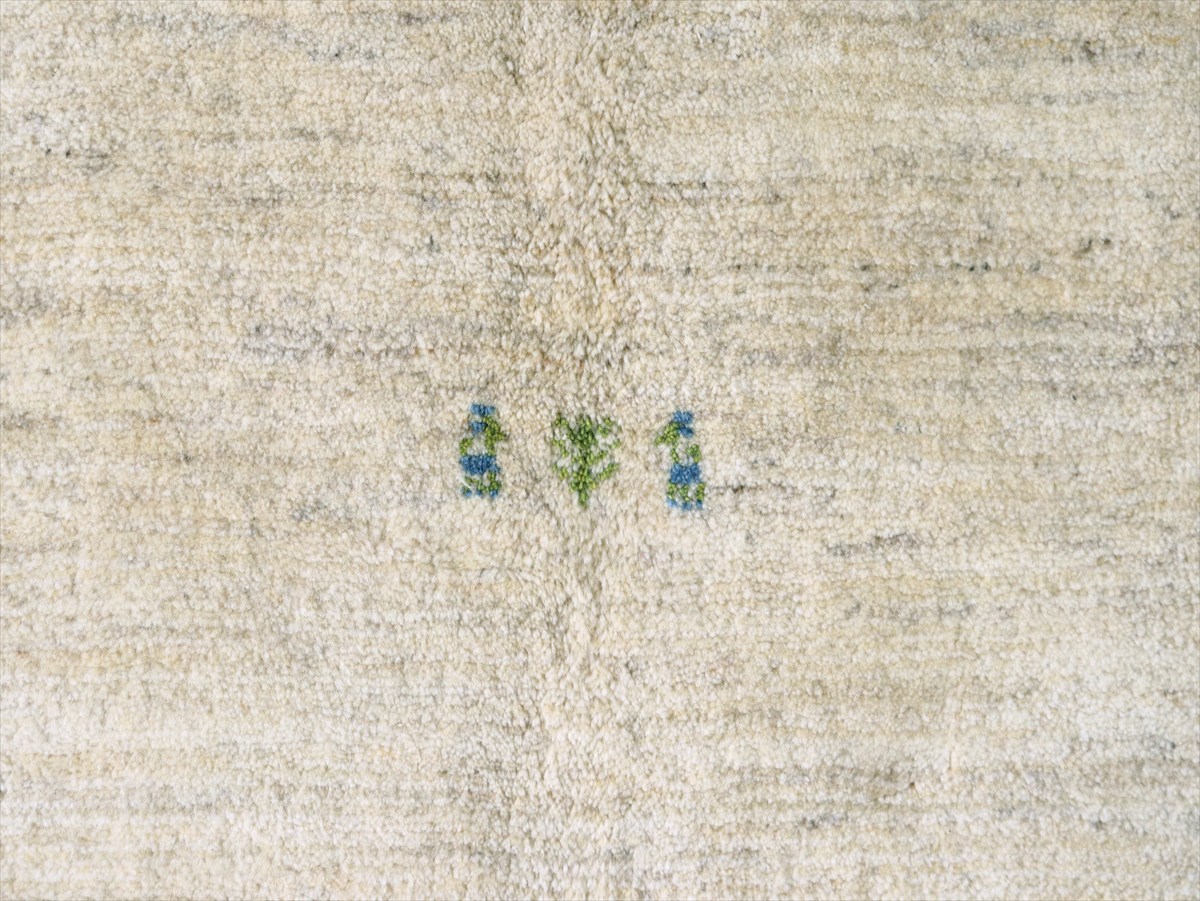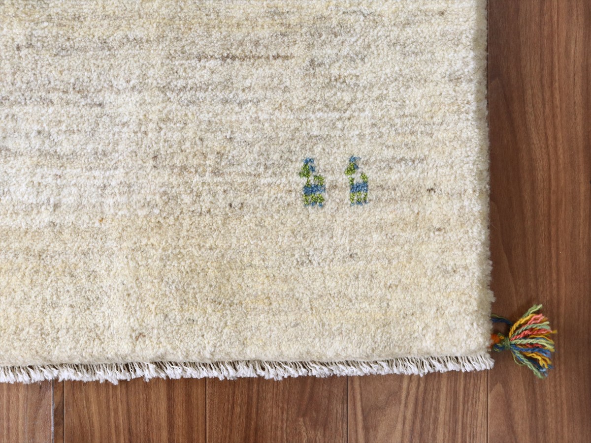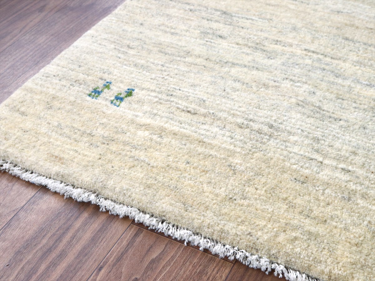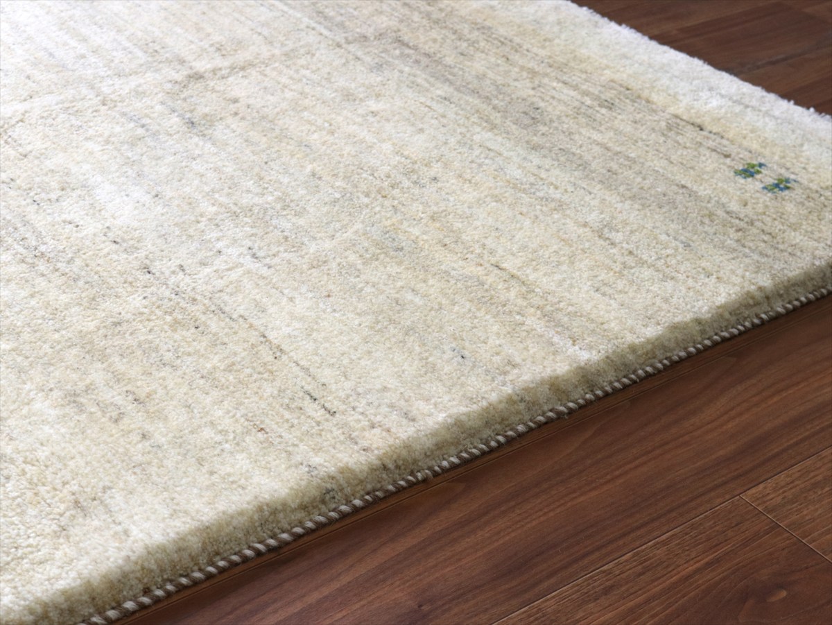 染めていない天然の羊毛の色をいかして織られたアイボリー色のギャッベです。シンプルなデザインながら、羊毛の色の濃淡が自然な感じに混ざり合っていて、ナチュラルであたたかみのある風合いに仕上がっています。