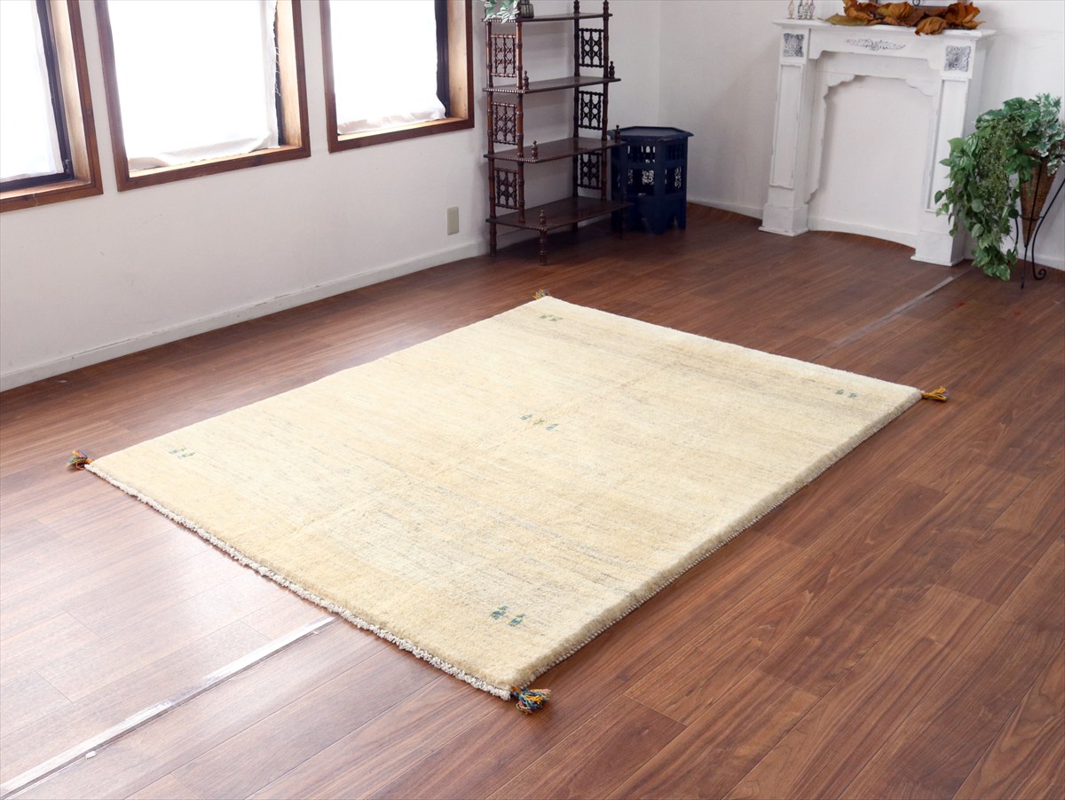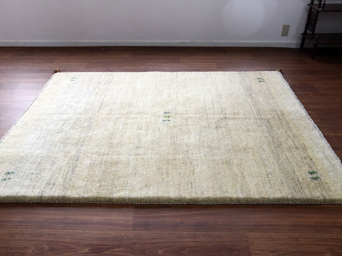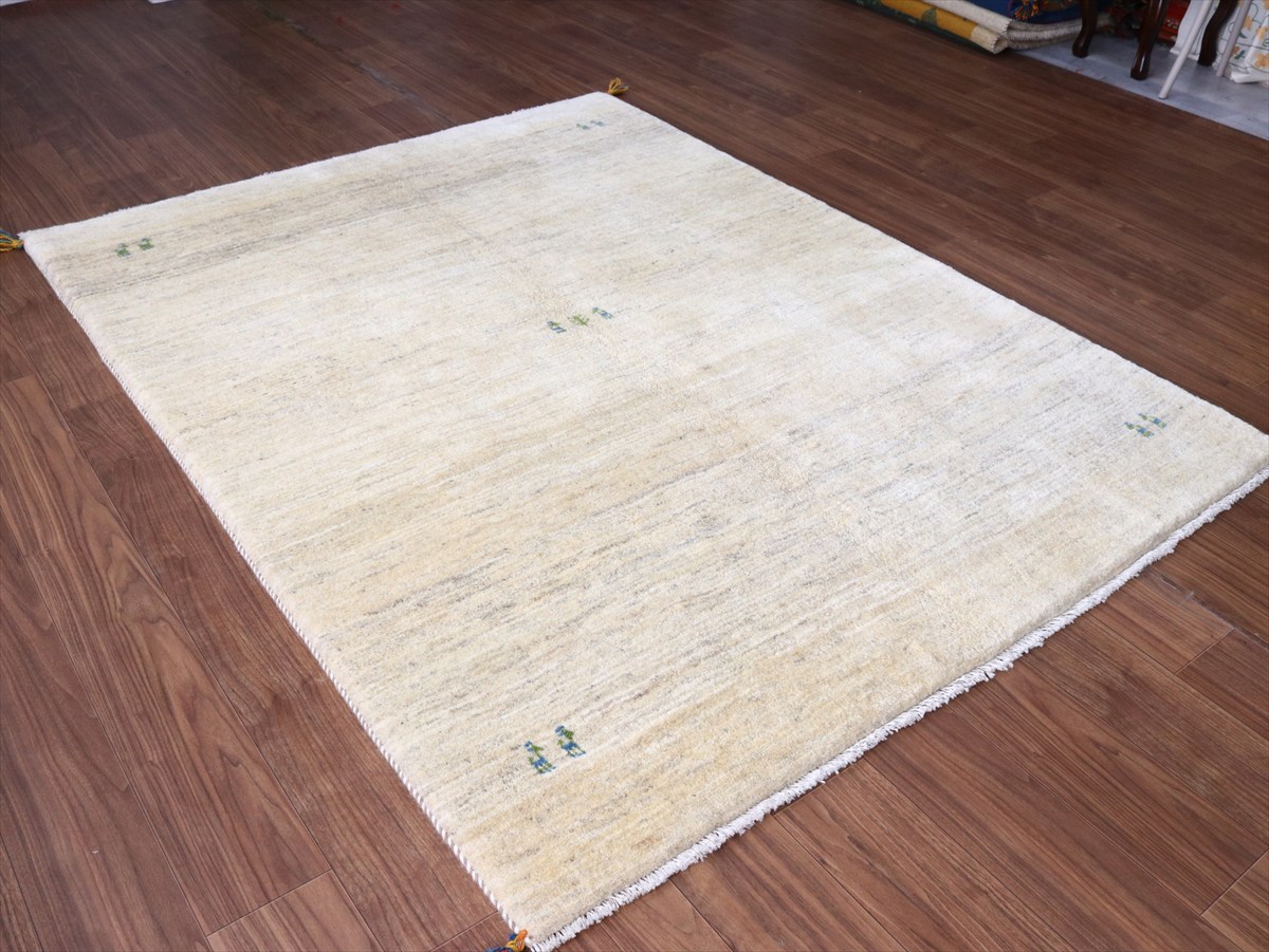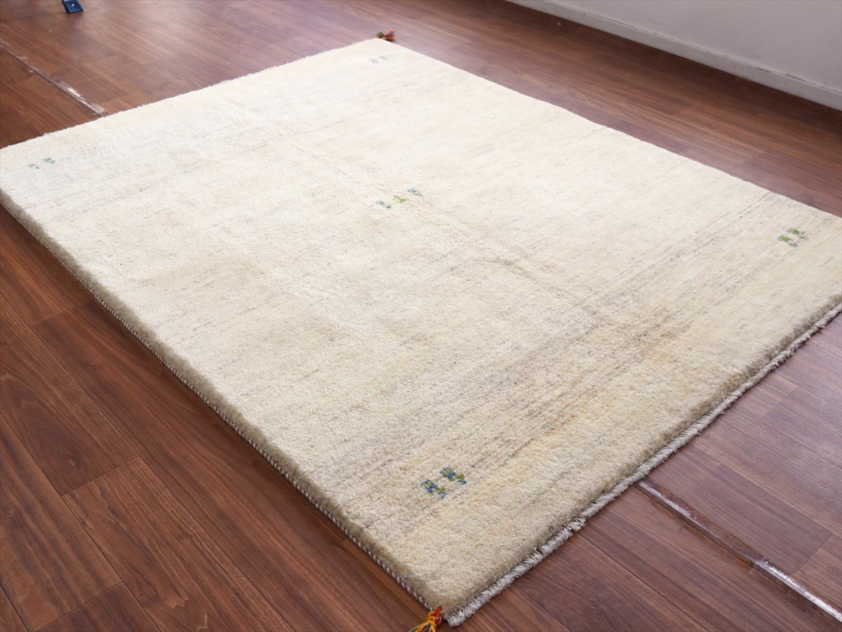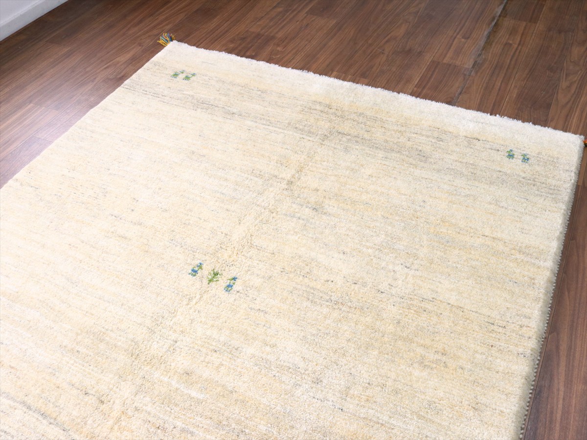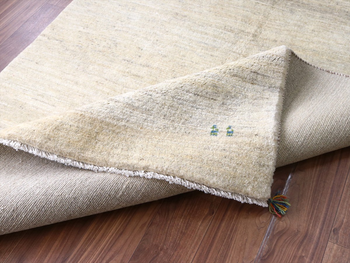 染めていない天然の羊毛の色をいかして織られたアイボリー色のギャッベです。シンプルなデザインながら、羊毛の色の濃淡が自然な感じに混ざり合っていて、ナチュラルであたたかみのある風合いに仕上がっています。
