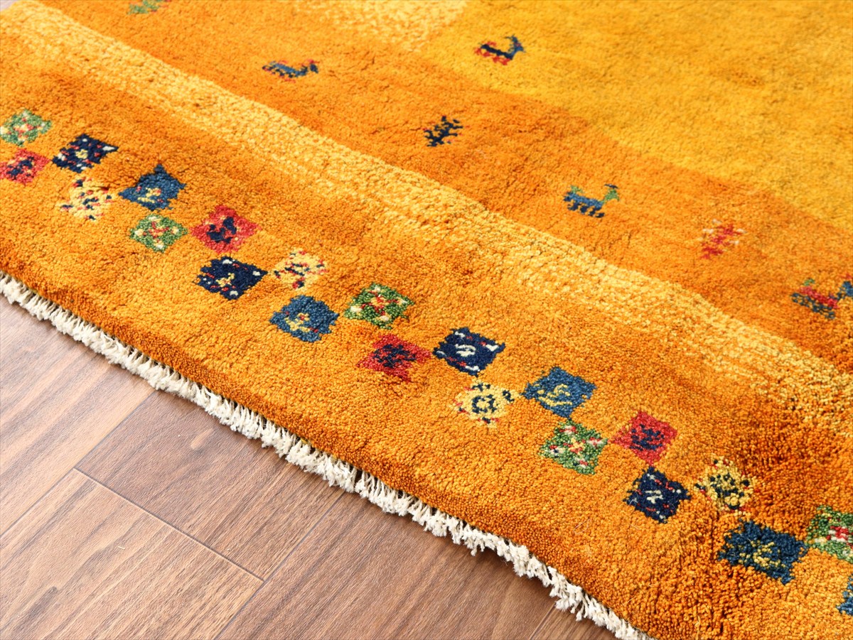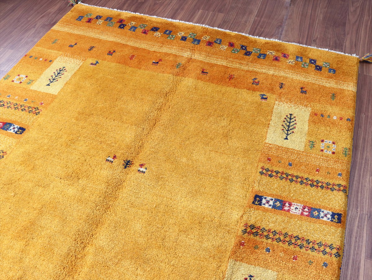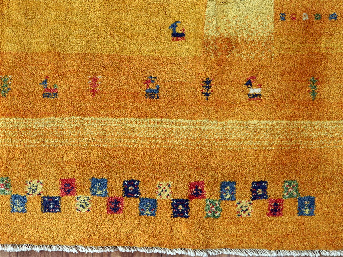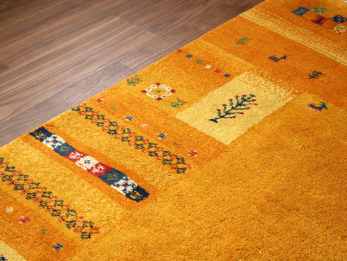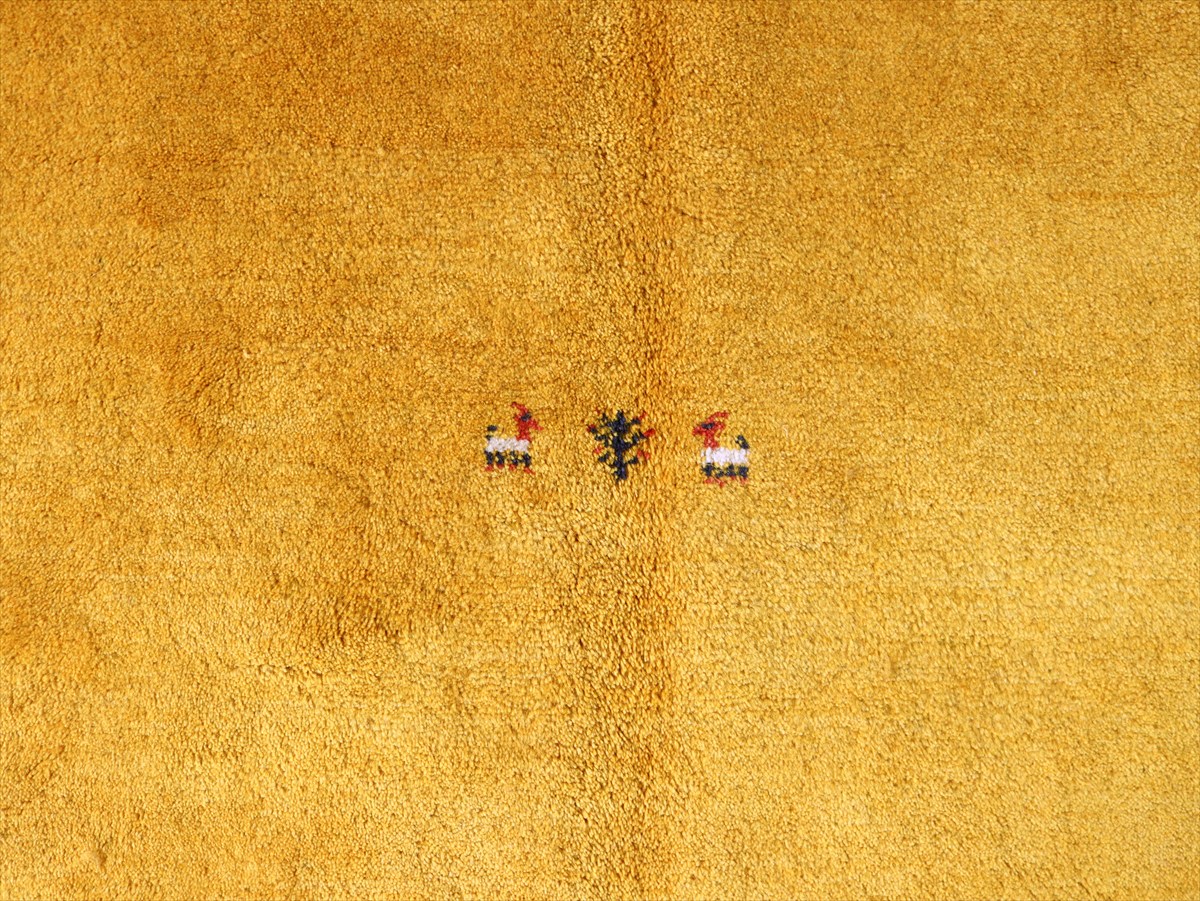 発色のよい明るいイエローとオレンジをベースに、額のデザインが凝っており、カラフルなタイルの中には動物や生命の樹が織られています。上下にもカラフルなモチーフがたくさん織られています。