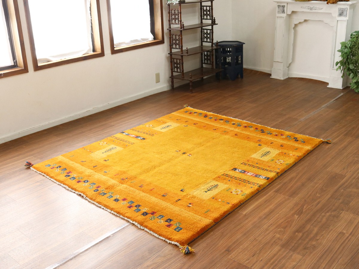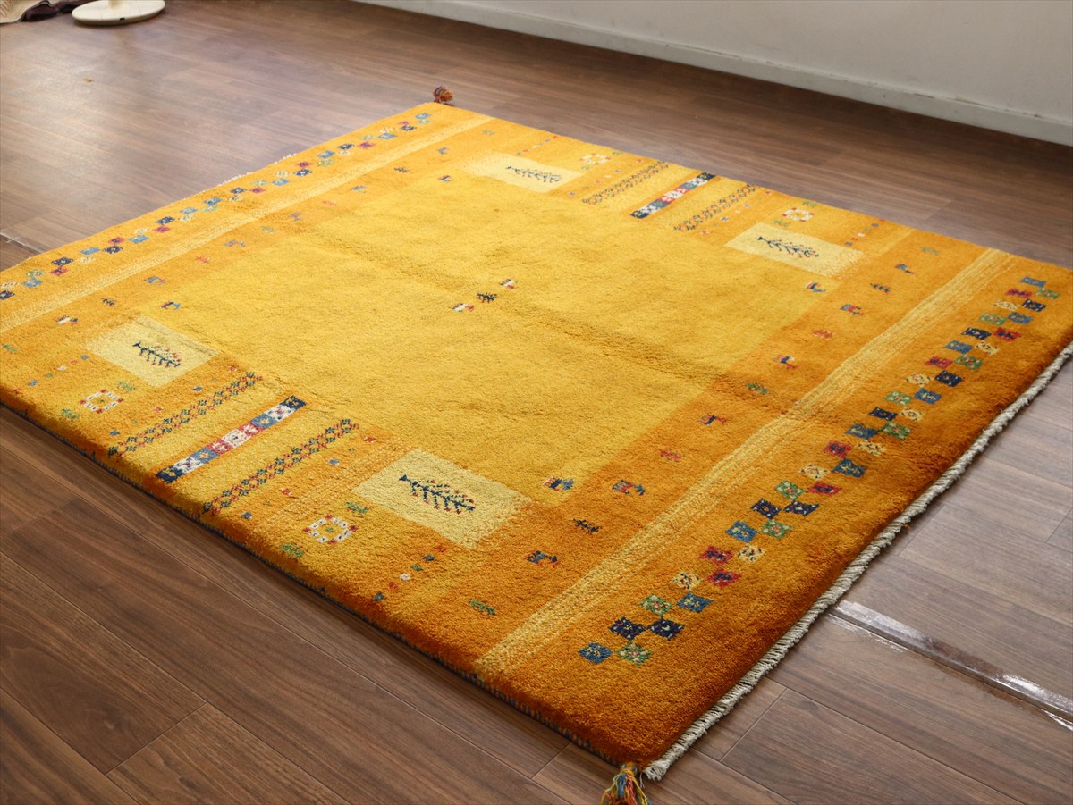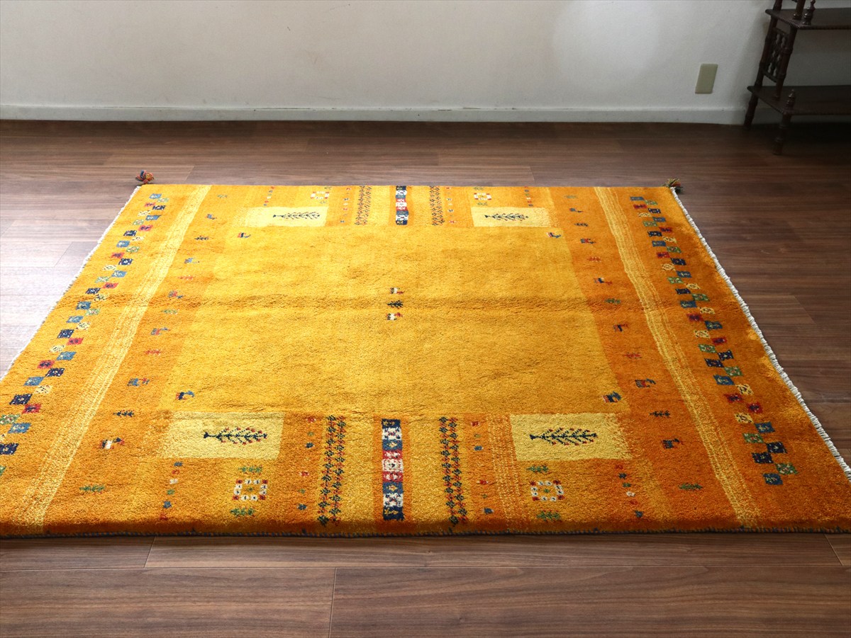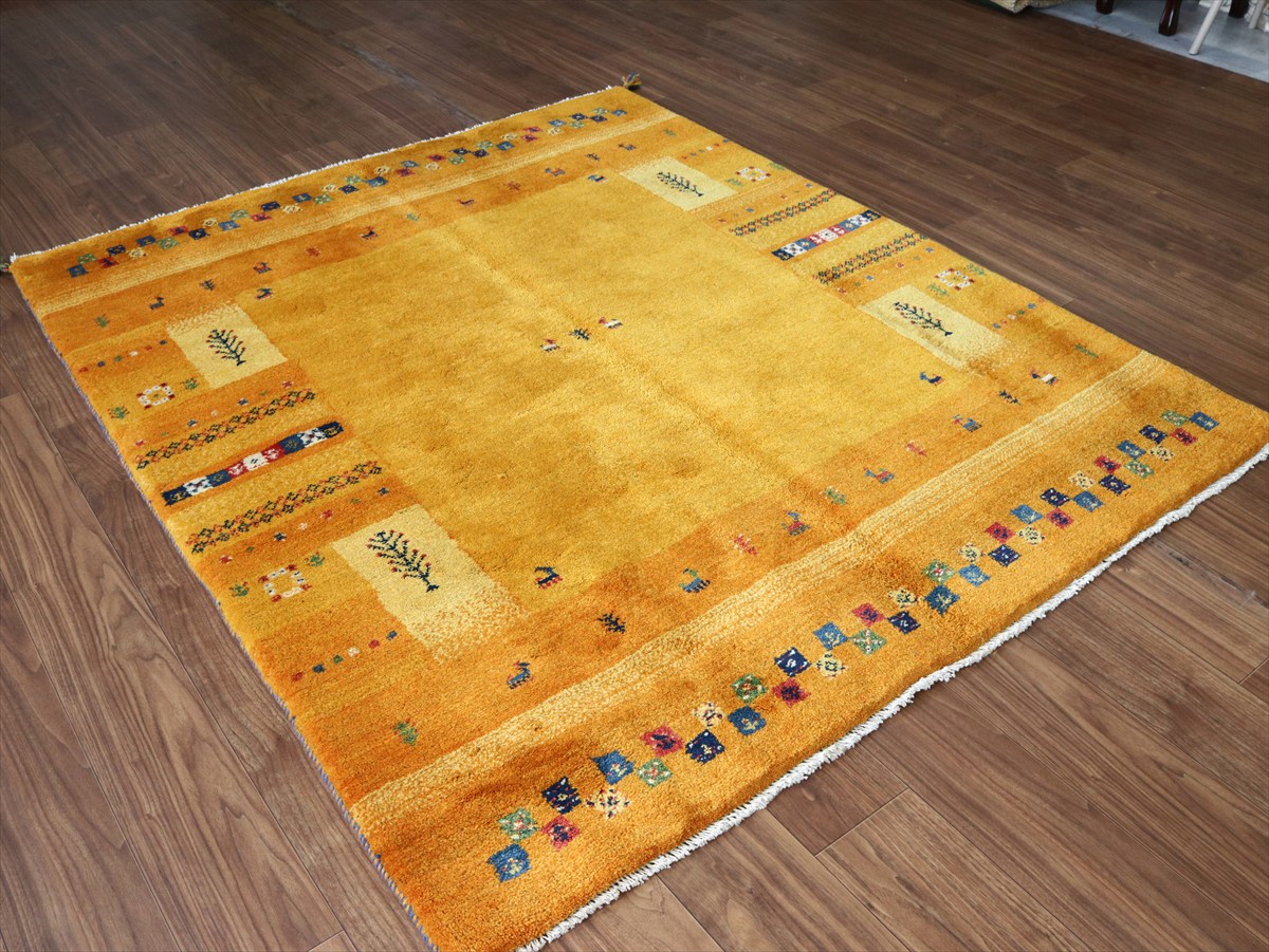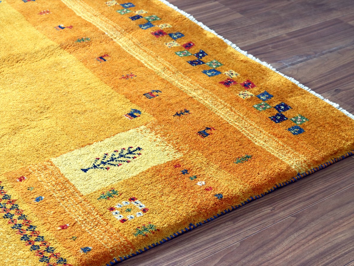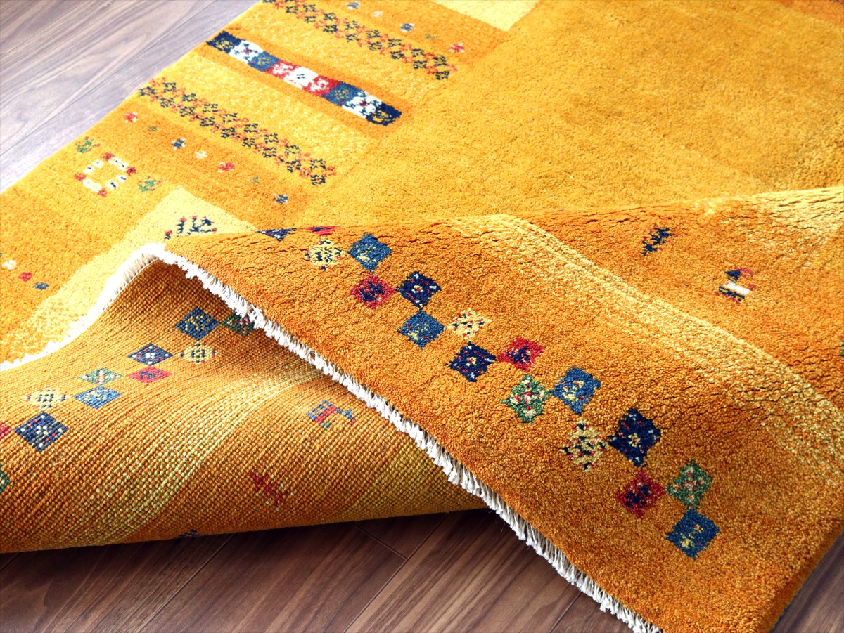 発色のよい明るいイエローとオレンジをベースに、額のデザインが凝っており、カラフルなタイルの中には動物や生命の樹が織られています。上下にもカラフルなモチーフがたくさん織られています。