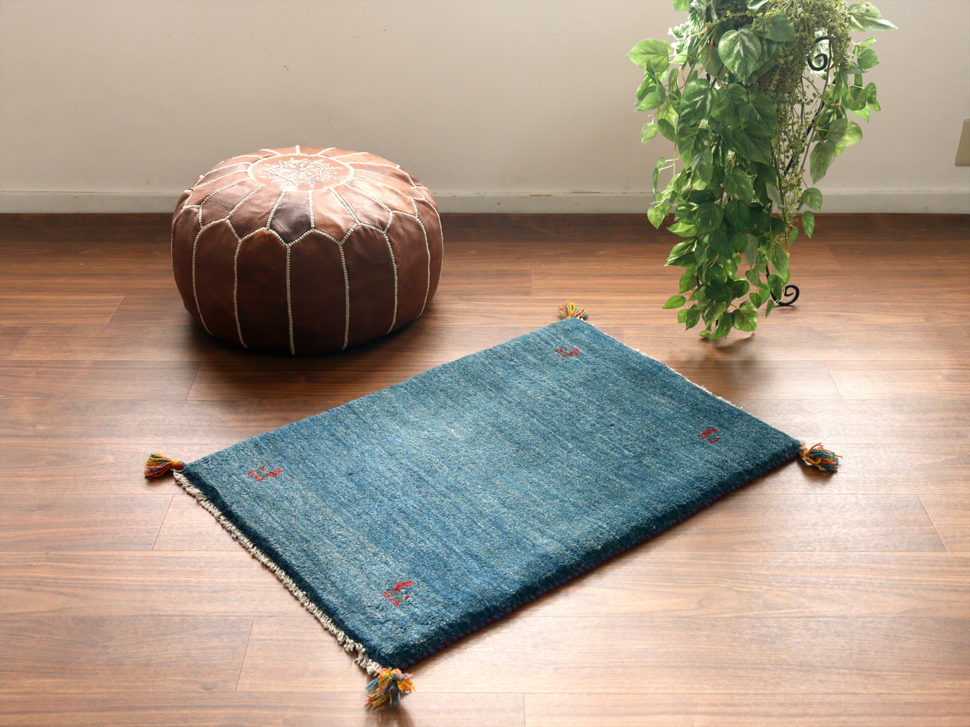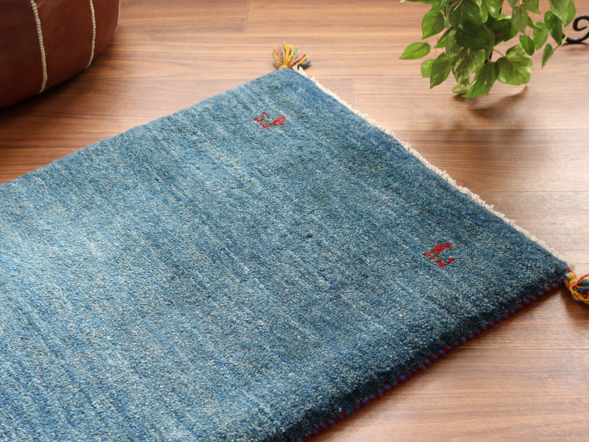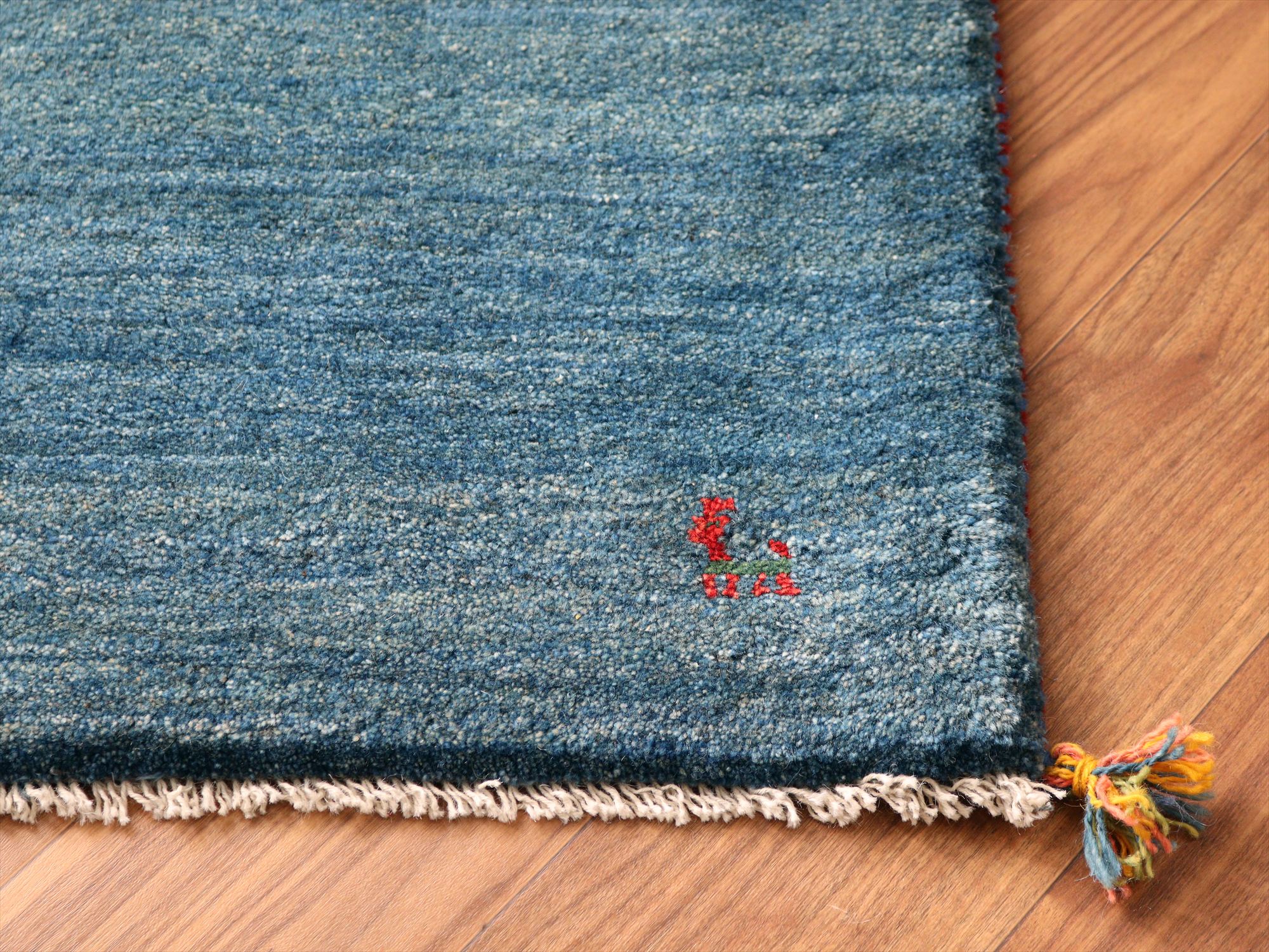 ギャッベ イラン産手織りラグ 90x62cm ブルー シンプルモチーフ