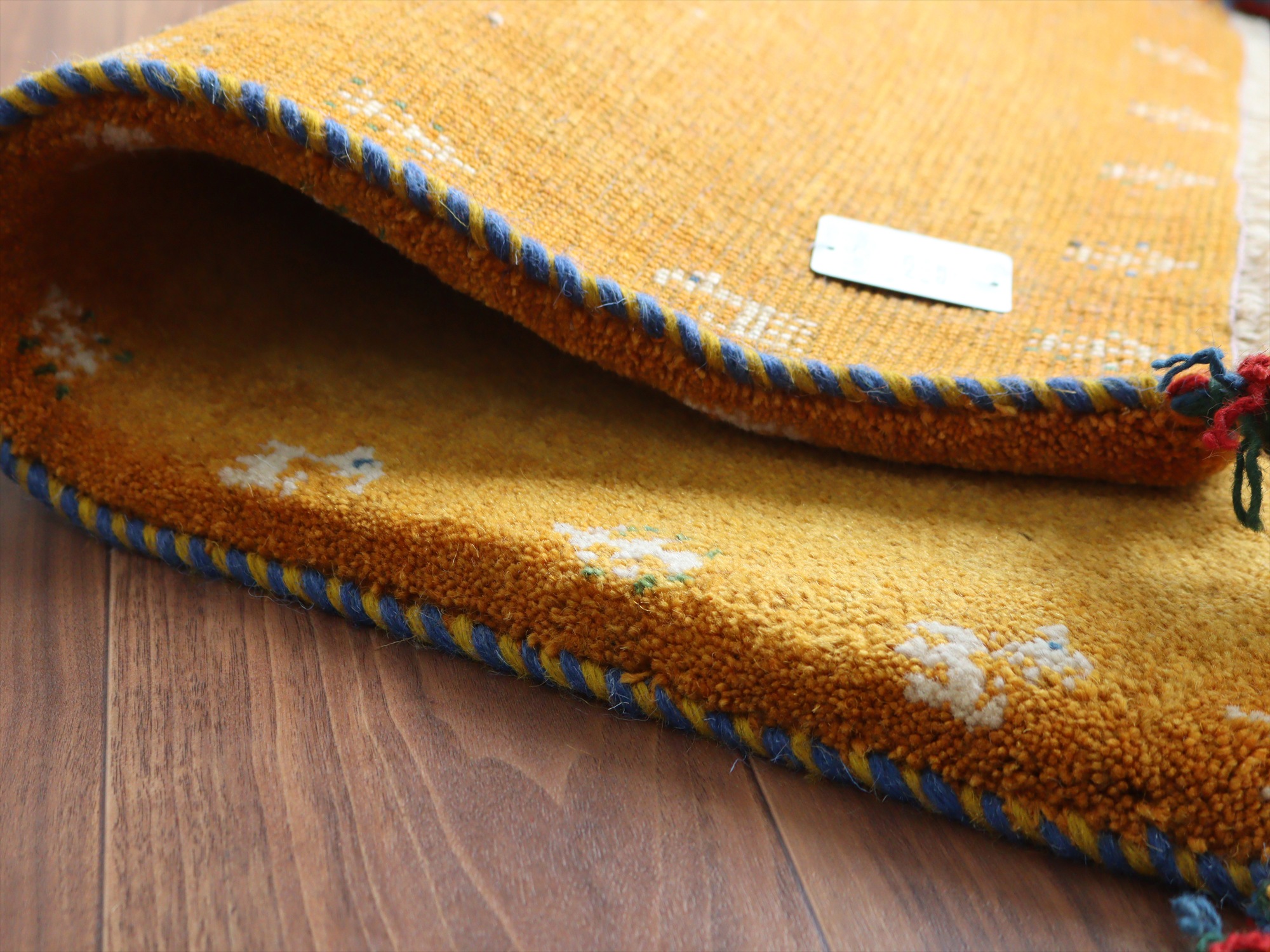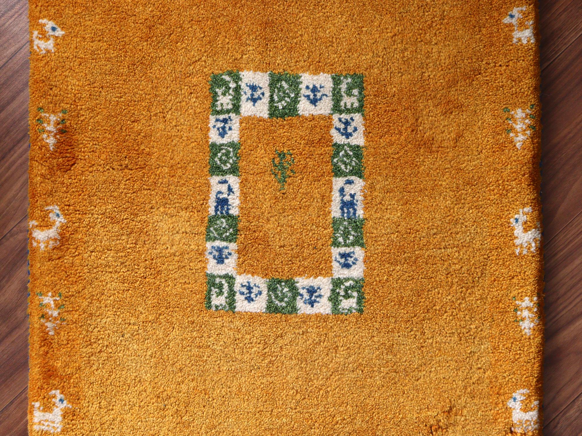 濃淡のあるイエローベースに、羊と生命の樹のタイル額縁部分にもモチーフが織られた1枚。縁ギリギリに織られているのが印象的です。