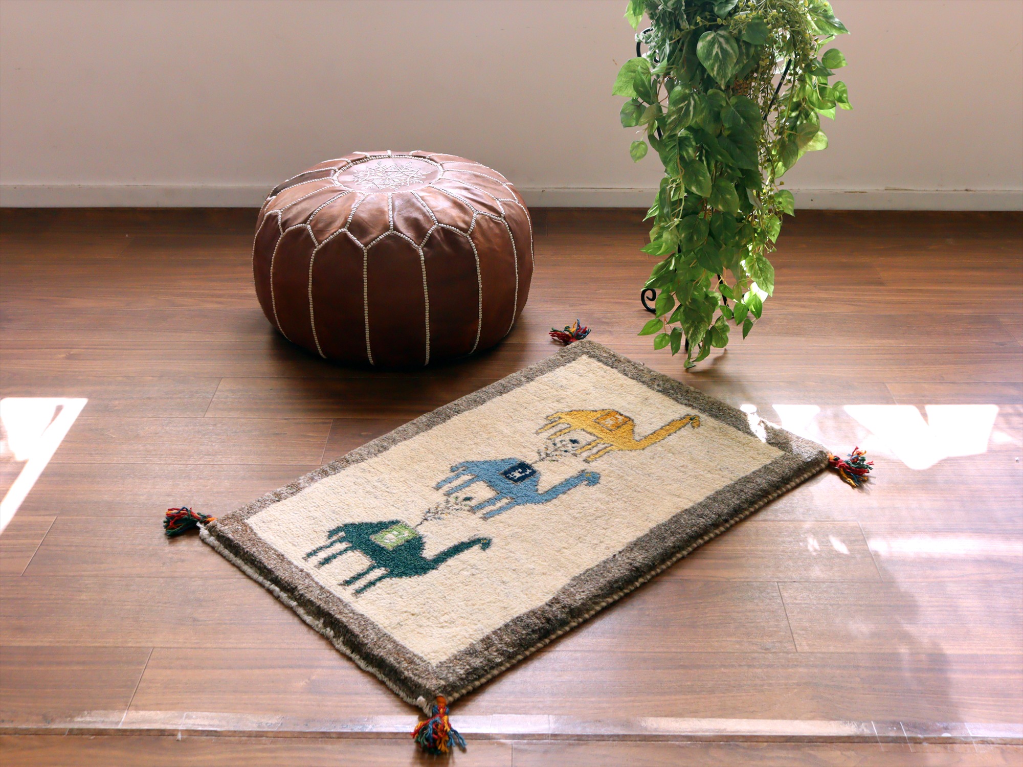 染めていない羊毛ベースにラクダが3頭織られています。ラクダのコブの上には花が咲き、ユニークなデザインです。