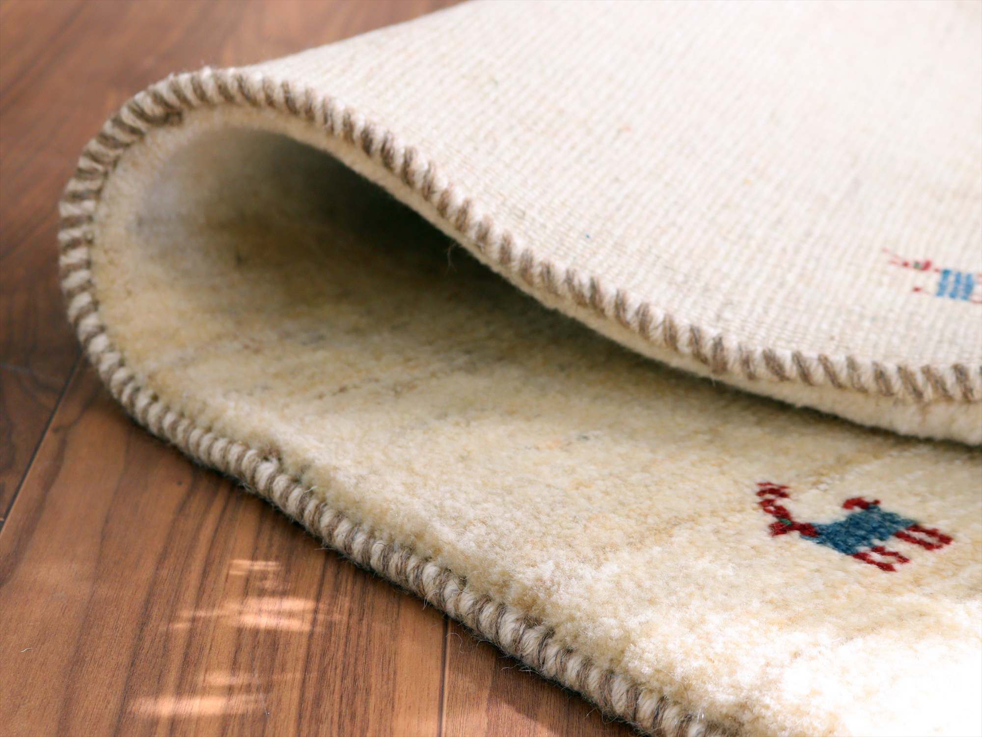 染めていない羊毛ベースの四隅に羊が織られたシンプルなデザイン。