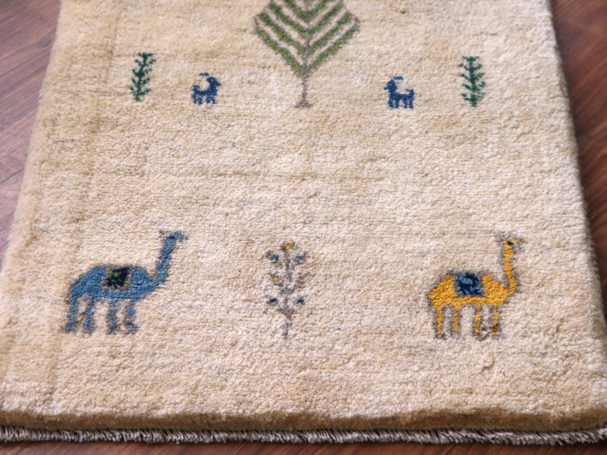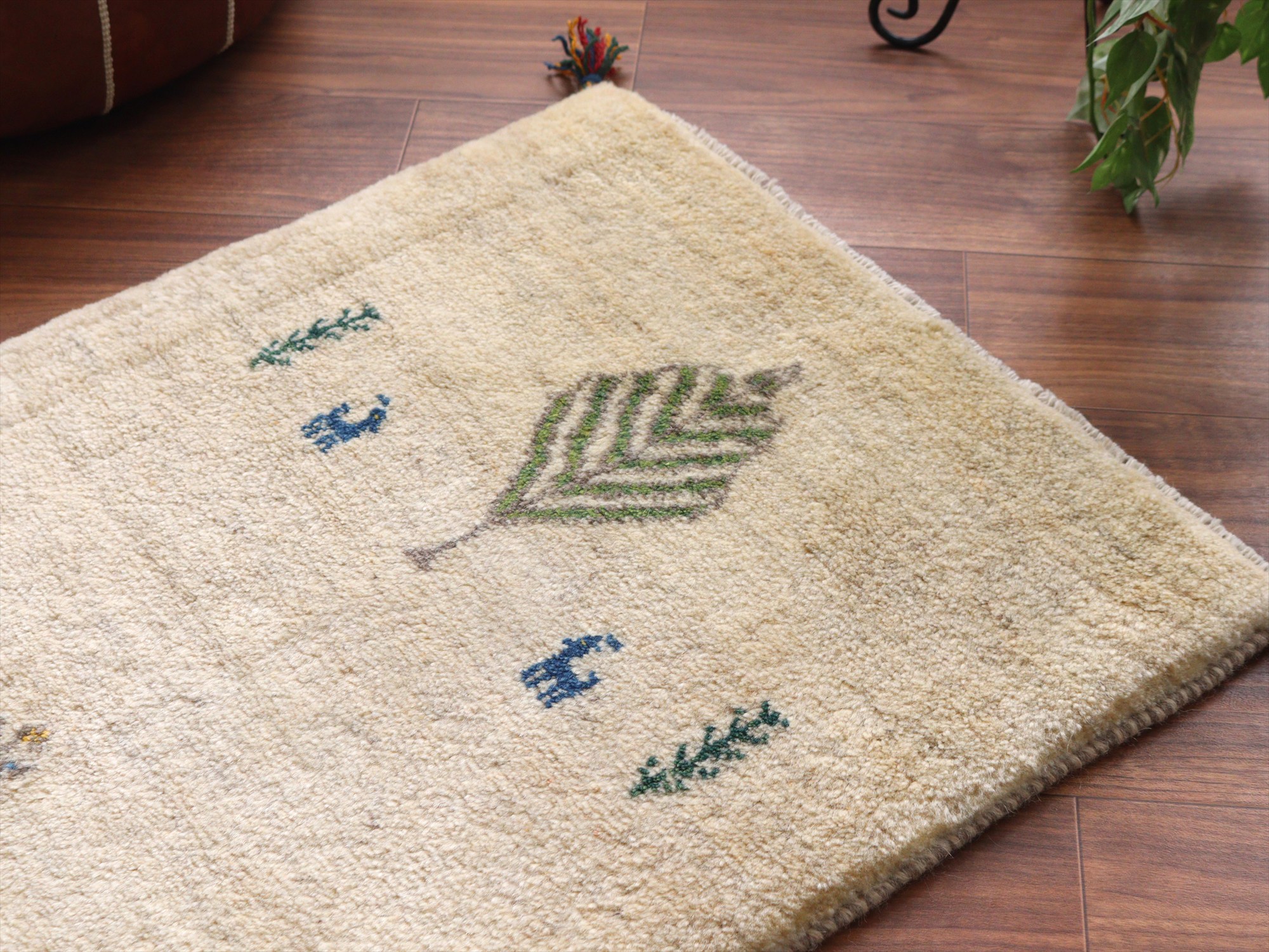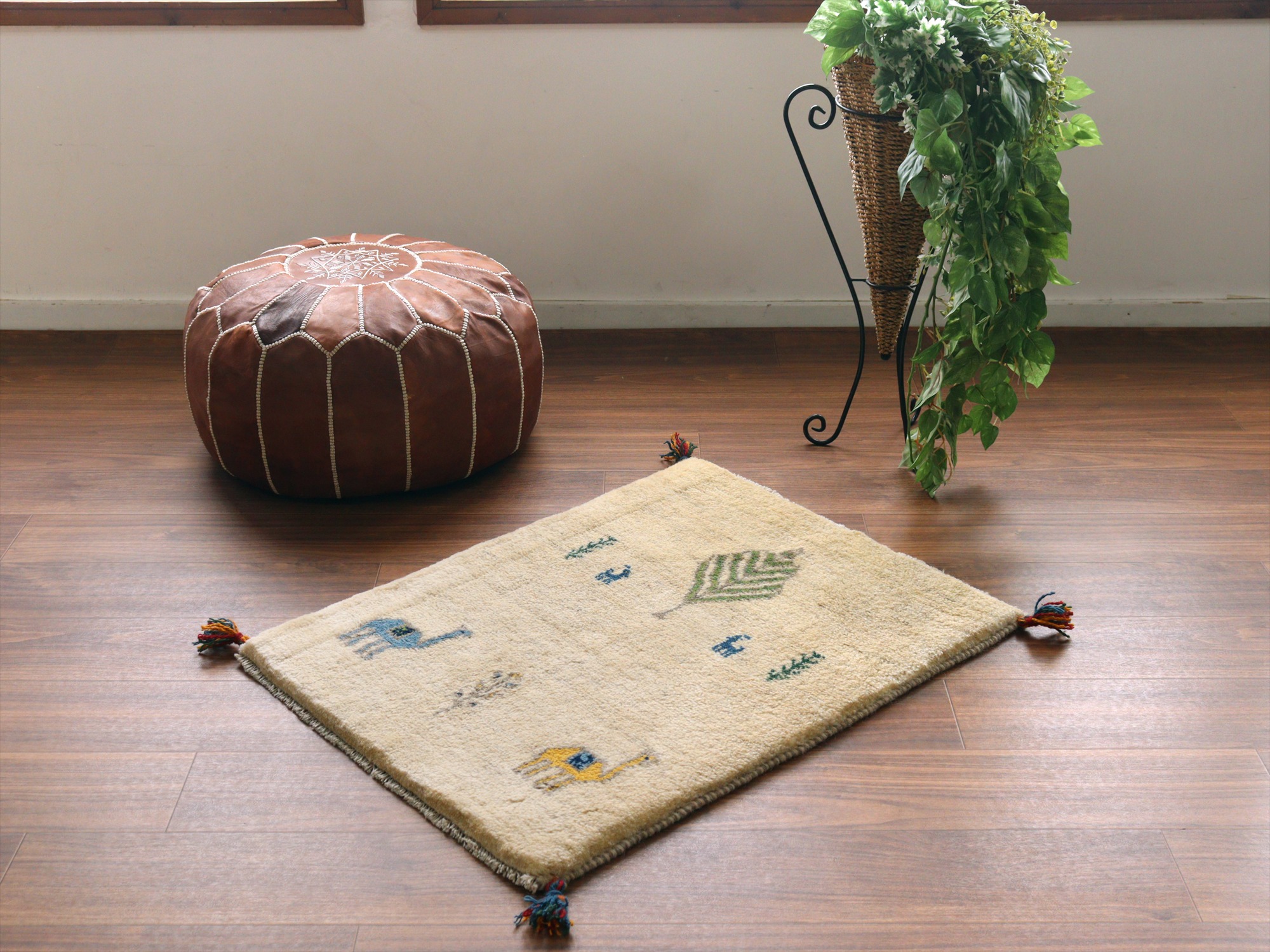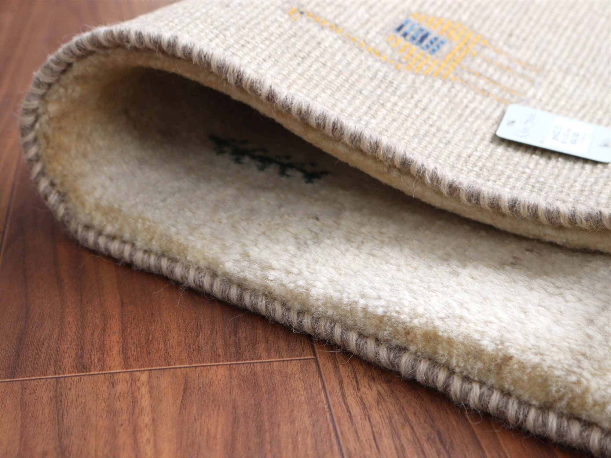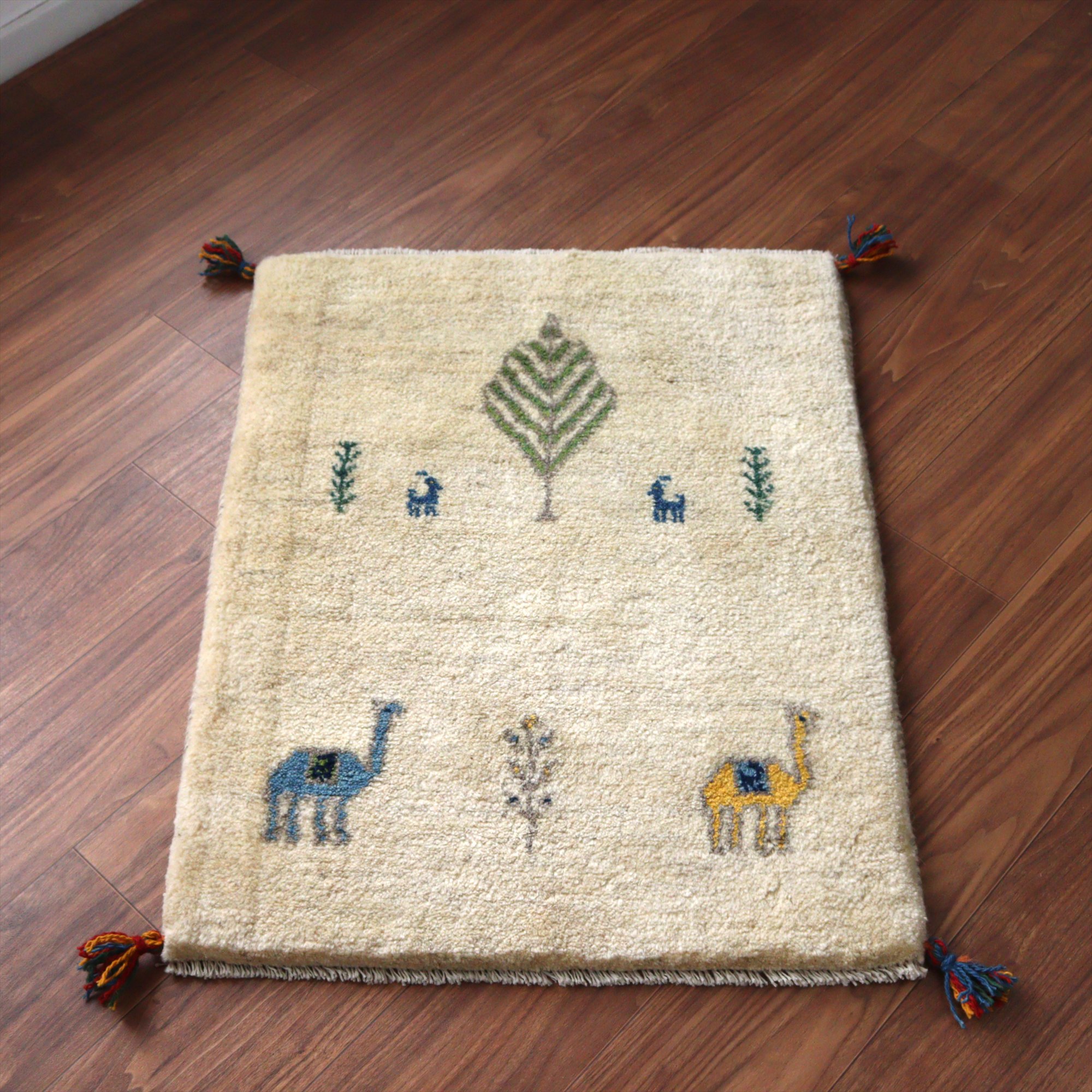 染めていない羊毛ベースに、ラクダや羊、それに植物が織られたデザイン。色使いが落ち着いていて、お部屋のアクセントに加えやすそうな1枚です。