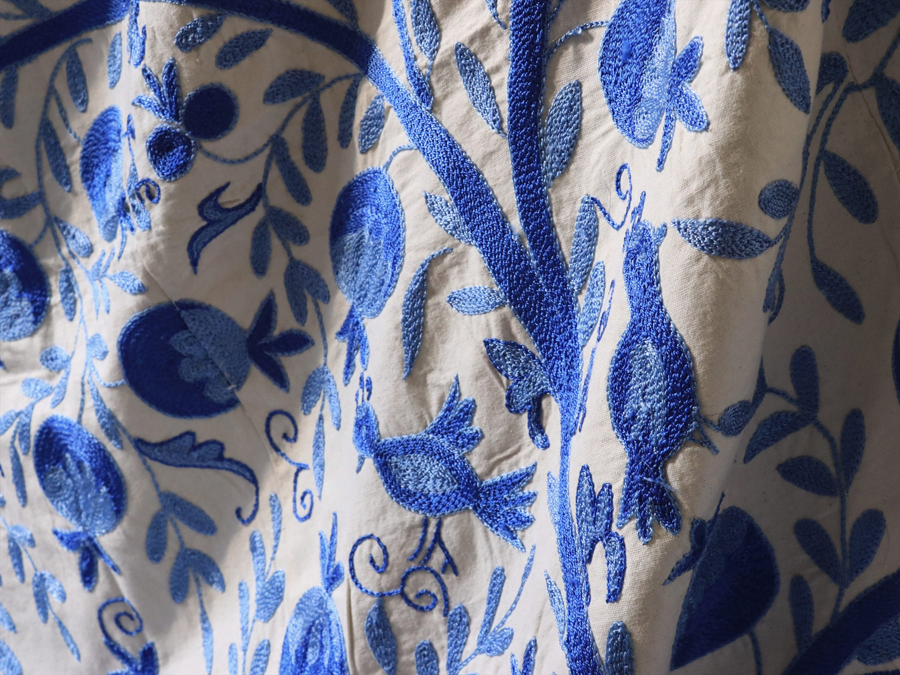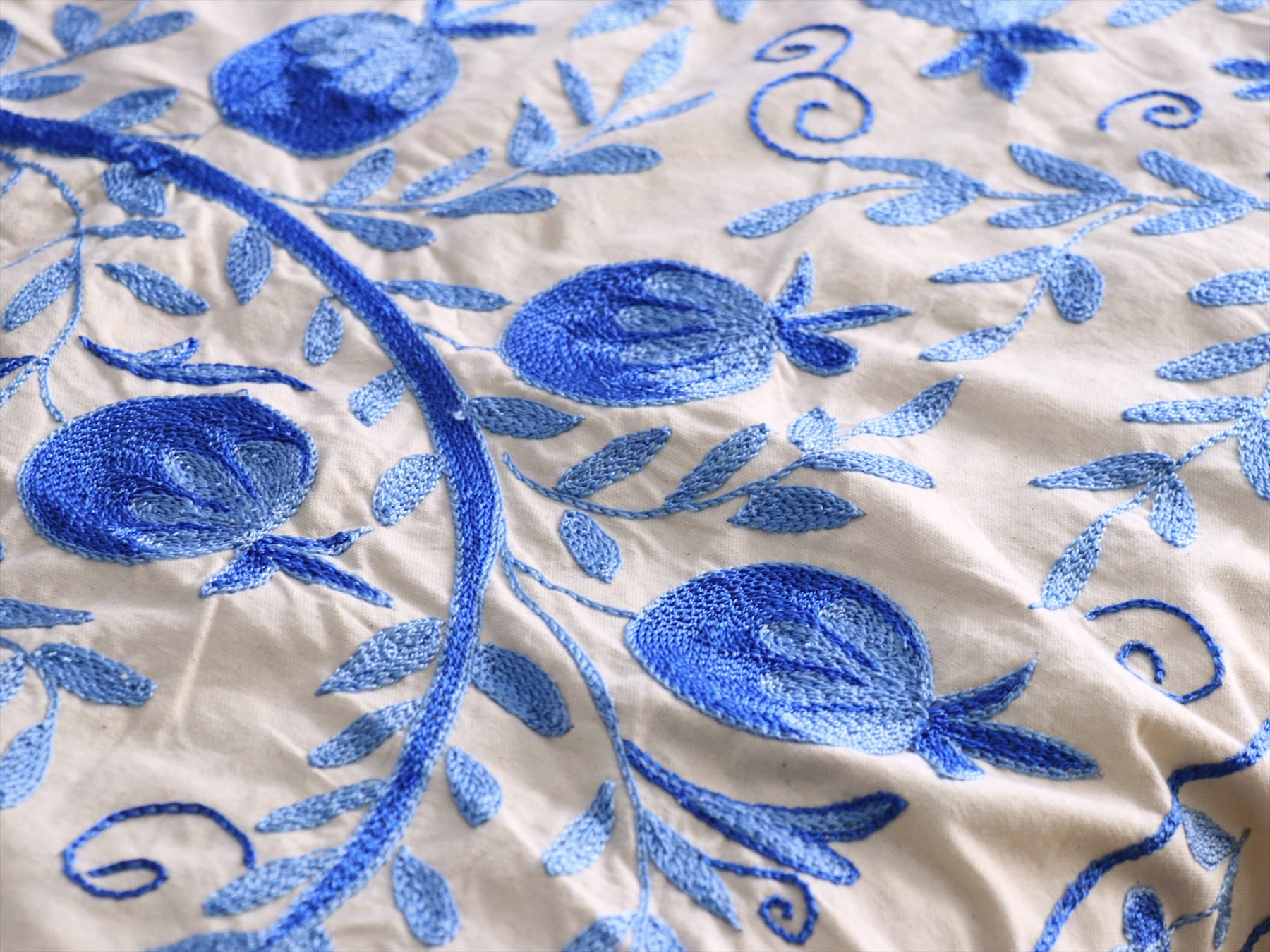 中央アジア・ウズベキスタン共和国で作られたシルク糸の手刺繍布「スザンニ」。アンティークリプロダクションは、主に18世紀中ごろから19世紀末にかけて作られたスザンニのデザインをを再現したもので、一時は途絶えてしまった伝統が、ソヴィエトから独立した1991年以降に再び取り戻され、現代に受け継がれているものです。