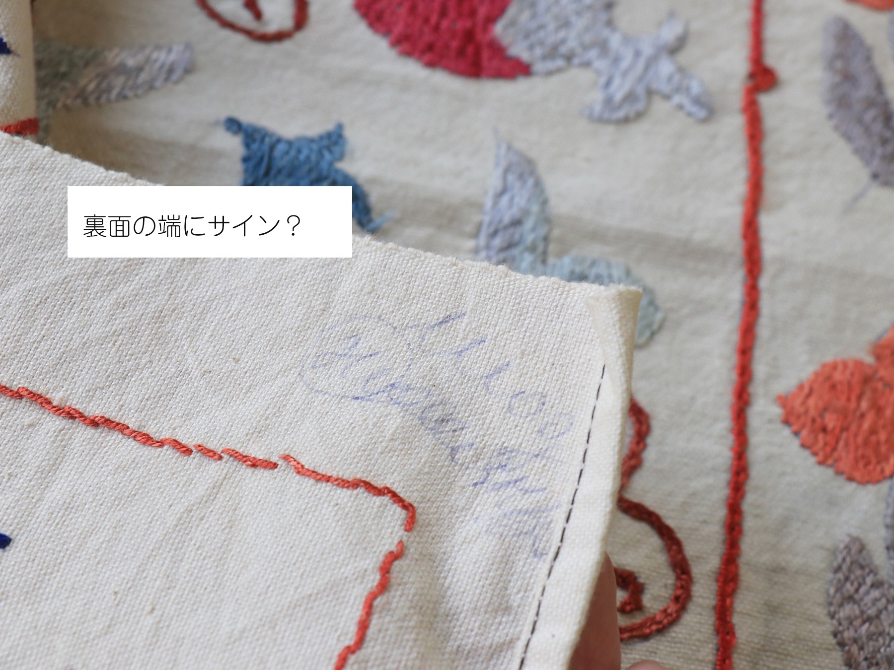 ベースの生地はオフホワイトのコットン地です。裏面の角にボールペンでサインのような文字のあとがあります。裏布はなし。