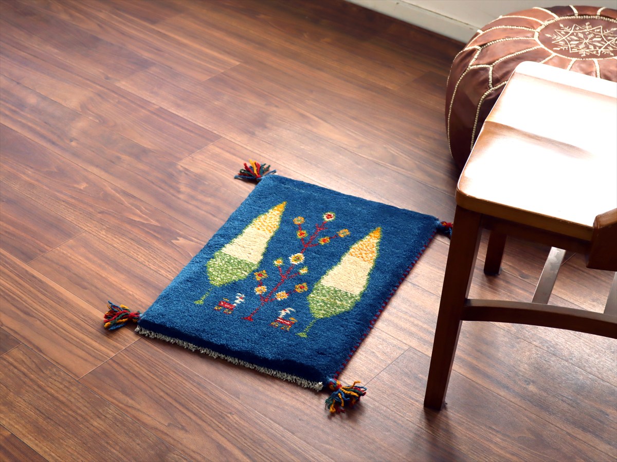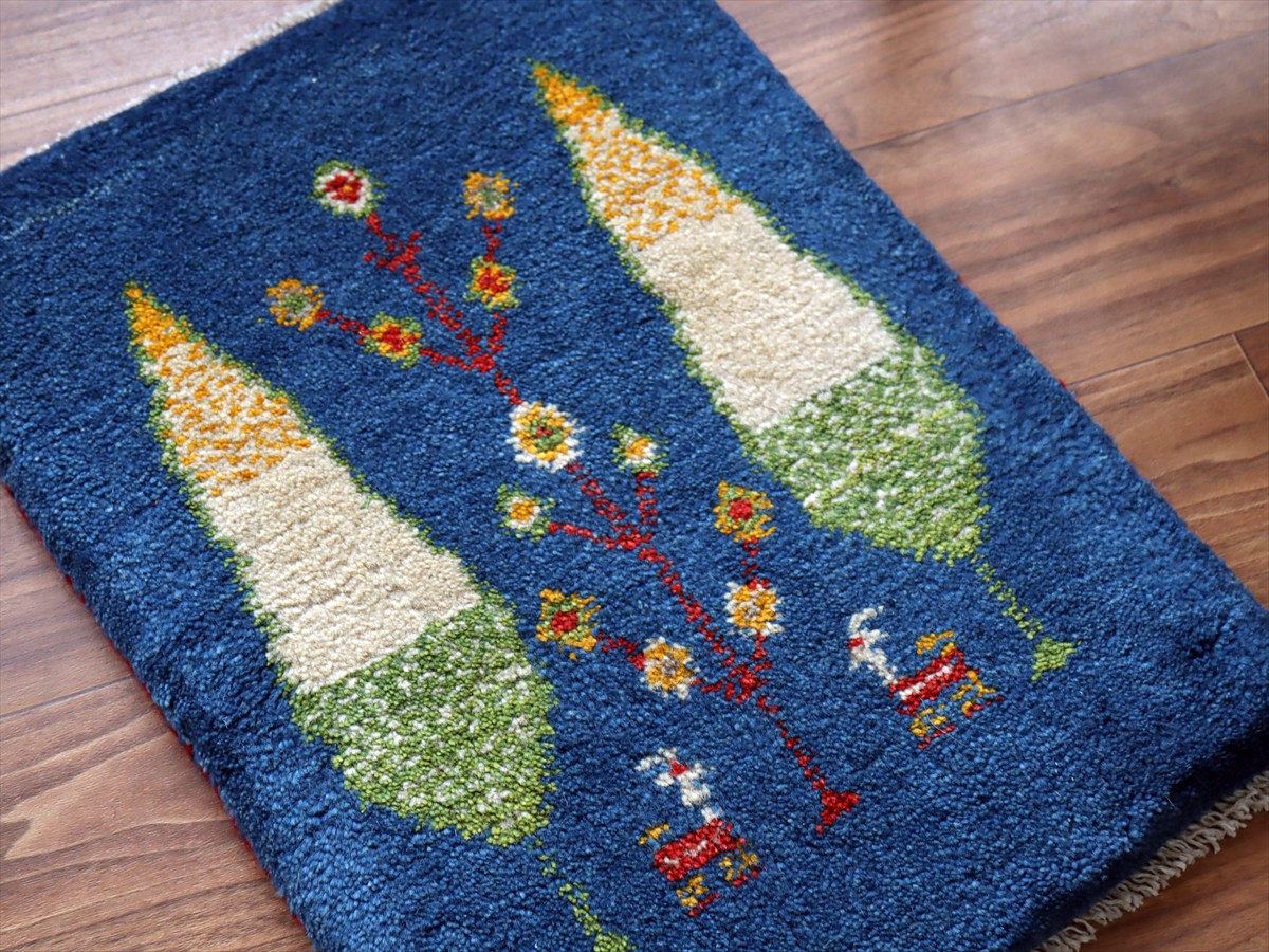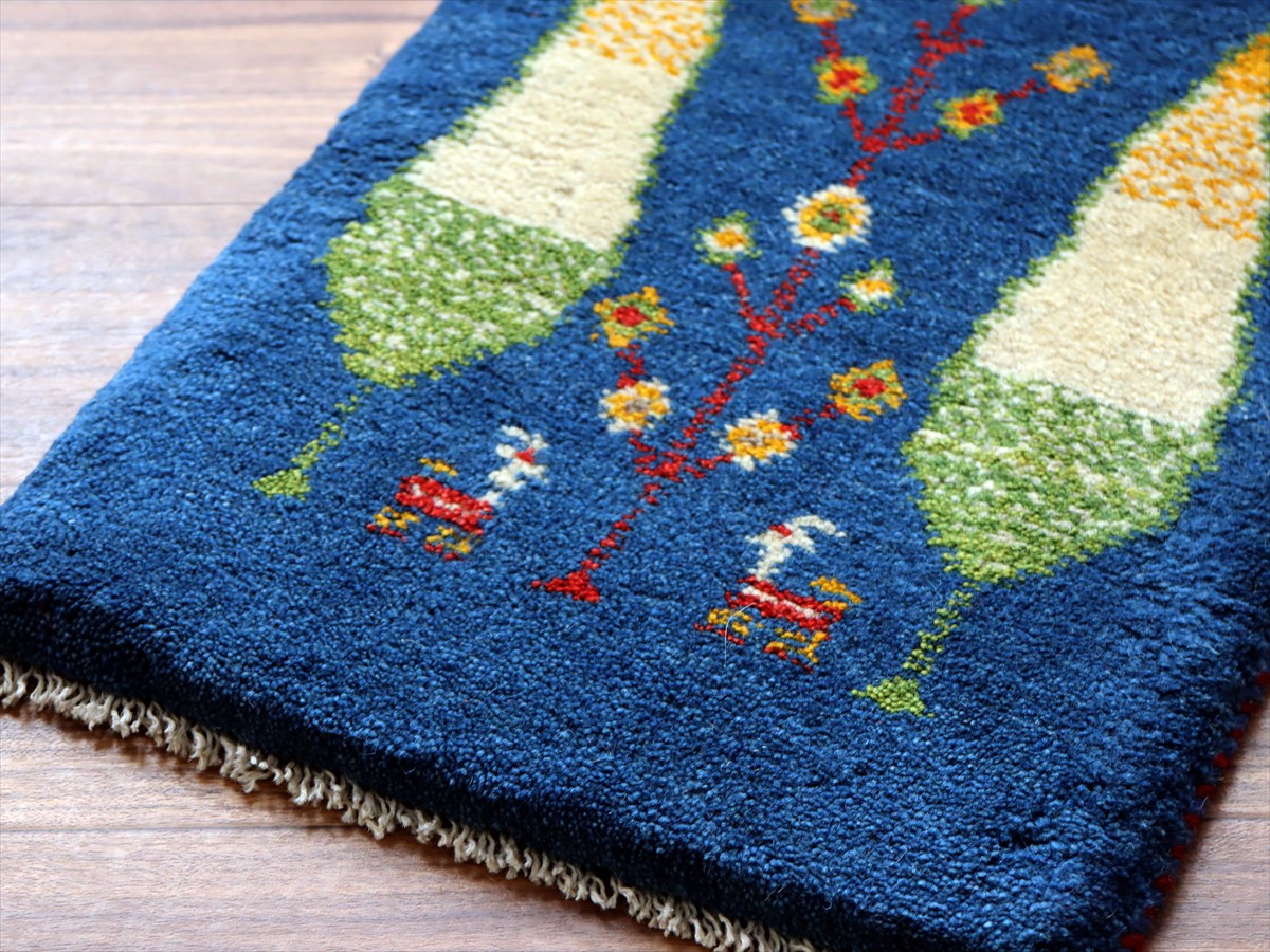 明るいブルーのベースは色ムラによる自然なグラデーションができています。糸杉は長寿を願う意味を持っていて、ギャベでは多用されるモチーフのひとつです。
