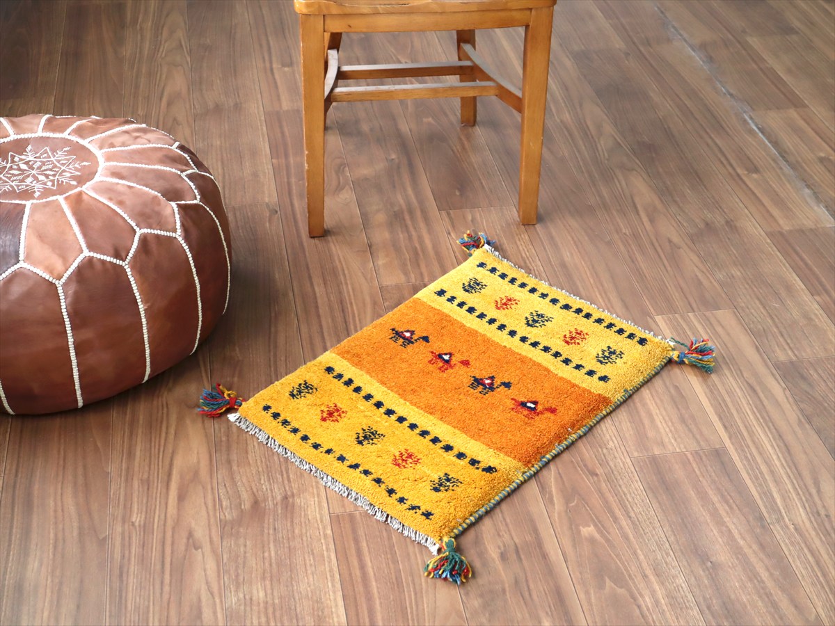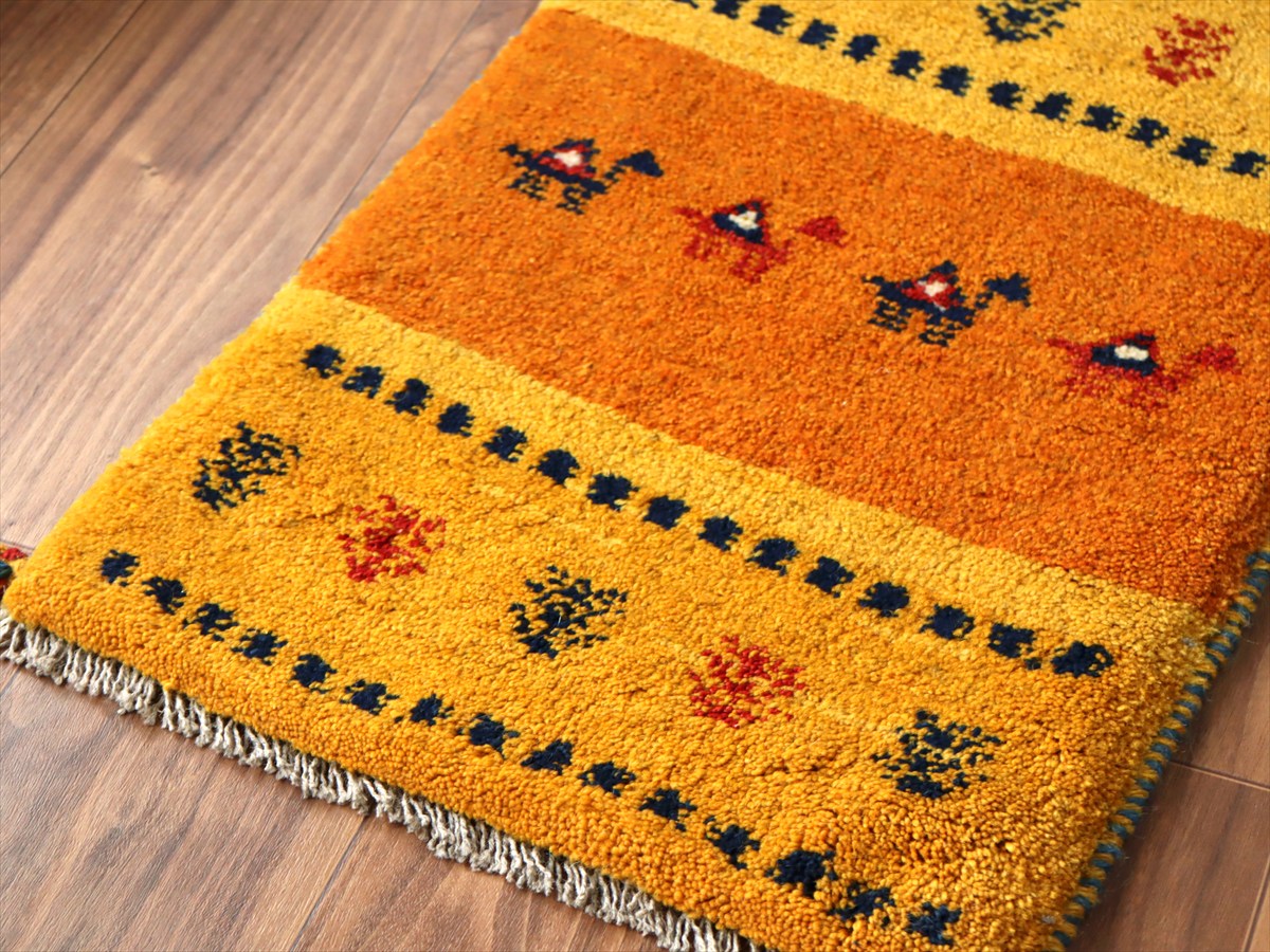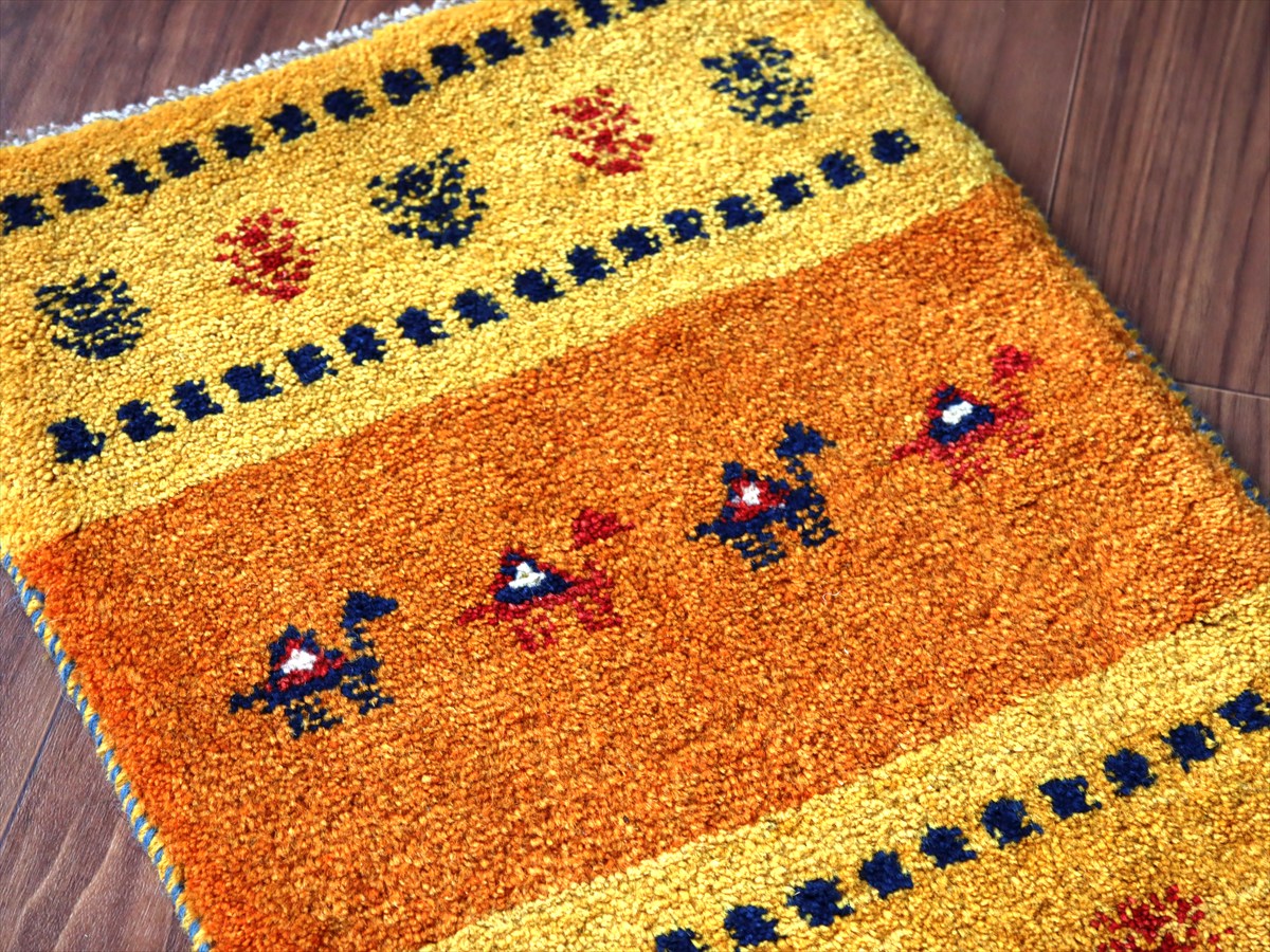 座布団サイズのギャッベとしては、すっきりとした毛足の刈り込みで、モチーフがくっきりと見えます。パイルを含めたギャベの厚みは、1.7-1.8cm程度です。