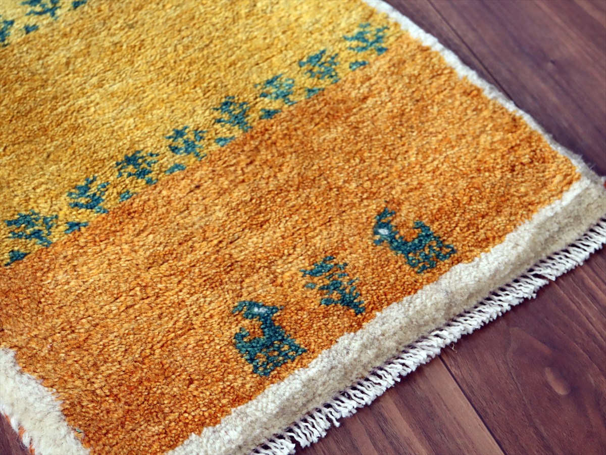 ザクロの実の皮などで染めた発色の良い明るいイエローとオレンジをベースに、生命の樹と動物モチーフが織られています。
