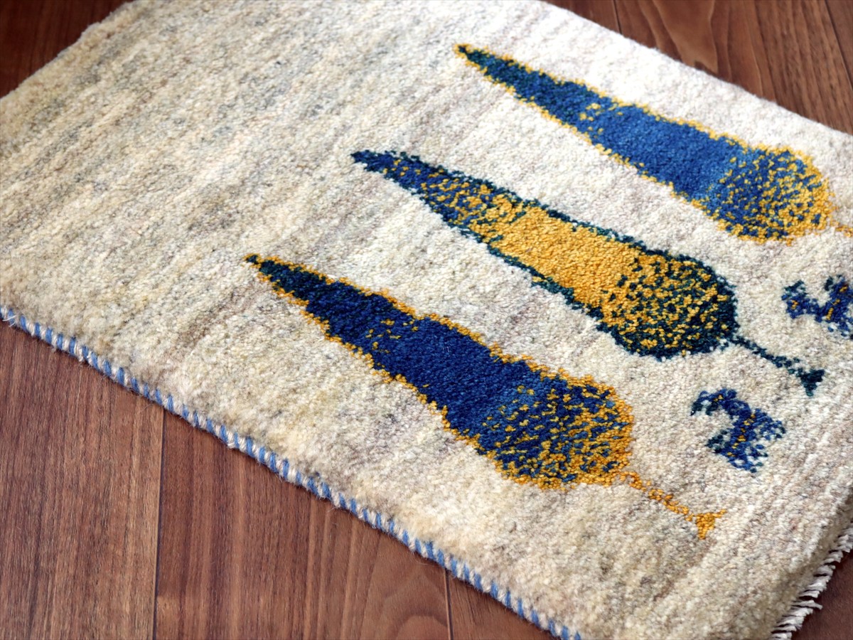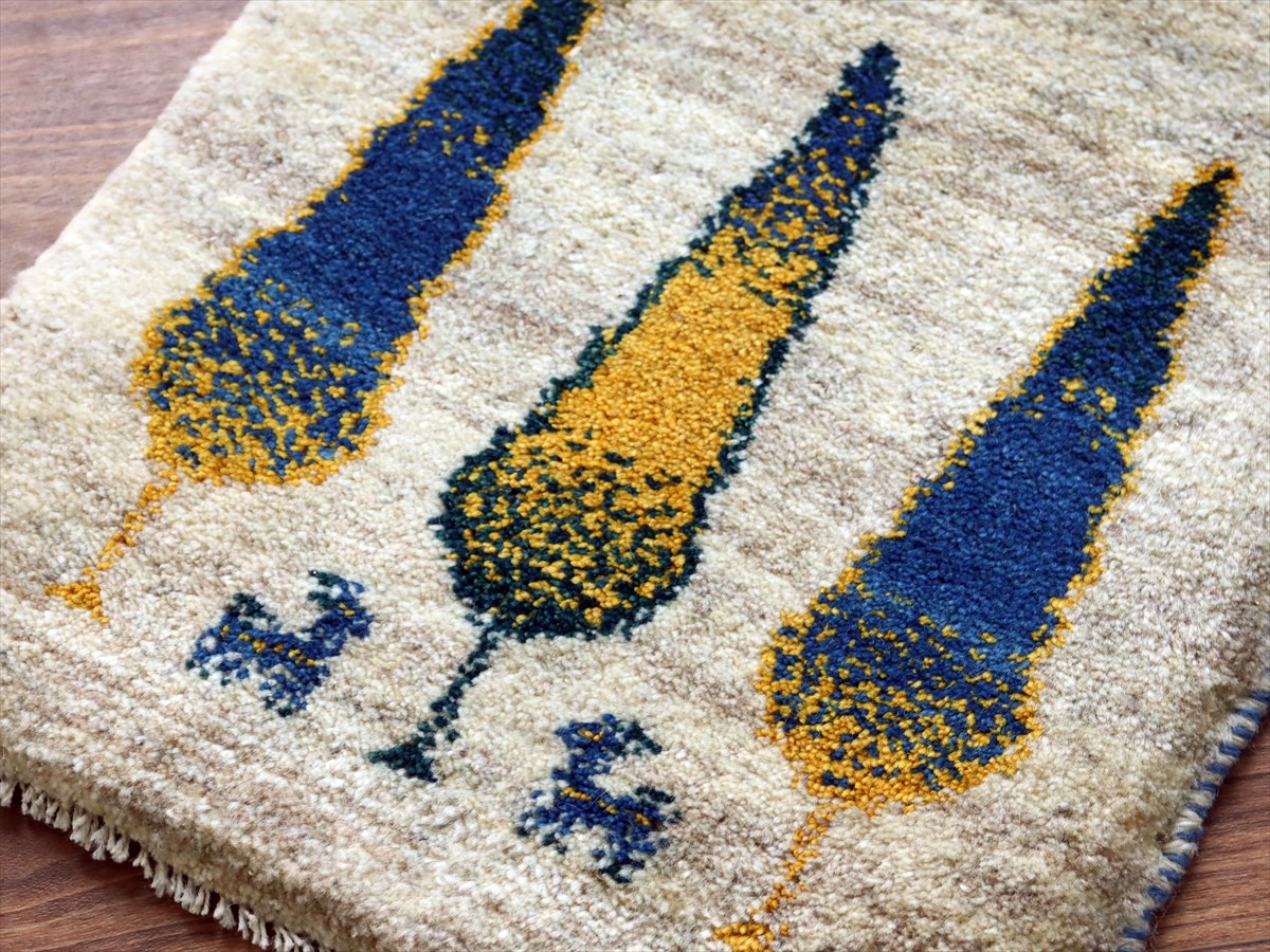 座布団サイズのギャッベとしては、すっきりとした毛足の刈り込みで、モチーフがくっきりと見えます。パイルを含めたギャベの厚みは、1.7-1.8cm程度です。