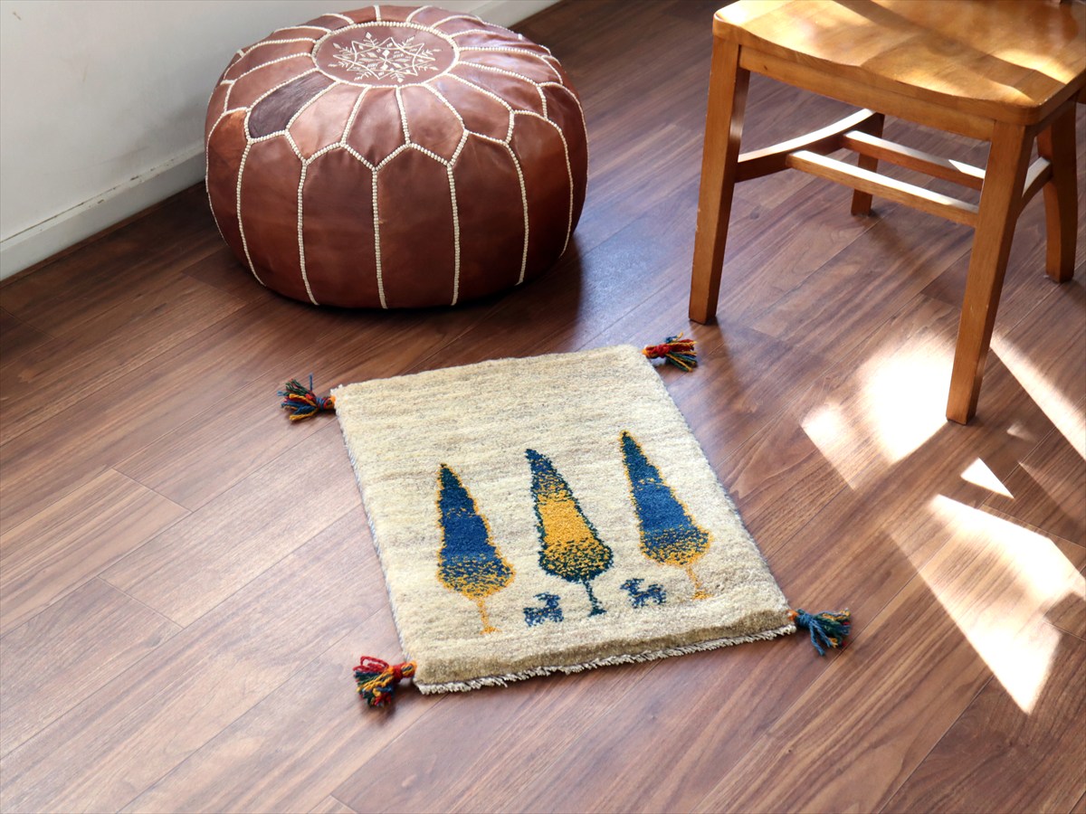 天然の羊毛の色をそのまま使ったアイボリーのギャッベ。ところどころグレーやベージュの毛糸も混ざっています。糸杉は長寿を願う意味を持っていて、ギャベでは多用されるモチーフのひとつです。